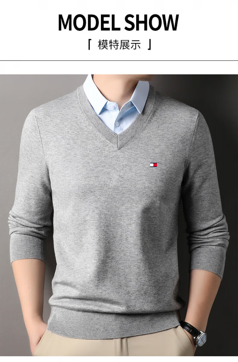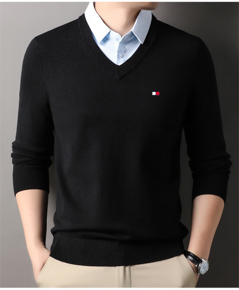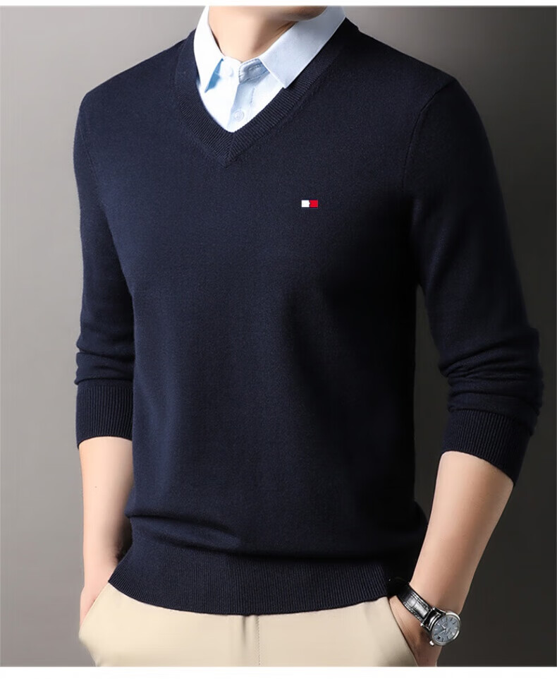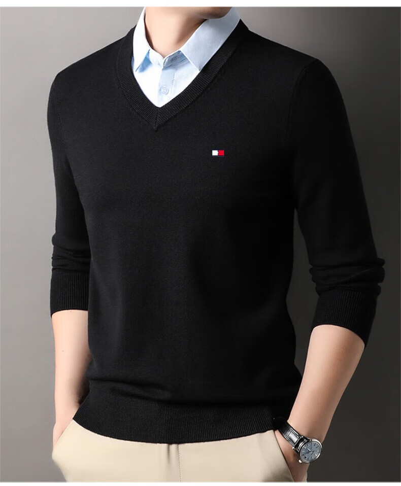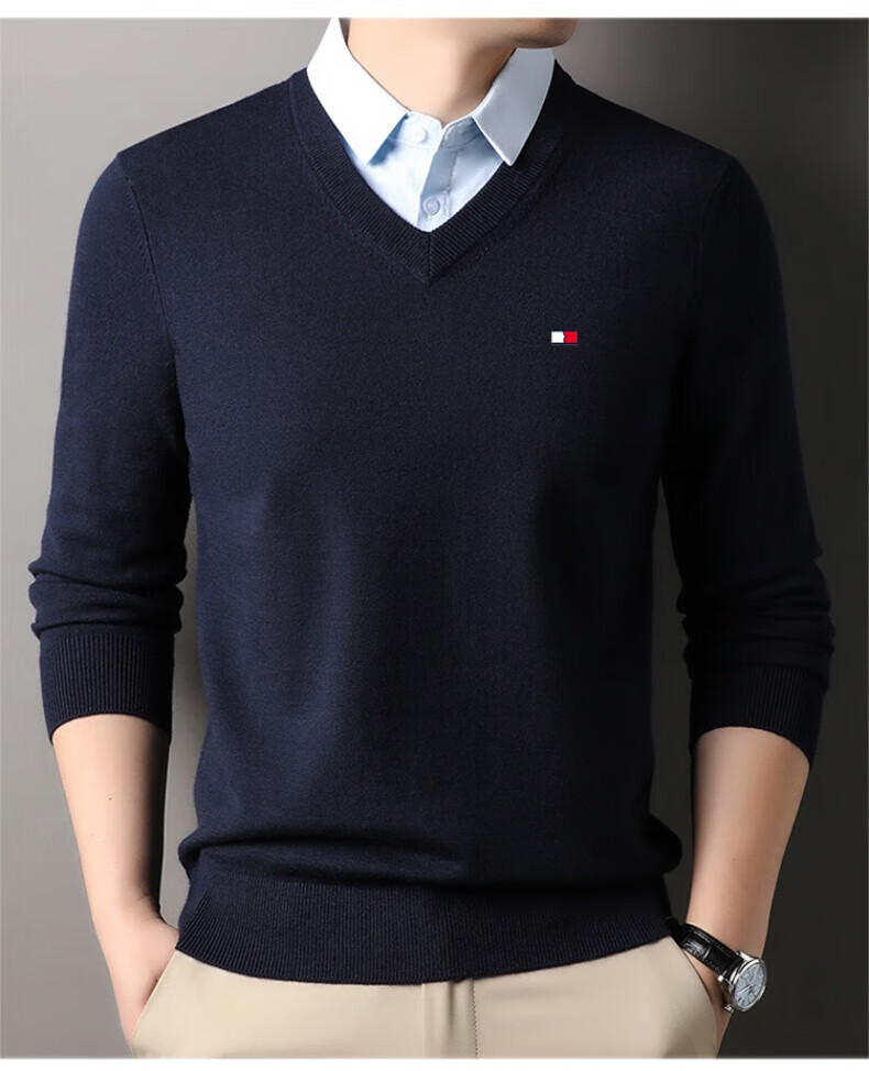 TOME BORNEK American Tommy Autumn and Winter Cardigan Men's Fake Two-Piece V-neck Sweater Warm Thickened Business Shirt Sweater Navy XL 115 (recommended 140-160Jin Jin equals 0.5 kg)