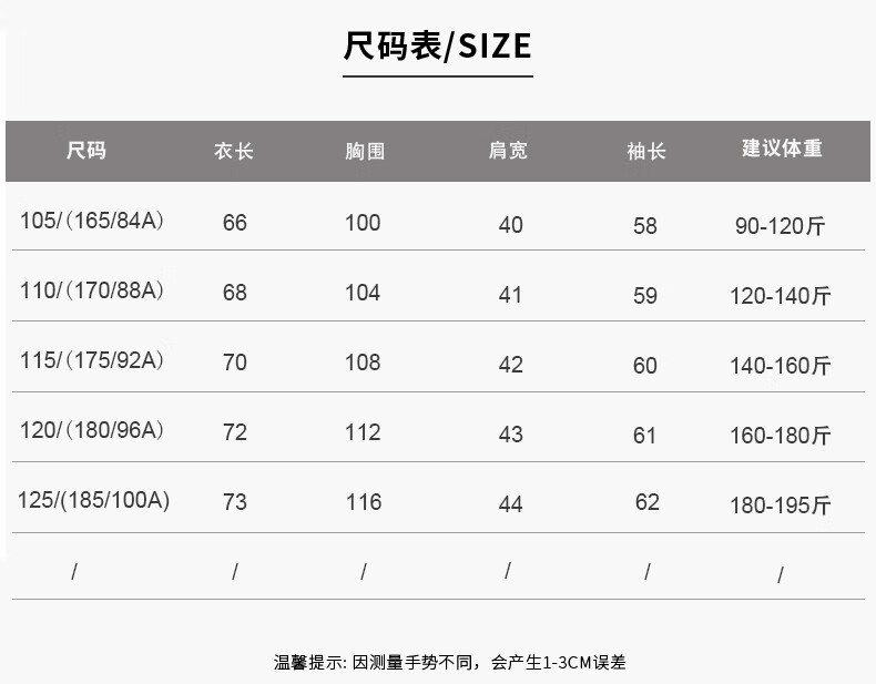 China (cm) 165 / 88-90 170 / 96-98 175 / 108-110 180 / 118-122 185 / 126-130