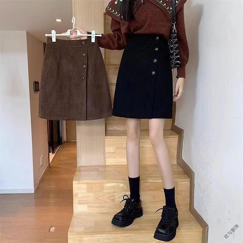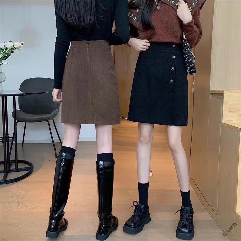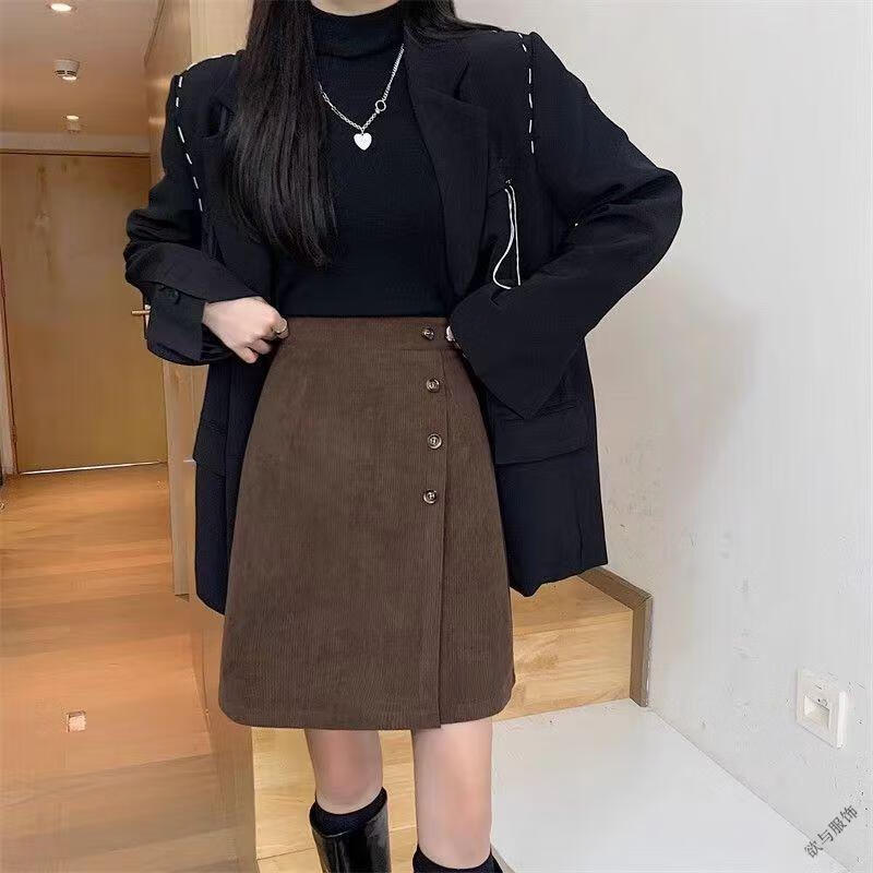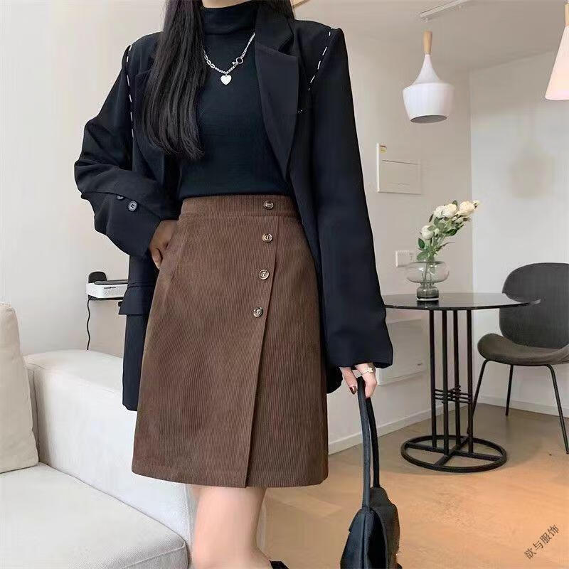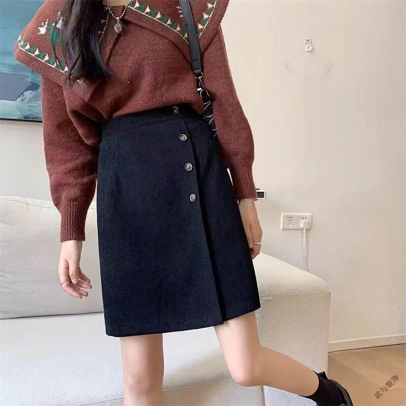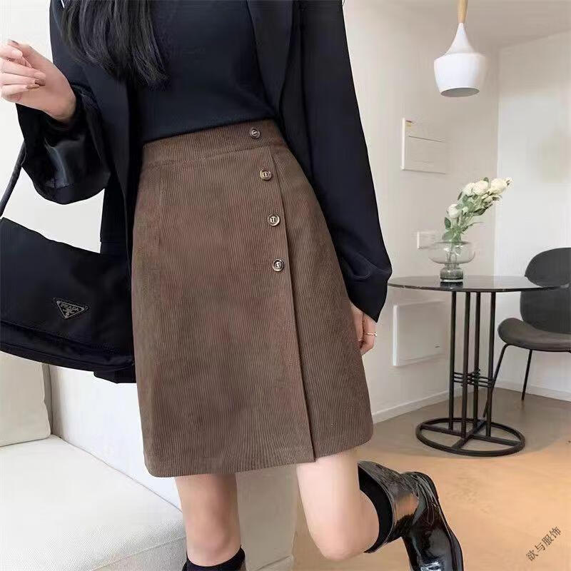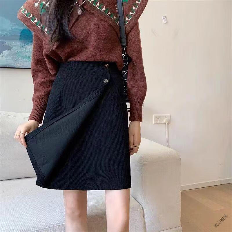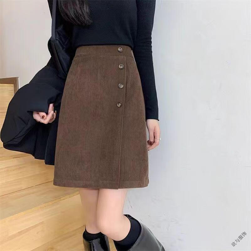Pierre Cardin Large Size Corduroy Skirt Autumn and Winter Women's High Waist Irregular Mid Skirt Fat mm Slimming Belly Covering A-Line Skirt Short Skirt Brown M Recommended 90-100 Jin Jin equals 0.5 kg