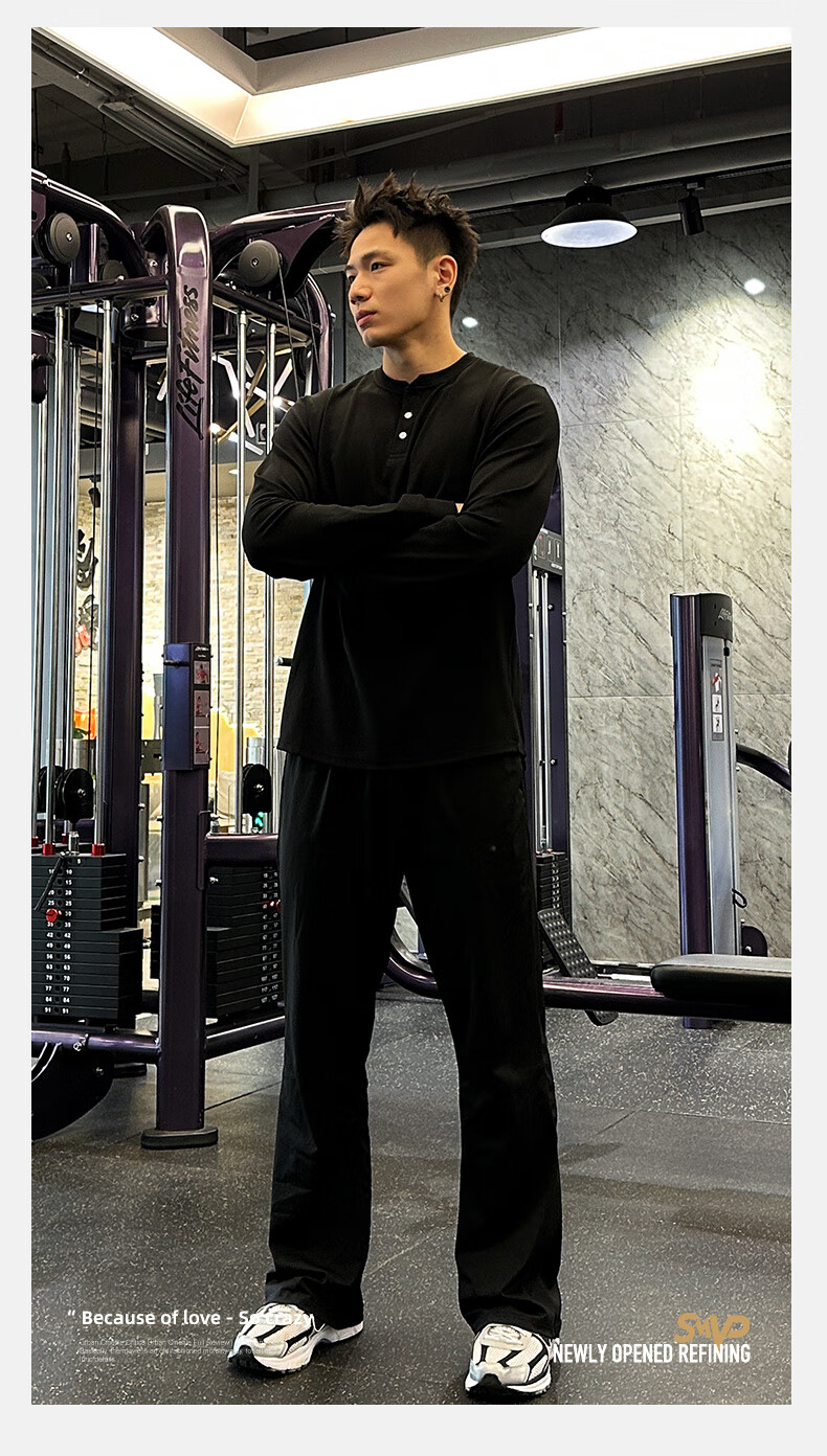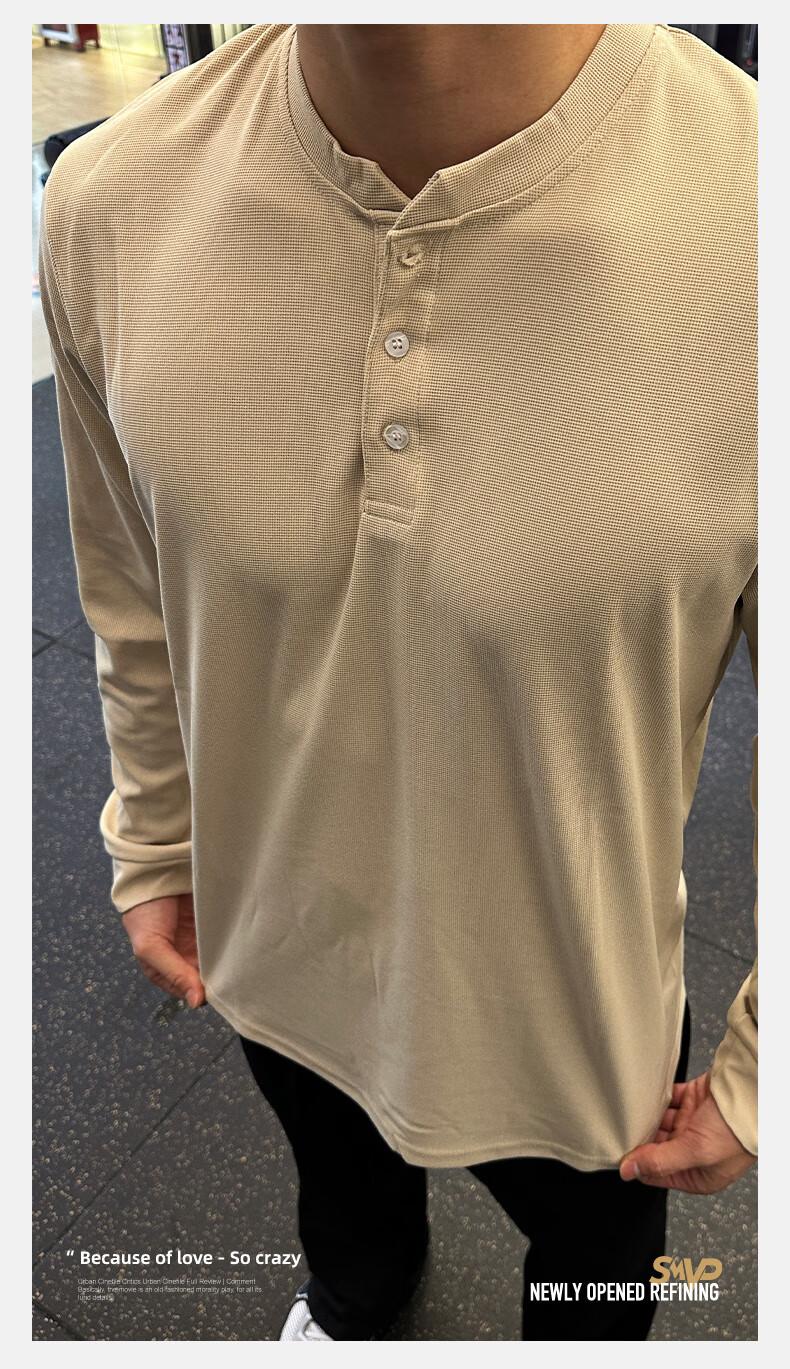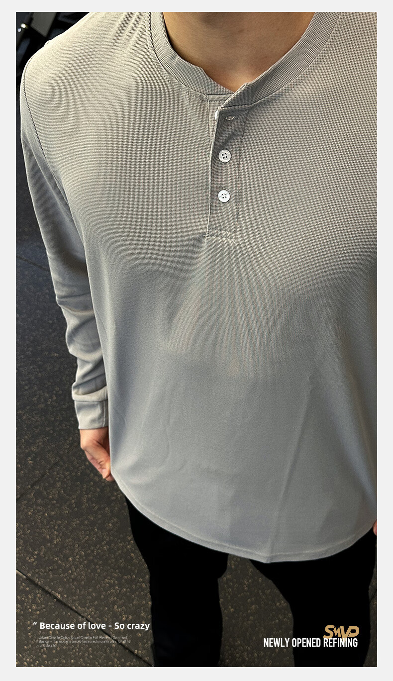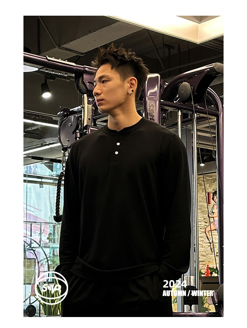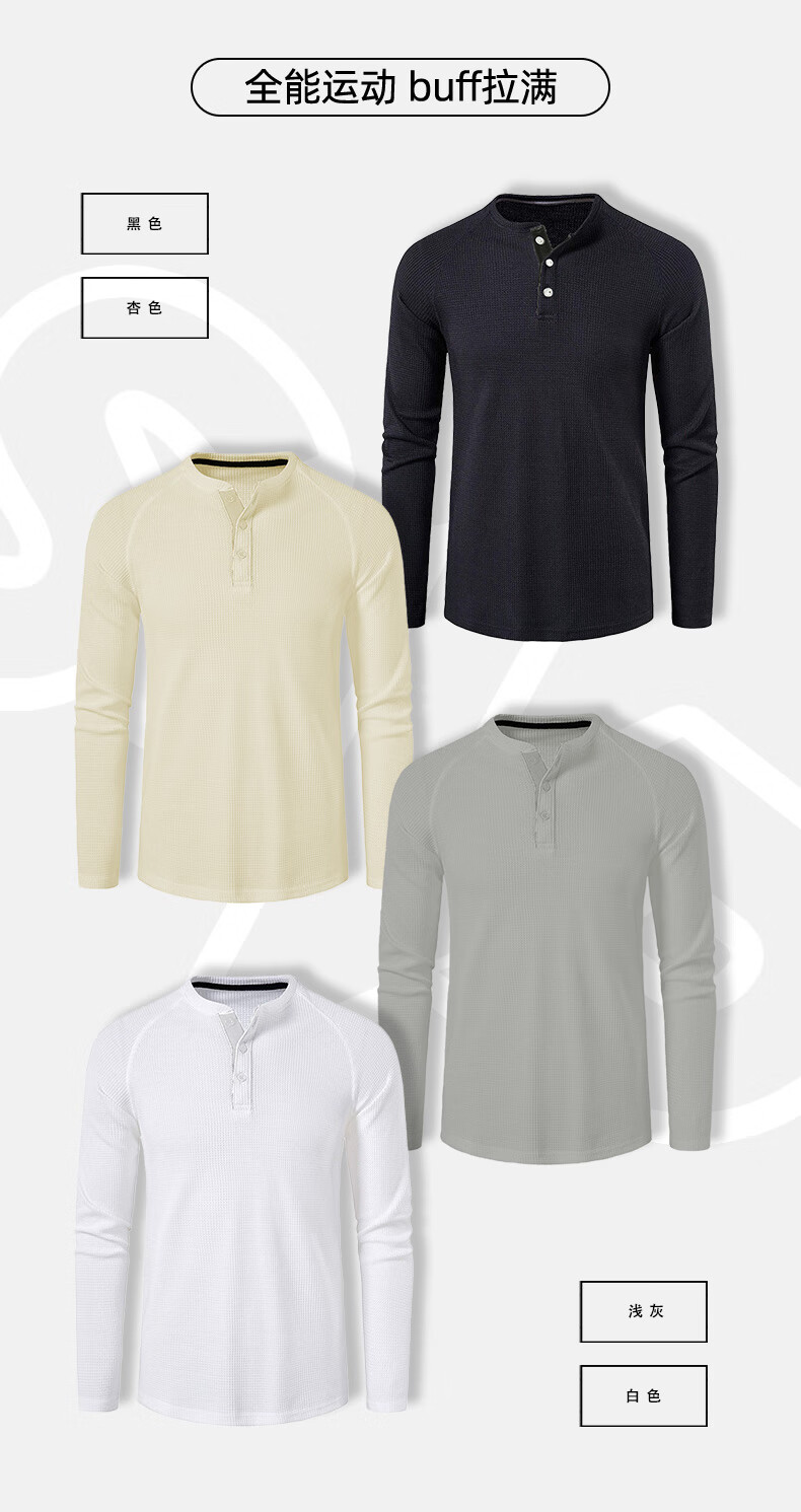 Continued pattern autumn American retro henley collar sweatshirt men's tough guy Ami khaki running fitness quick-drying shirt long sleeve waffle henley shirt long sleeve 9155-black L