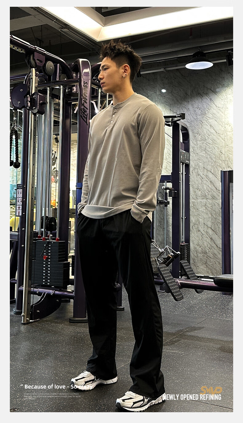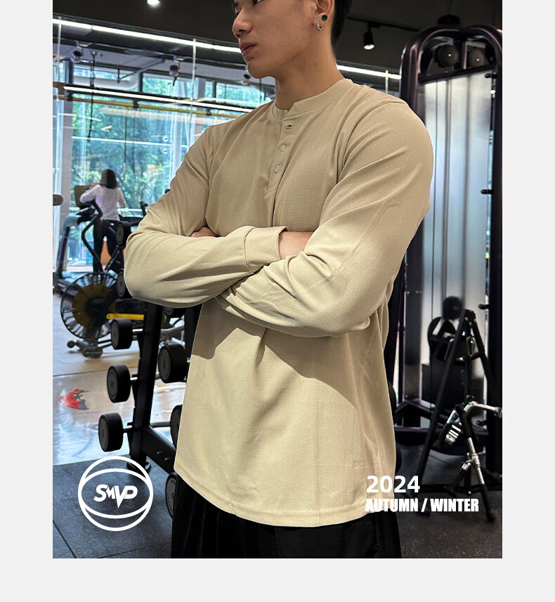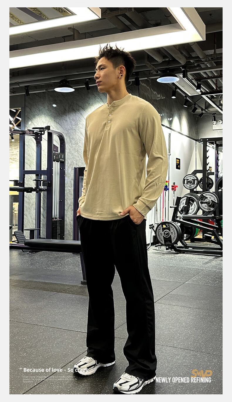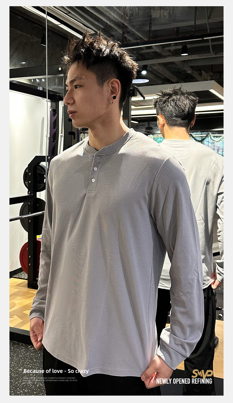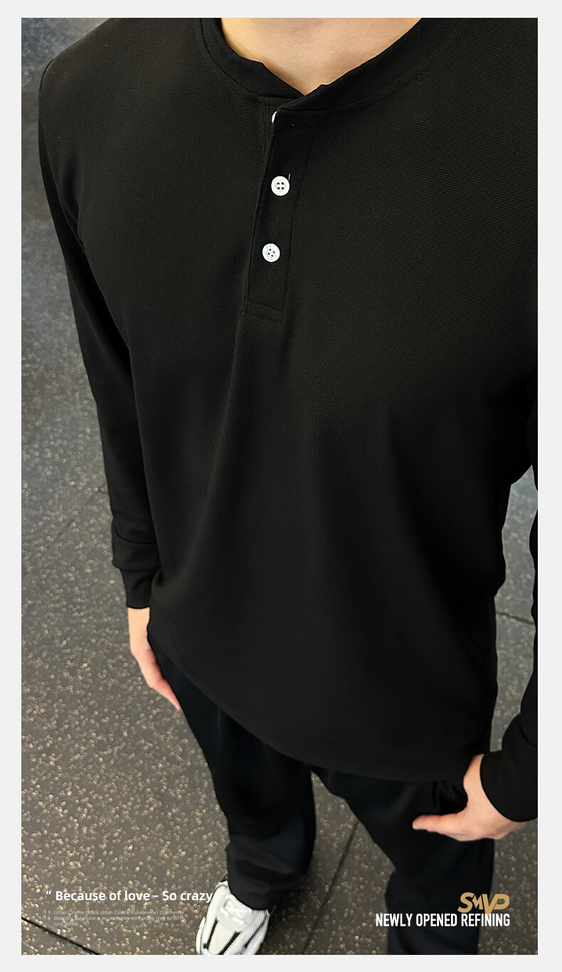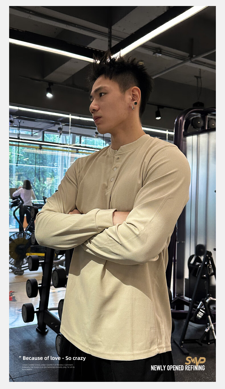 Continued pattern autumn American retro henley collar sweatshirt men's tough guy Ami khaki running fitness quick-drying shirt long sleeve waffle henley shirt long sleeve 9155-black L