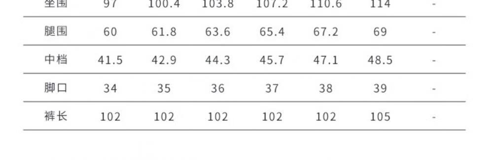 Outseam (cm) 99 cm 101.5 cm 104 cm 106.5 cm 109 cm