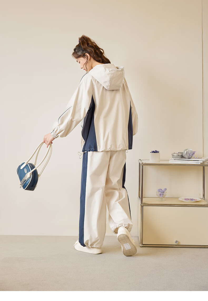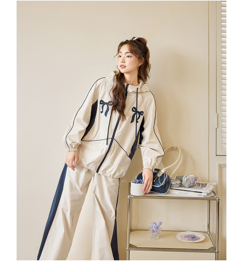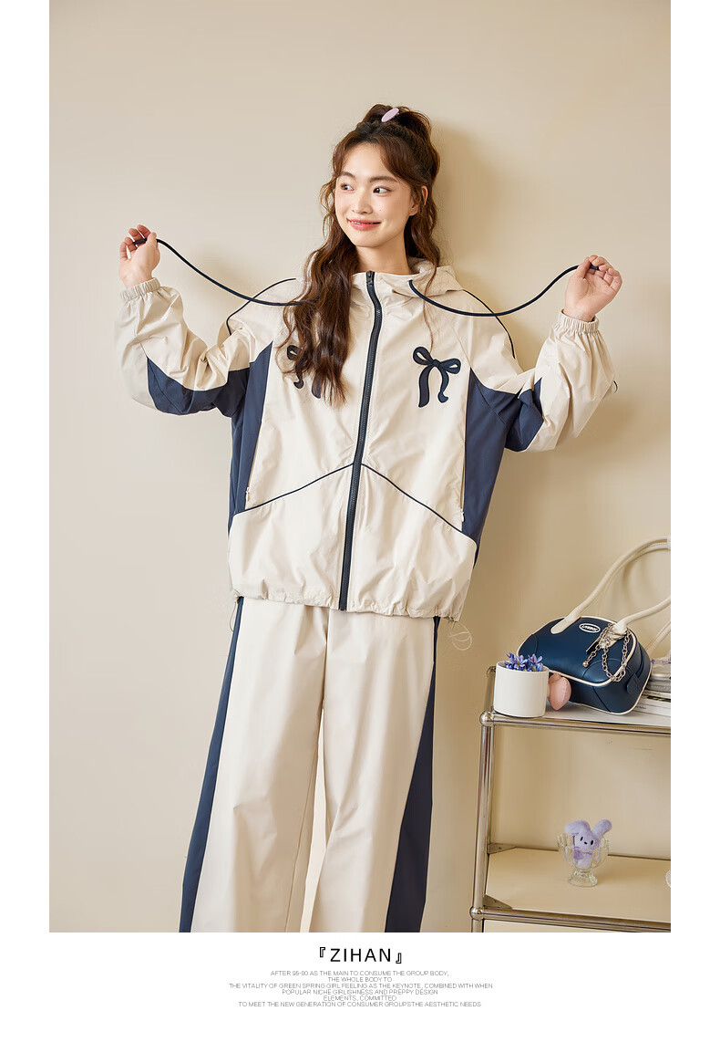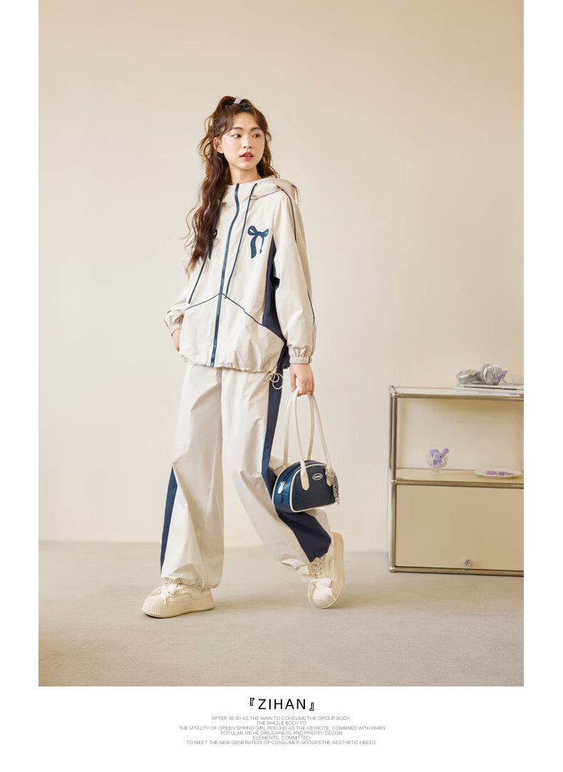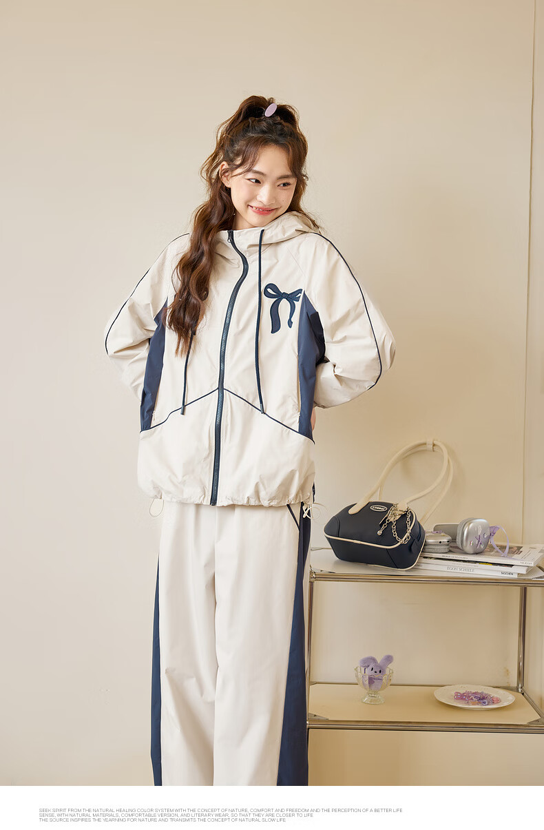 Zihan (ZIHAN) Zihan Bow Contrast Color Splicing Hooded Jacket Wide Leg Casual Pants Two-piece Suit Women's 2025 Spring New Beige XS