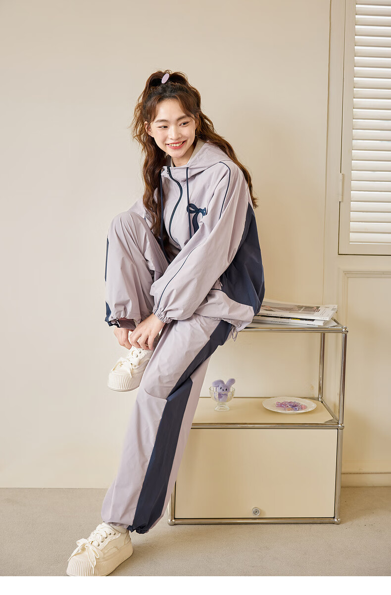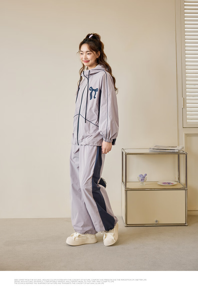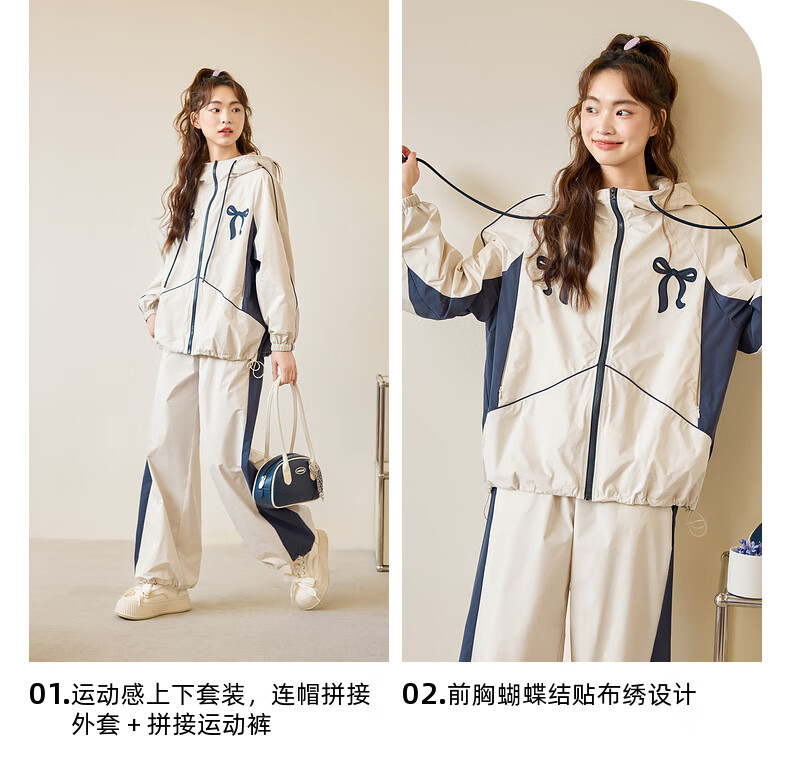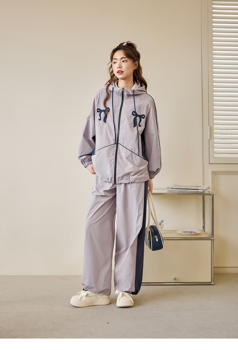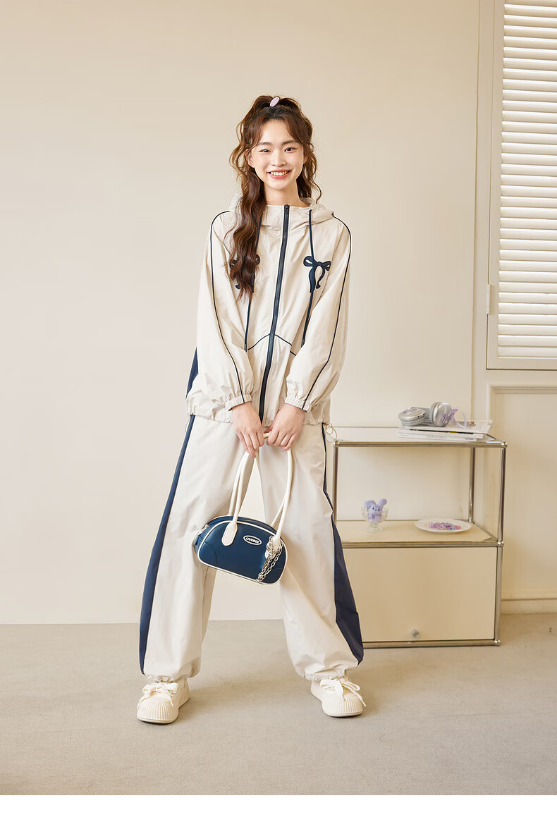 Zihan (ZIHAN) Zihan Bow Contrast Color Splicing Hooded Jacket Wide Leg Casual Pants Two-piece Suit Women's 2025 Spring New Beige XS