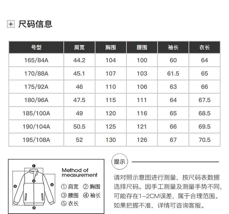 China (cm) 165 / 88-90 170 / 96-98 175 / 108-110 180 / 118-122 185 / 126-130