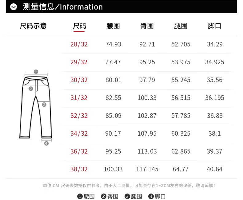 USA(inch) 28-30 30-32 32-34 34-38 38-42