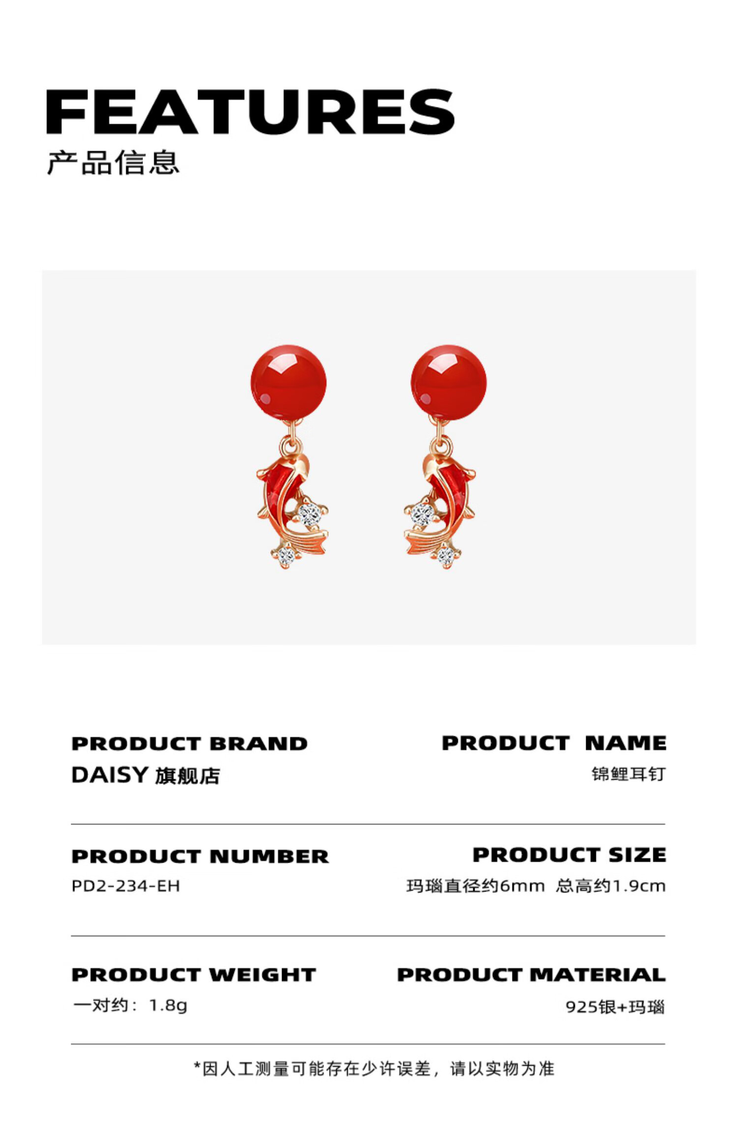 DAISY DREAM925 silver red agate koi earrings for women with pierced ears, zodiac year 2025 retro earrings, new year earrings, koi earrings S925 silver