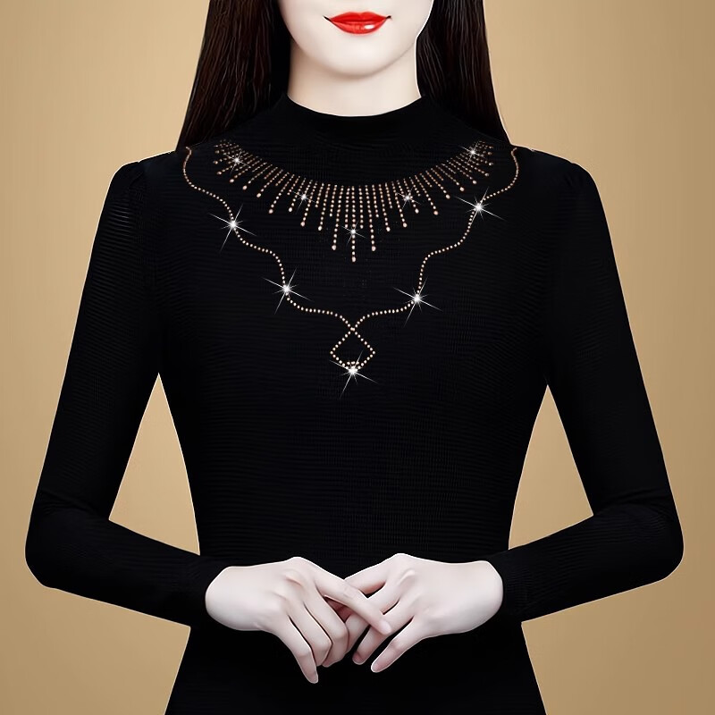 Diamond-encrusted half-turtleneck top for women, German velvet long-sleeved autumn and winter thickened middle-aged mother's wear bottoming shirt with velvet inside 8910 Black Yellow Bright Diamond 2XL Recommended 125-135 Jin Jin equals 0.5 kg