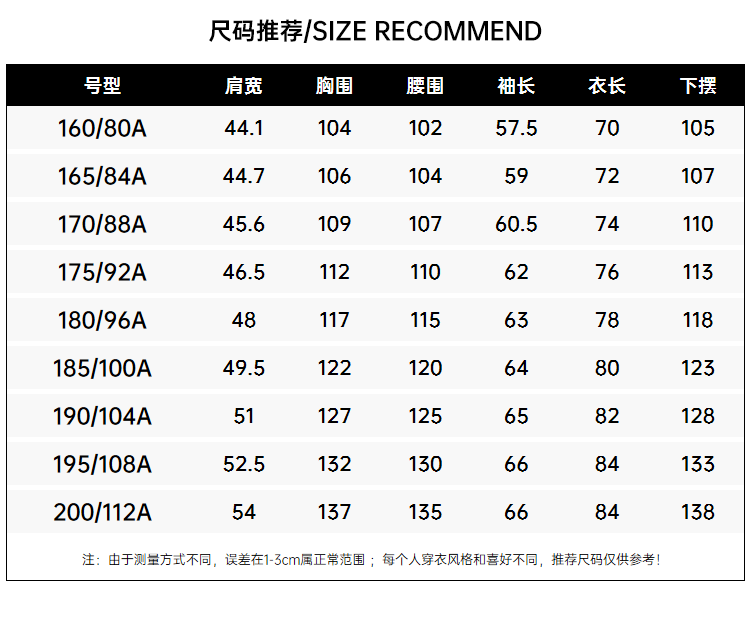 China (cm) 160-165/84-86 165-170 / 88-90 167-172 / 92-96 168-173 / 98-102 170-176 / 106-110