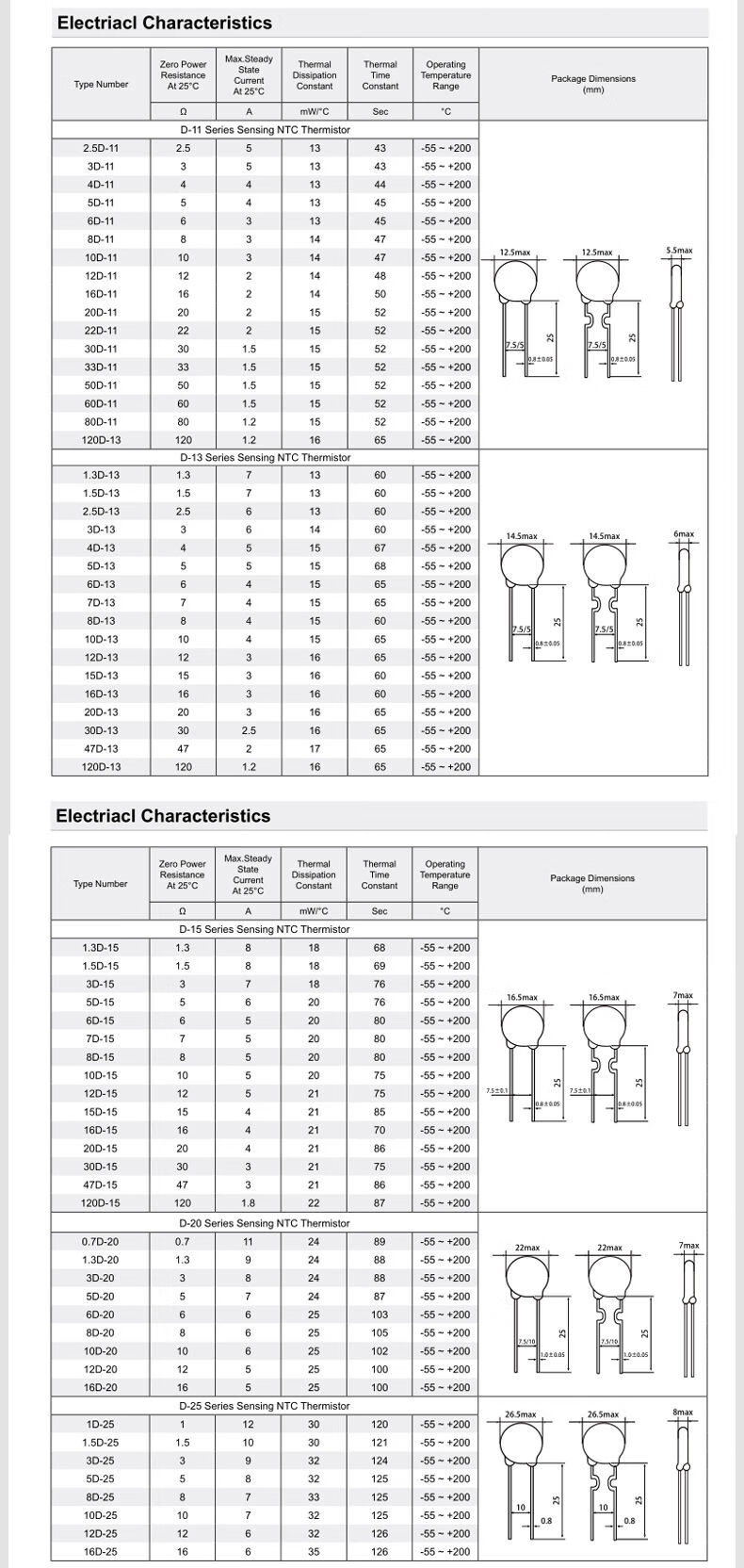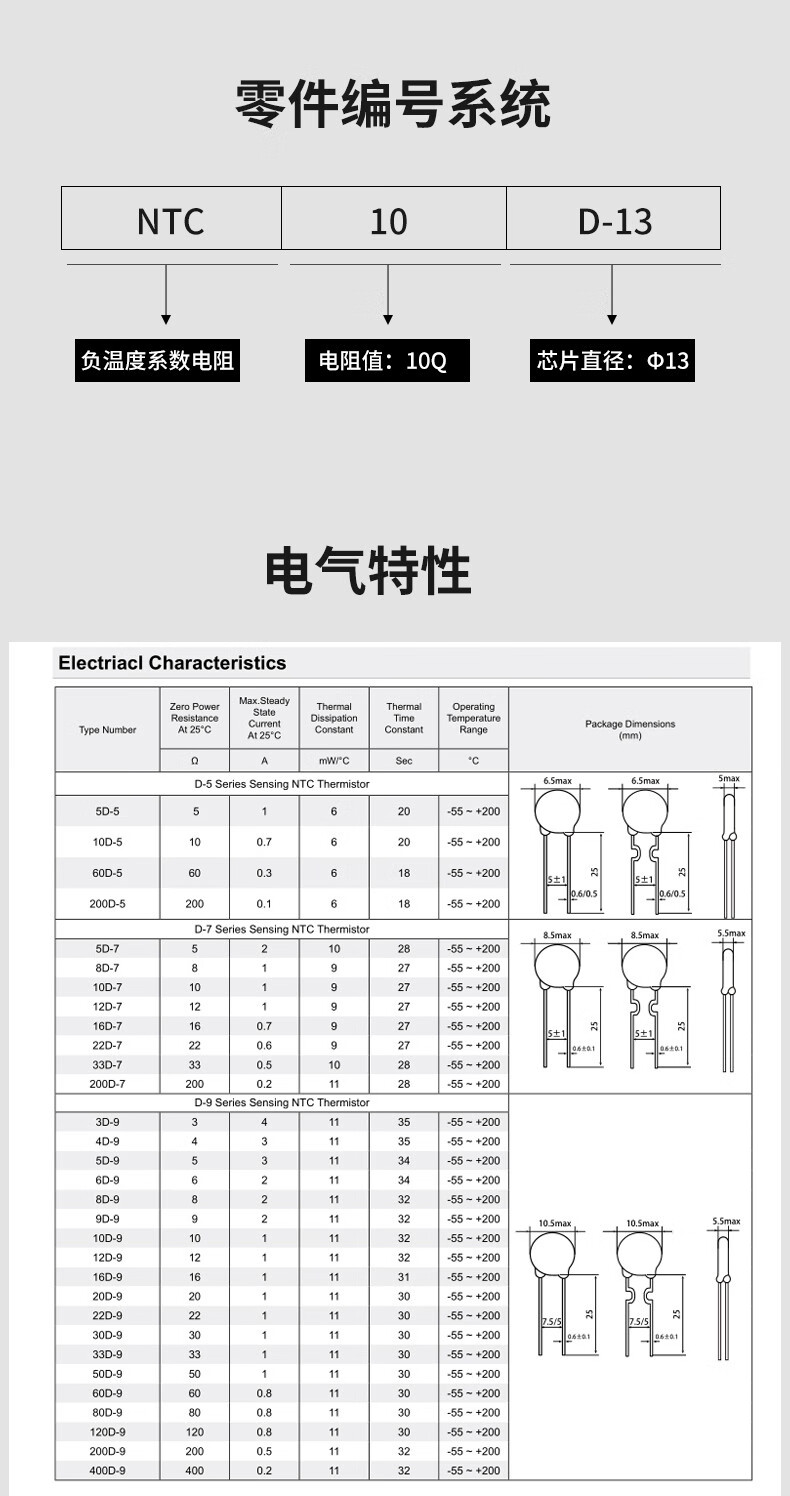 NTC thermistor negative temperature coefficient 3/5/8/10/20/47D-5/7/9/11/13/15/20/25 5D-11 (10 pieces)