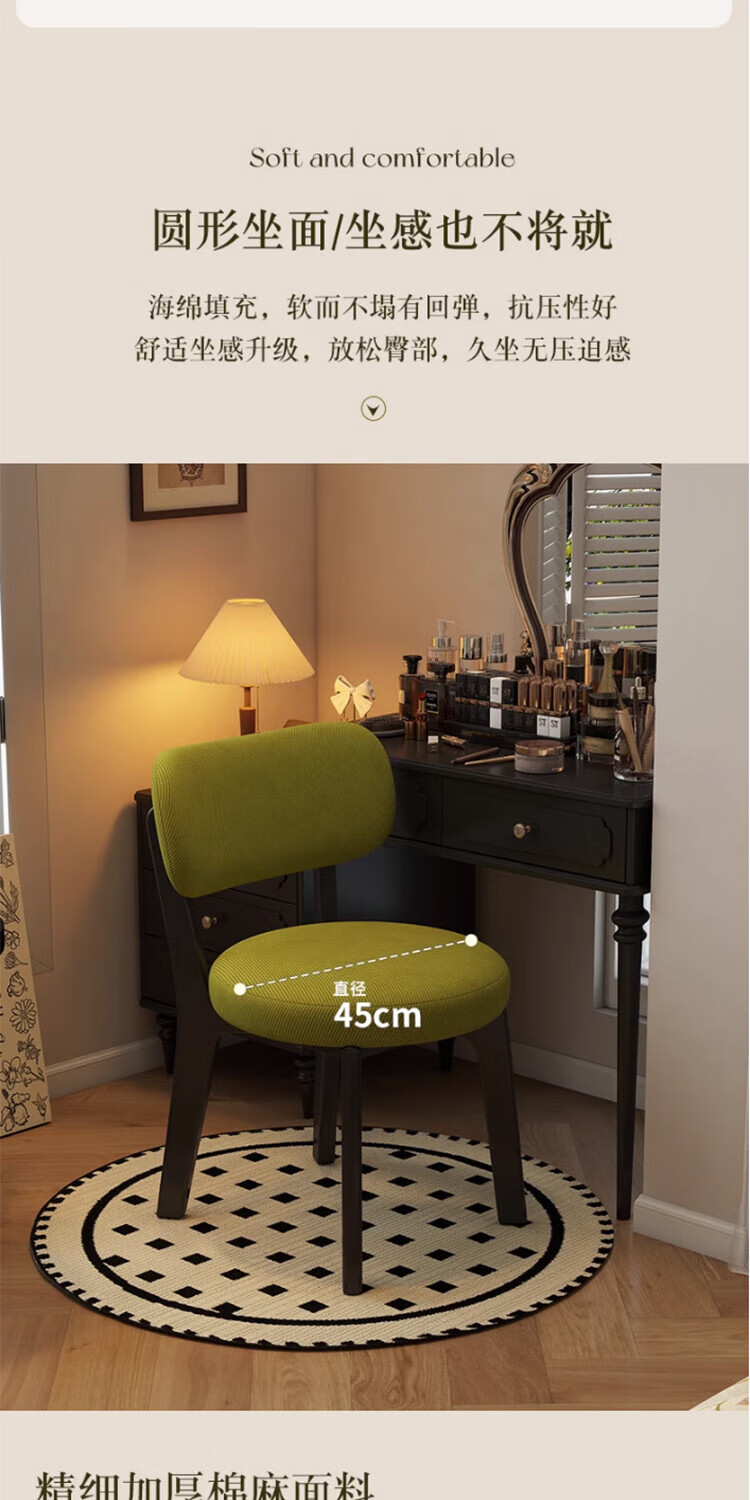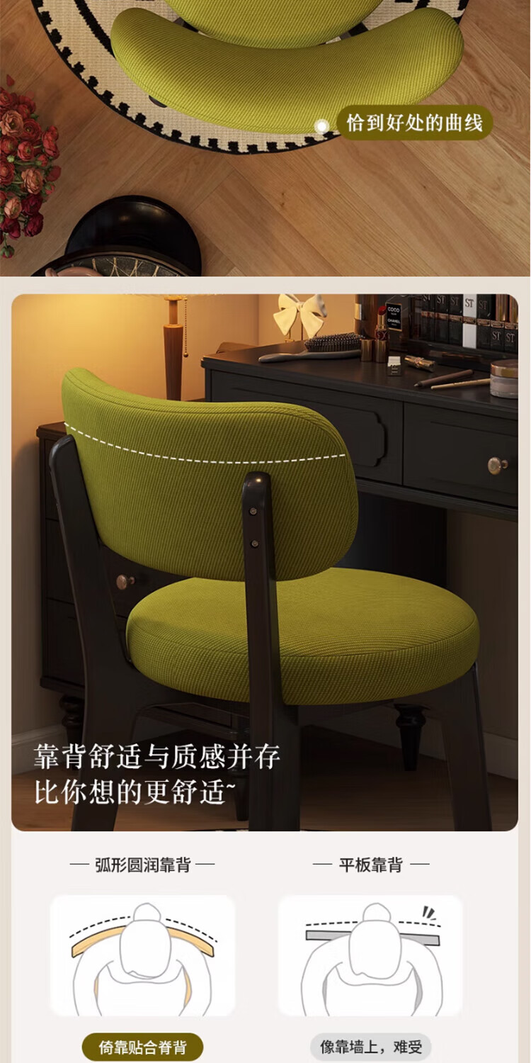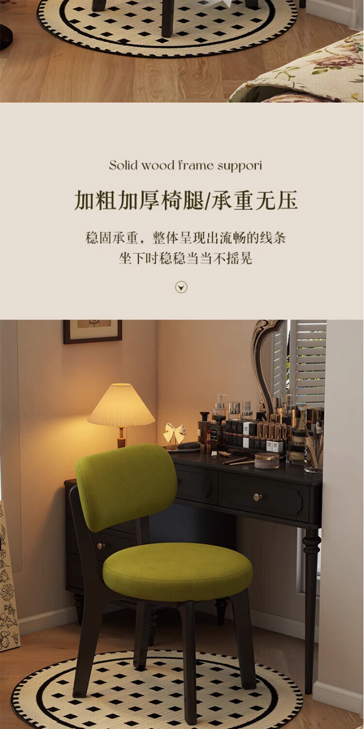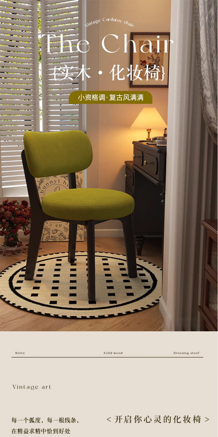 OUJI solid wood second-hand dressing chair, makeup stool, bedroom dressing table, makeup chair, light luxury dressing room, creative dressing stool, grass green cotton and linen + ebony frame