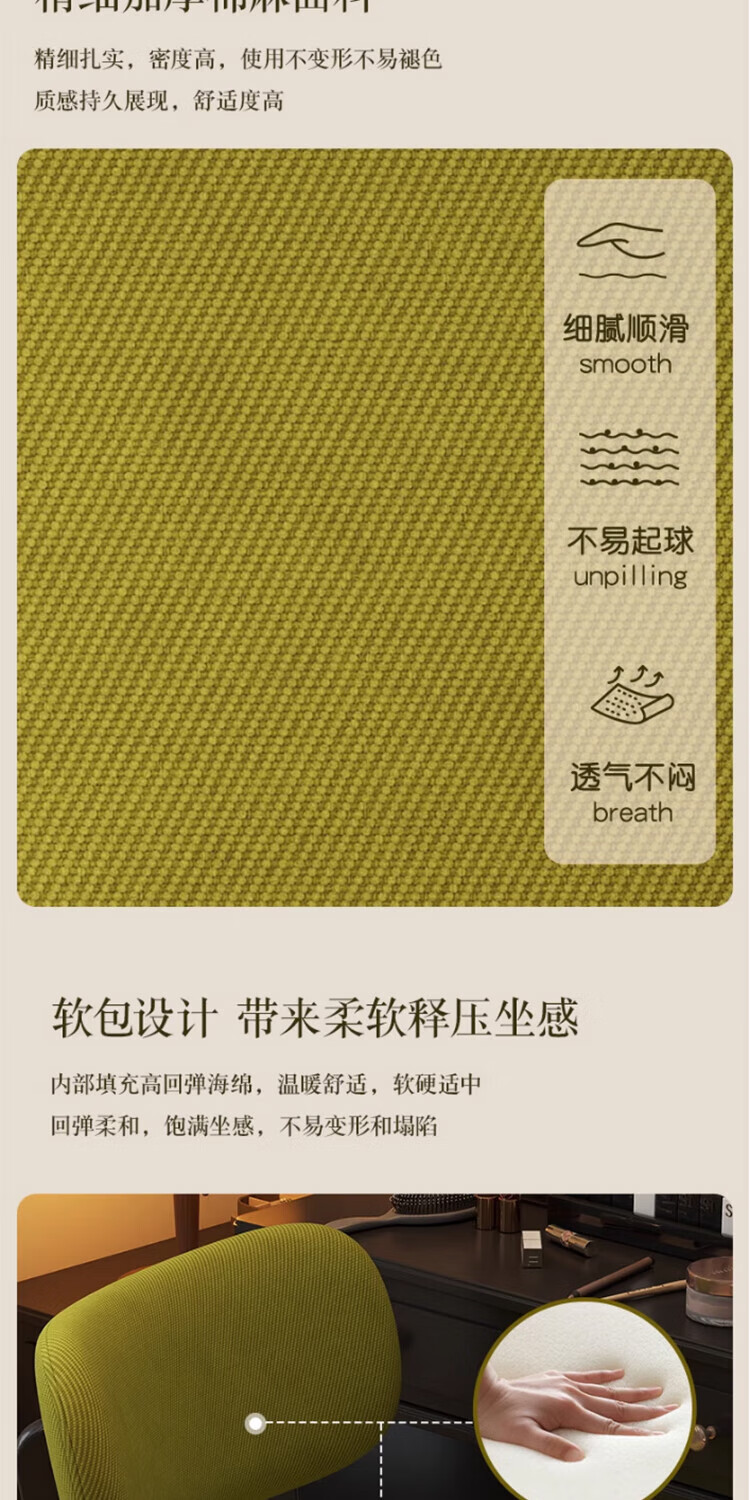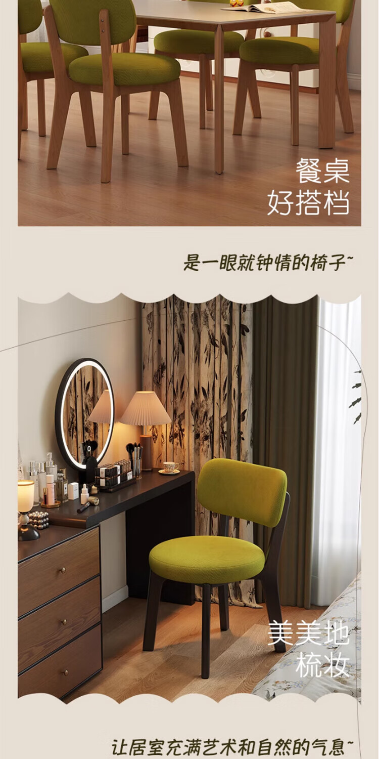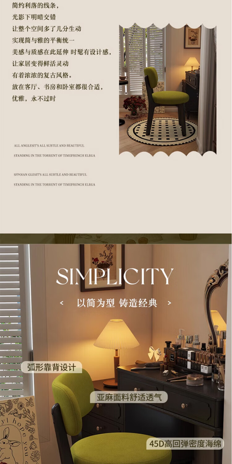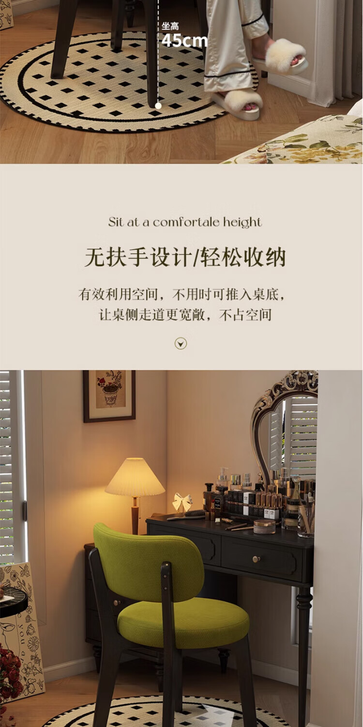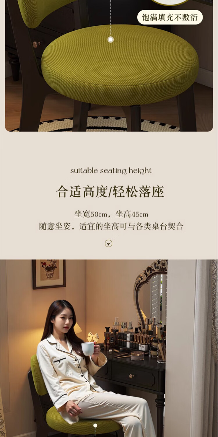 OUJI solid wood second-hand dressing chair, makeup stool, bedroom dressing table, makeup chair, light luxury dressing room, creative dressing stool, grass green cotton and linen + ebony frame