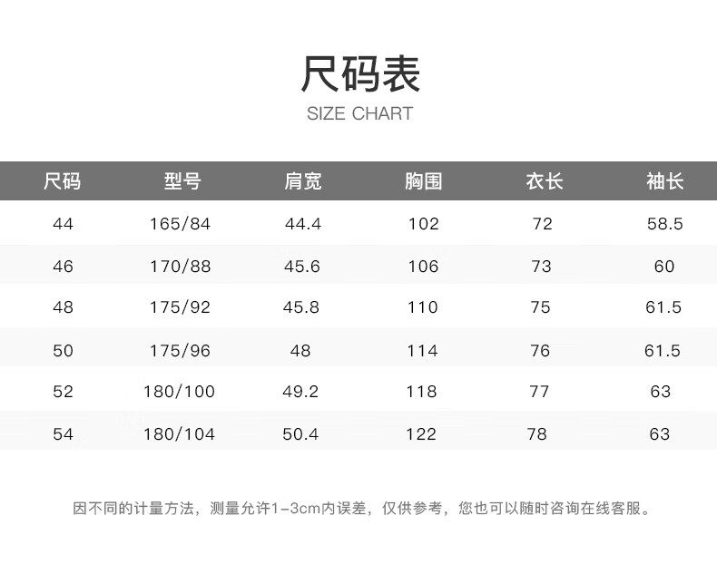 China (cm) 165 / 88-90 170 / 96-98 175 / 108-110 180 / 118-122 185 / 126-130