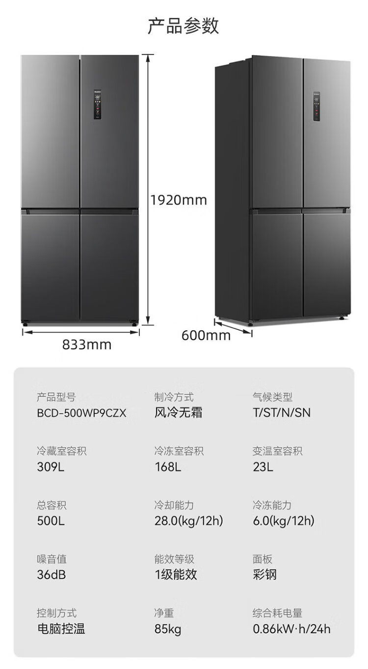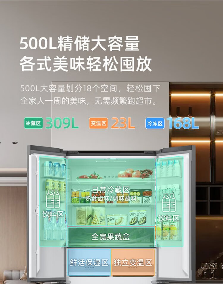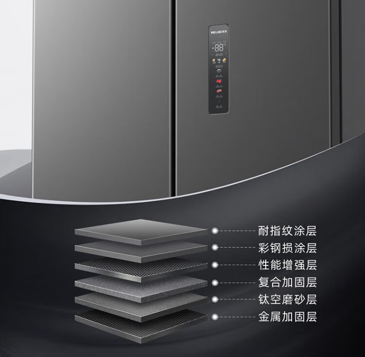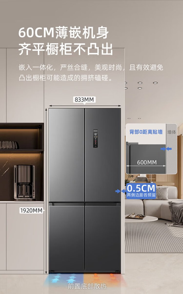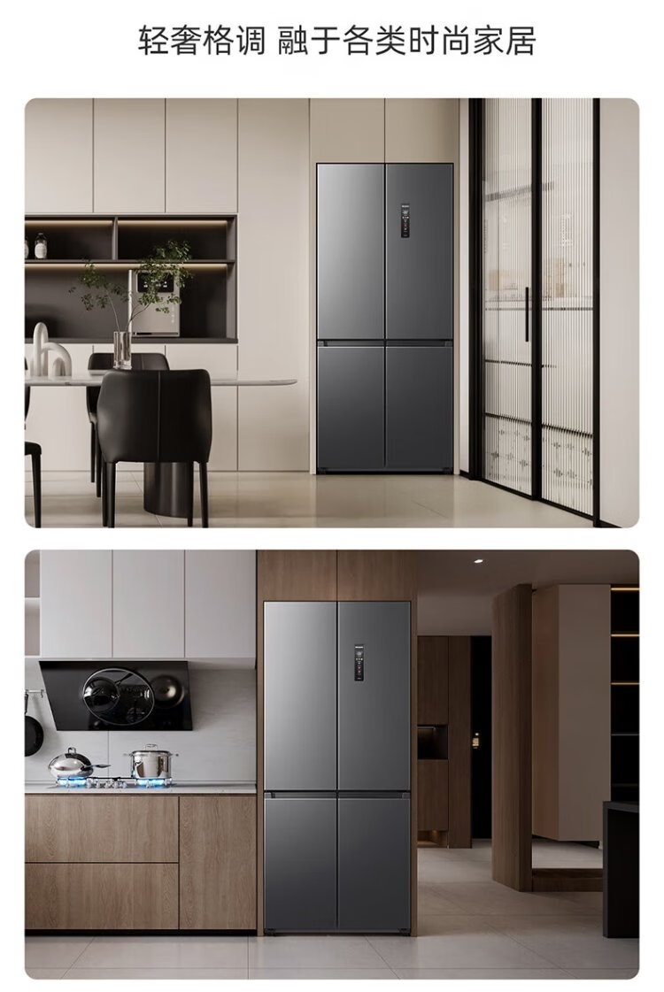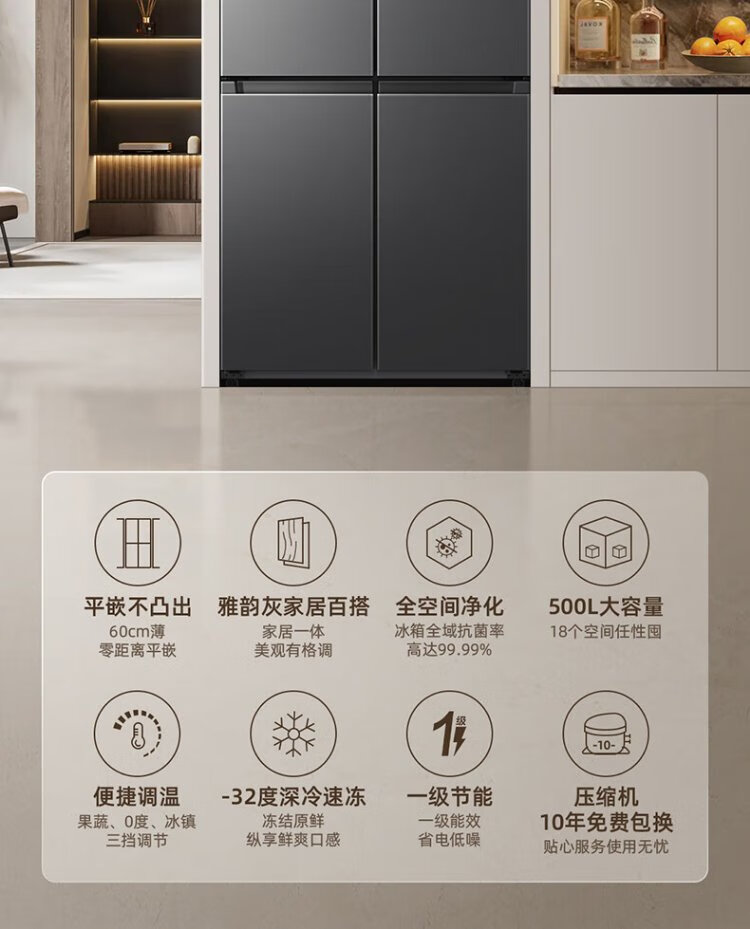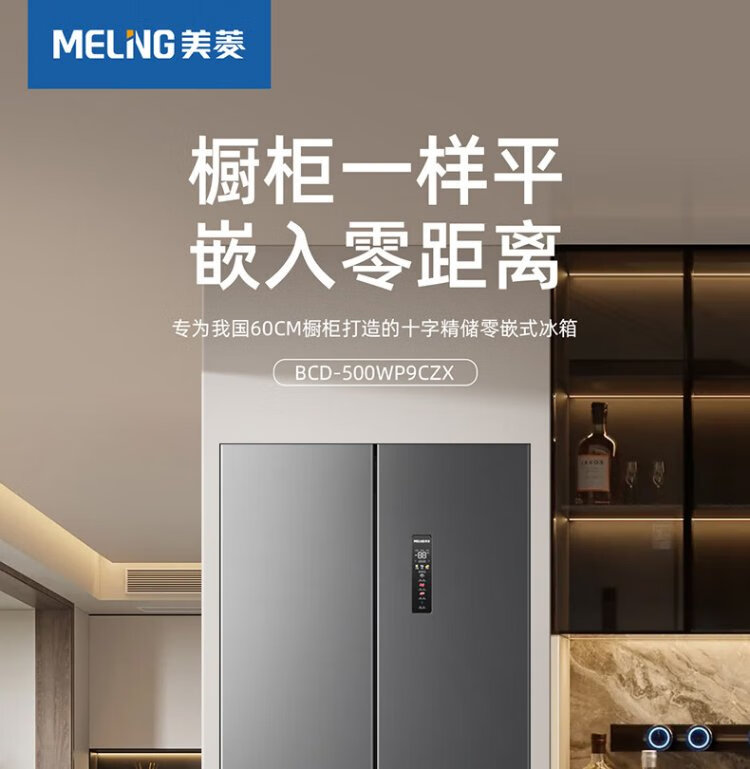 MeiLing worry-free built-in refrigerator 500 liters cross-door four-door household ultra-thin zero-level built-in 60cm first-class energy efficiency air-cooled frost-free large capacity net odor subsidy refrigerator BCD-500WP9CZX-Ya Yun Gray