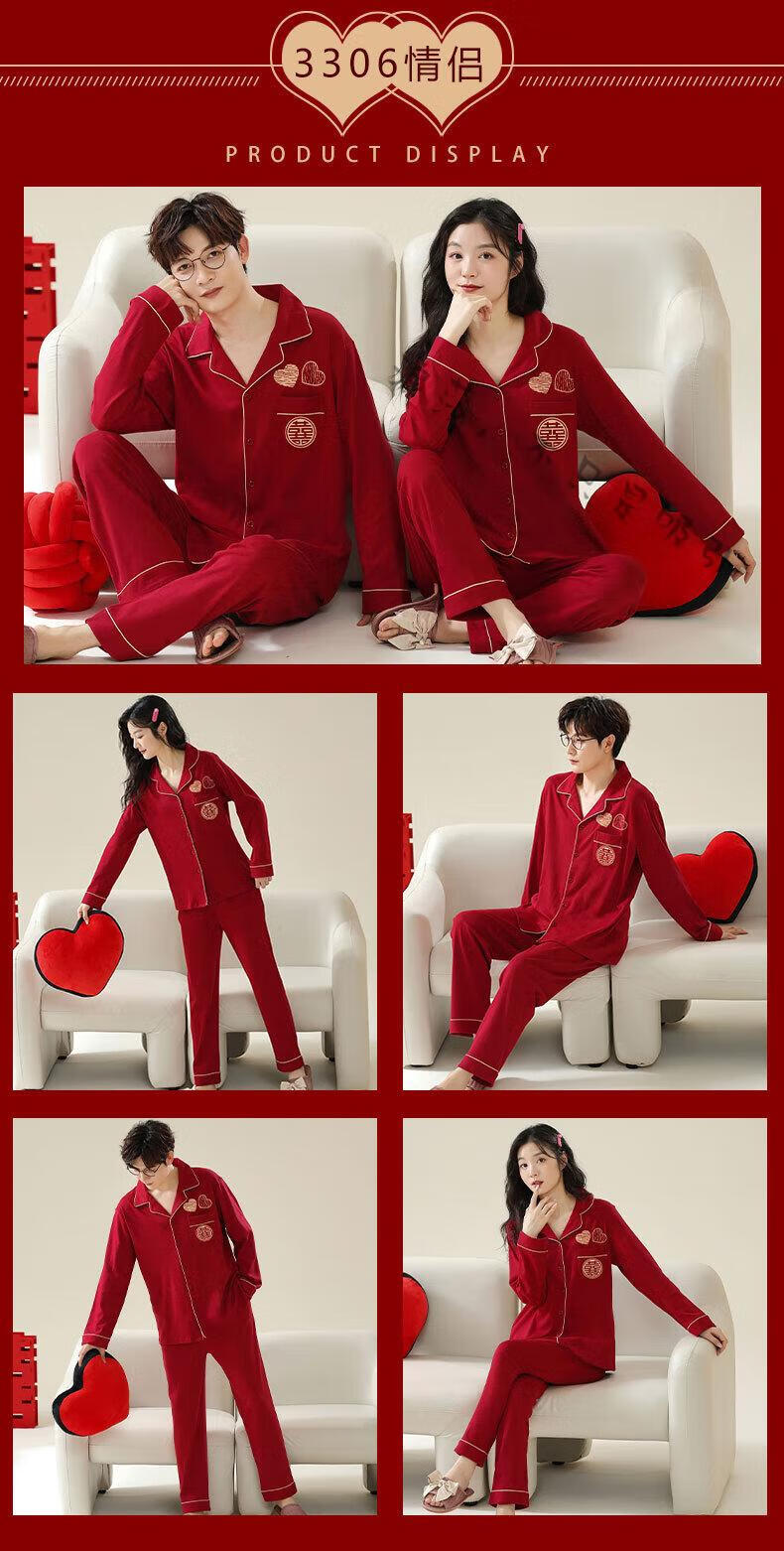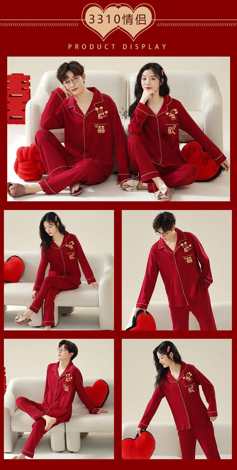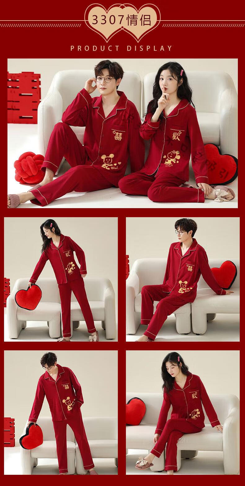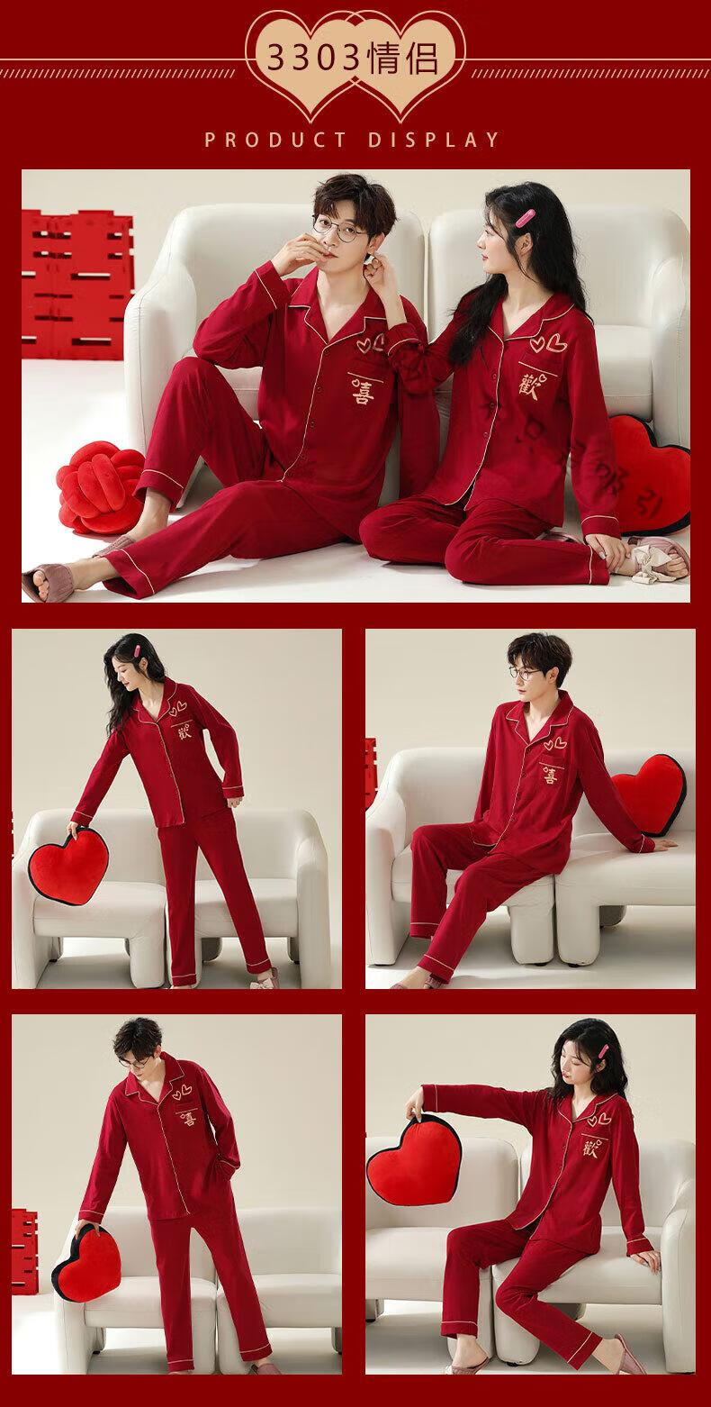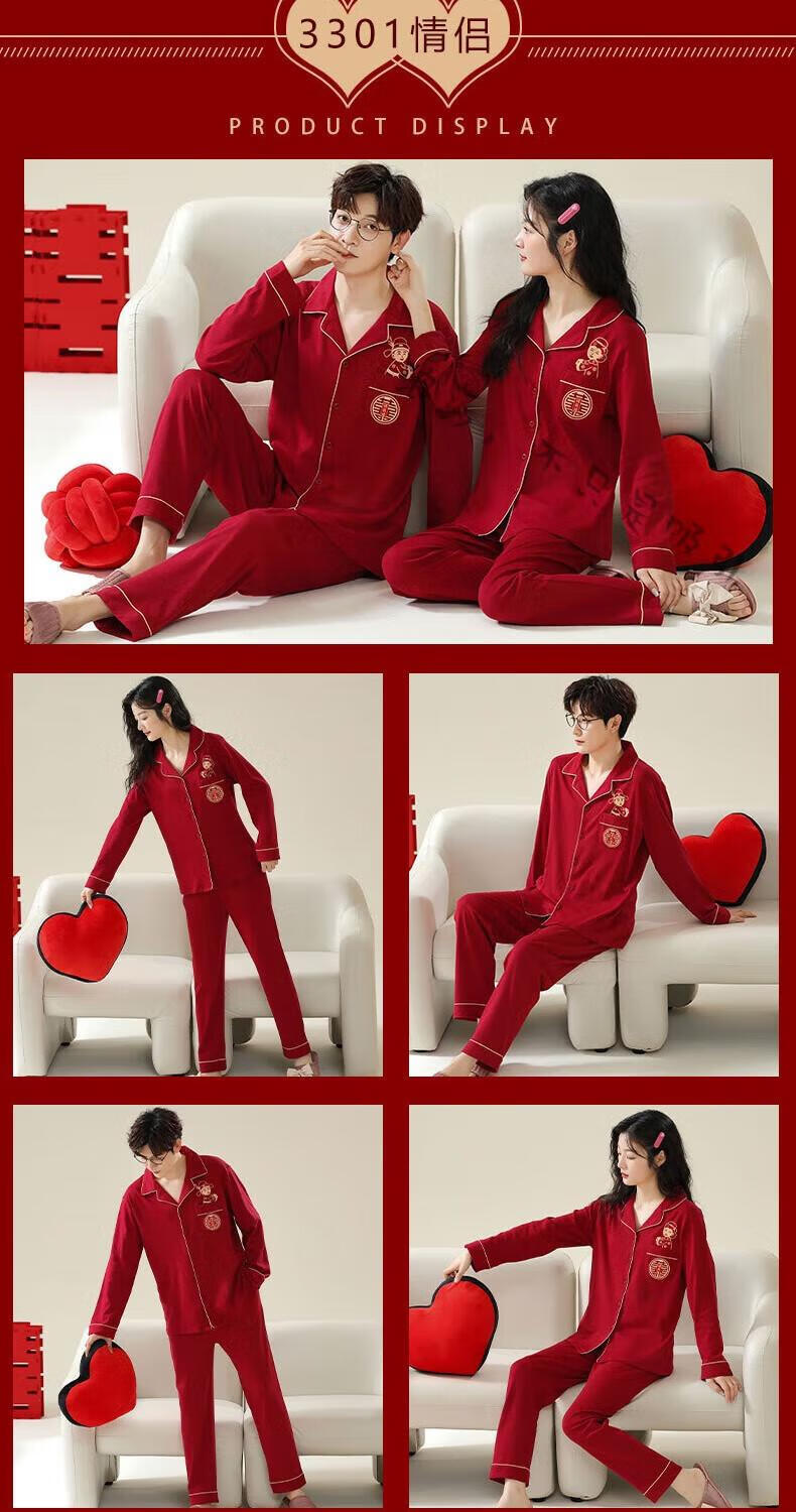 LangSha Wedding Pajamas Couple Outfits One Man and One Woman Pure Cotton Red Spring and Autumn Cotton Festive High-Level Home Clothing Set 3307 Love Launch M Female + 2XL Male