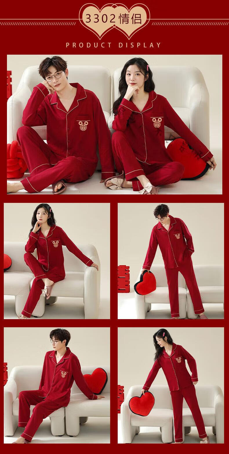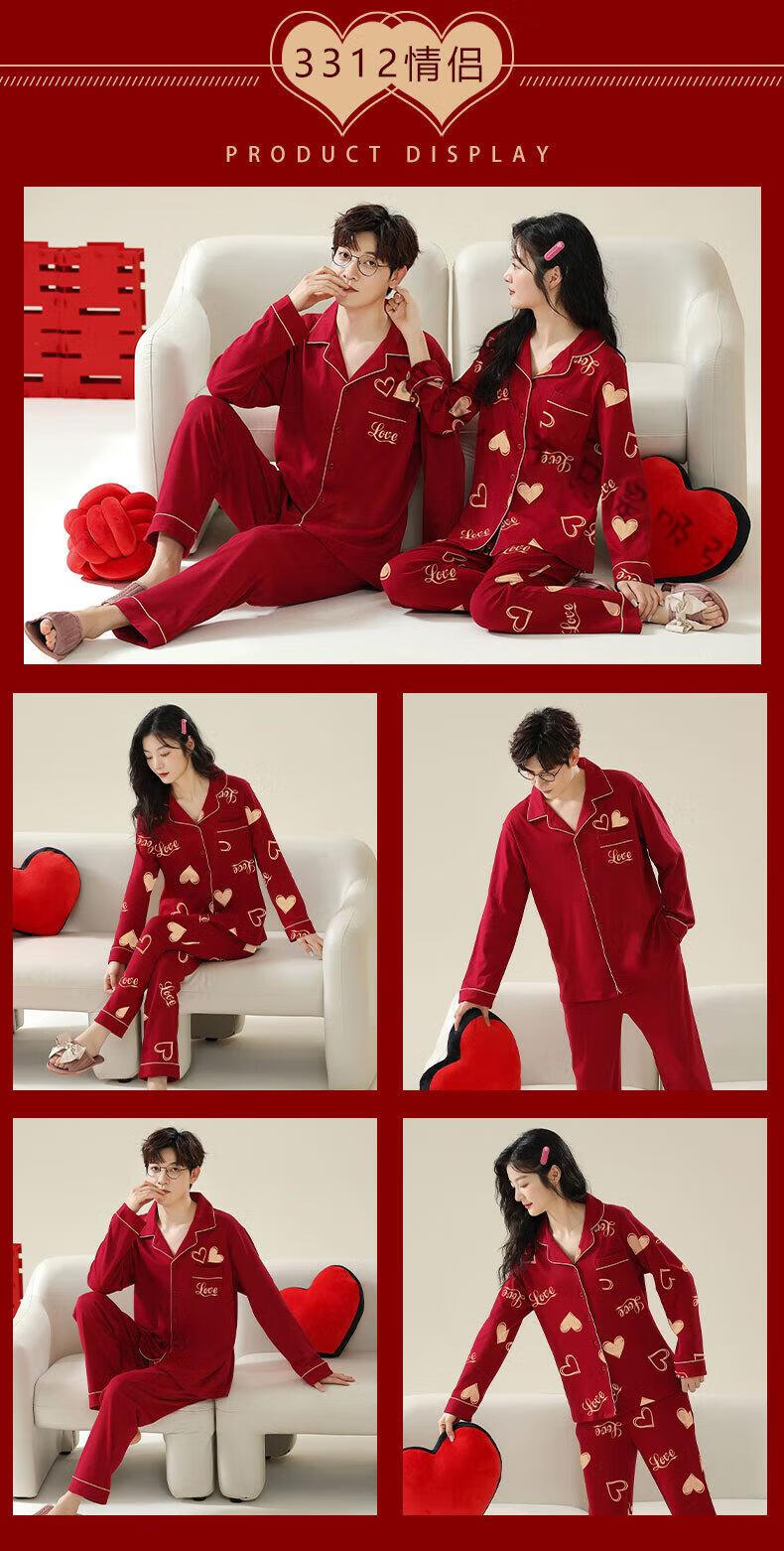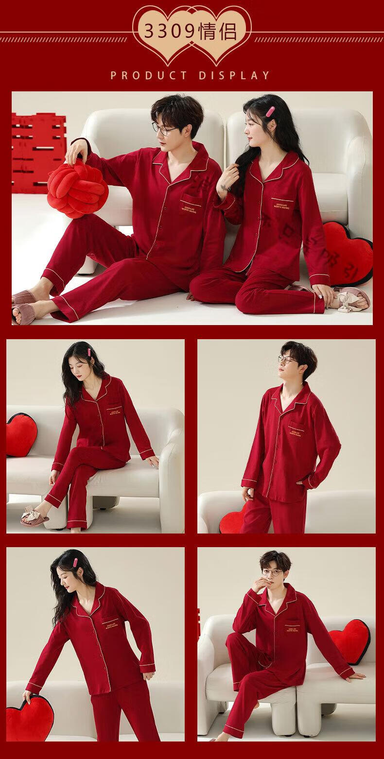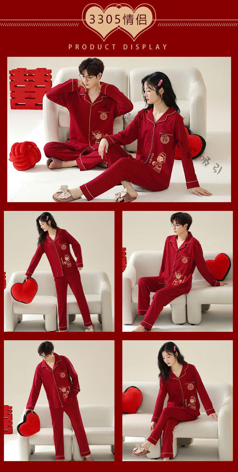 LangSha Wedding Pajamas Couple Outfits One Man and One Woman Pure Cotton Red Spring and Autumn Cotton Festive High-Level Home Clothing Set 3307 Love Launch M Female + 2XL Male