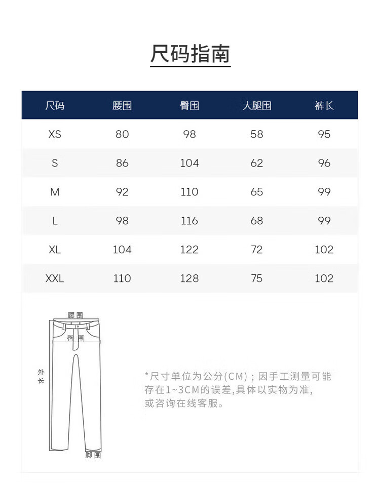 Outseam (cm) 99 cm 101.5 cm 104 cm 106.5 cm 109 cm