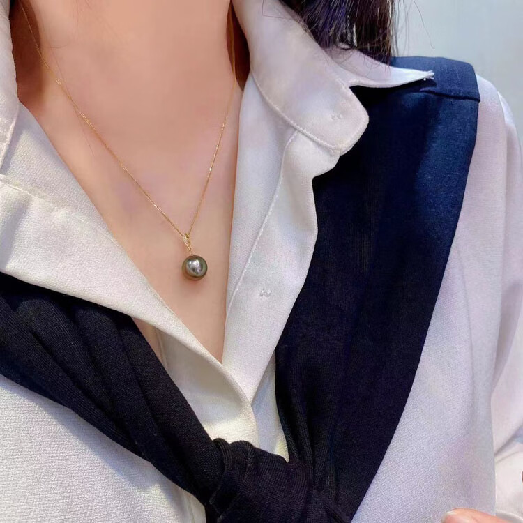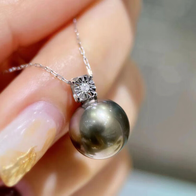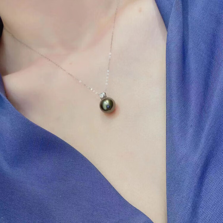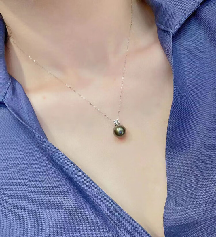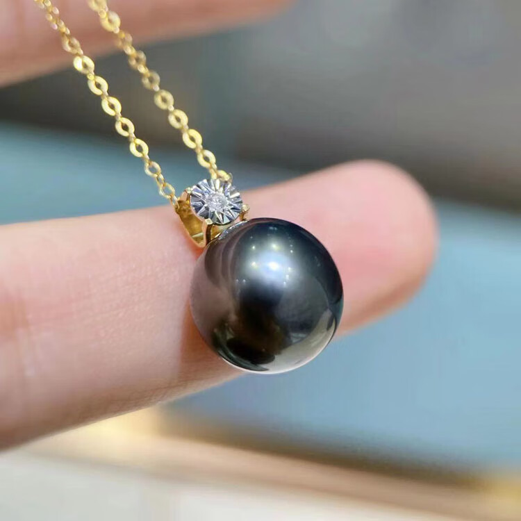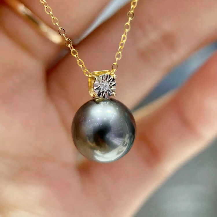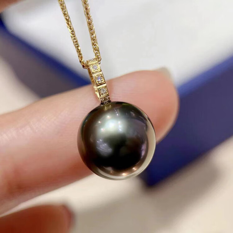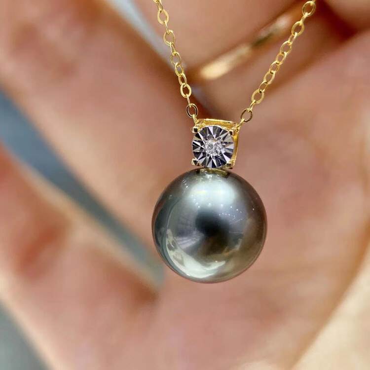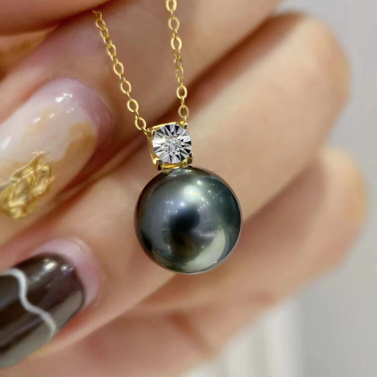 Yage Tahitian seawater black pearl pendant 18K gold diamond 10-11mm perfect round peacock green free silver chain classic style