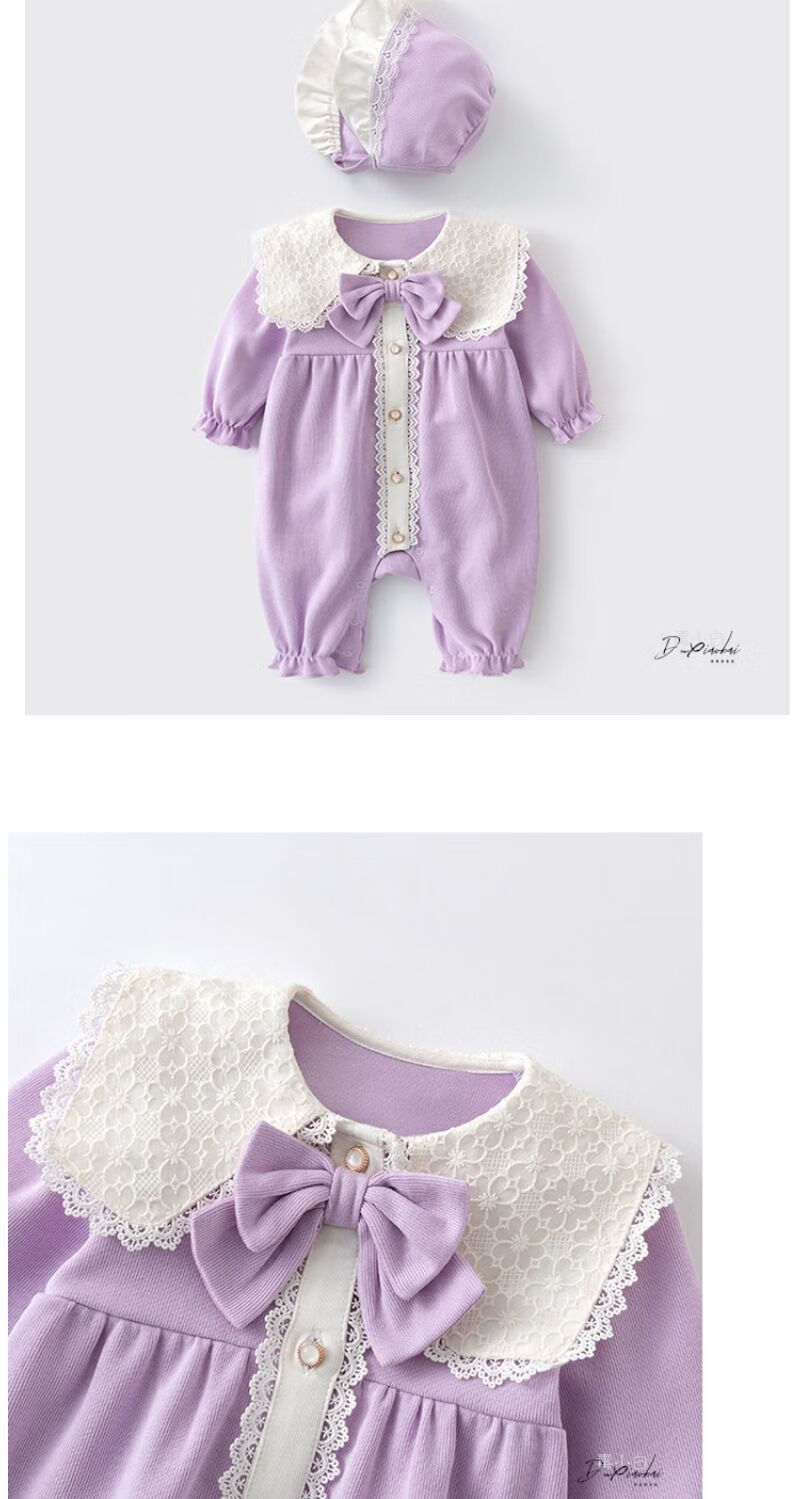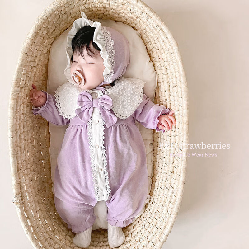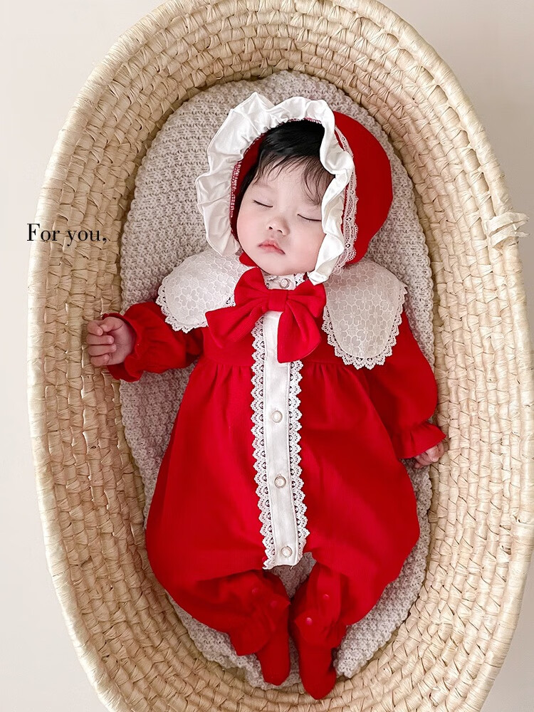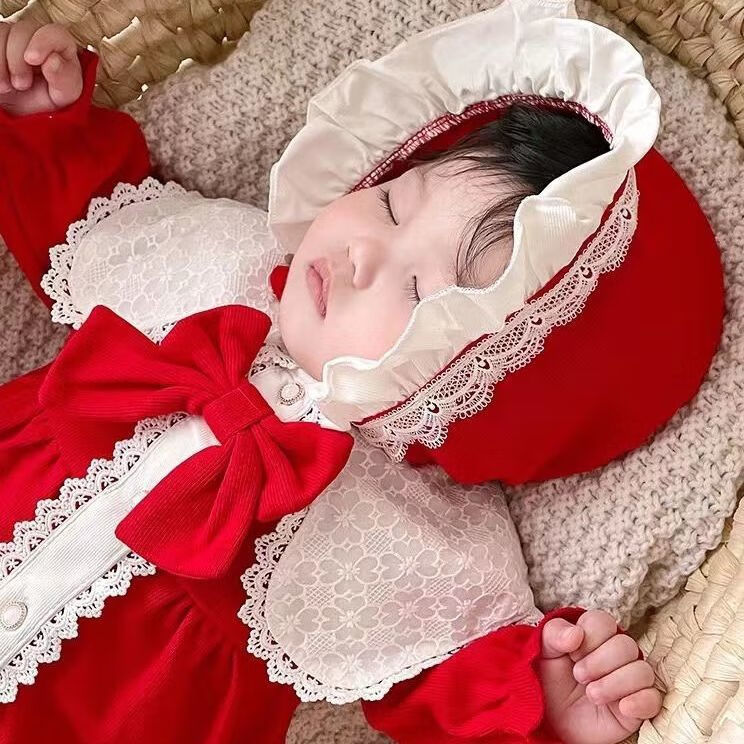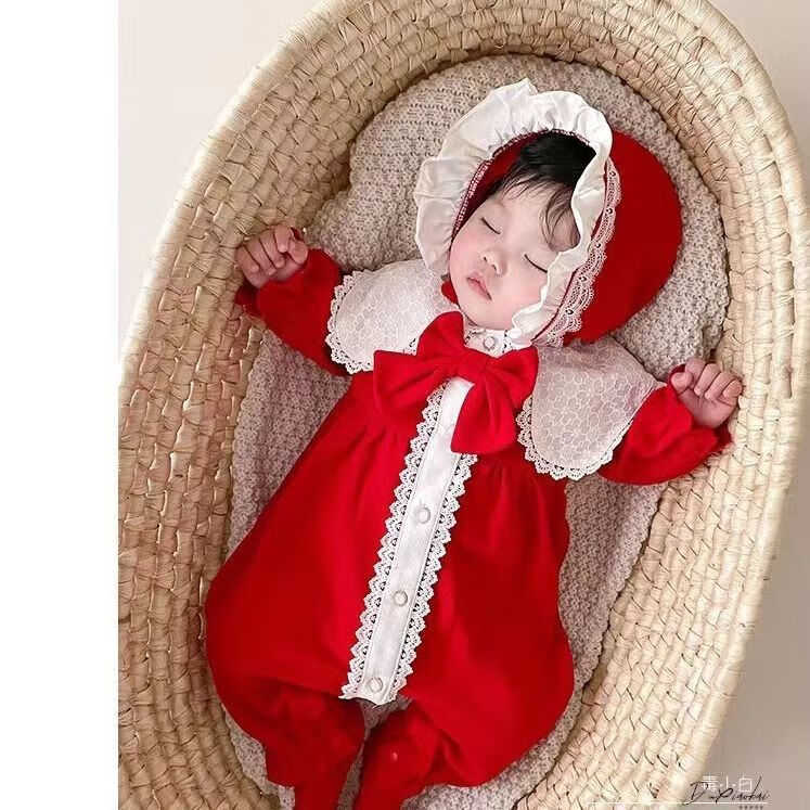 Disney baby spring and autumn long-sleeved one-piece baby girl cute princess harem Internet celebrity fashion full moon 100-day outing romper red J hooded lace collar one-piece 66 52cm