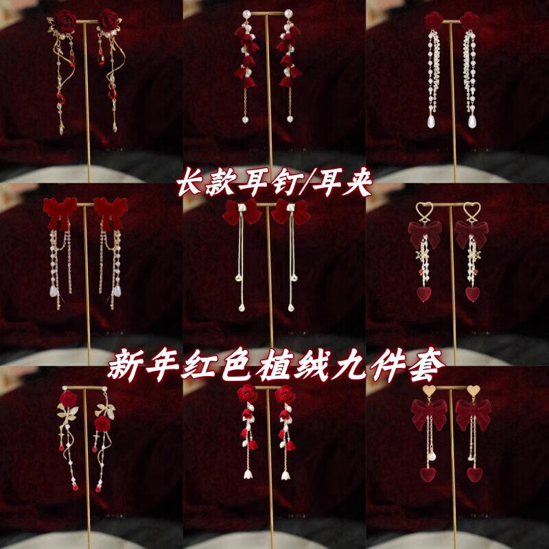 Mr. Ouyang autumn and winter red velvet rose earrings for women French retro super fairy tassel earrings earrings without pierced ear clip earrings earrings 0004 A12-103