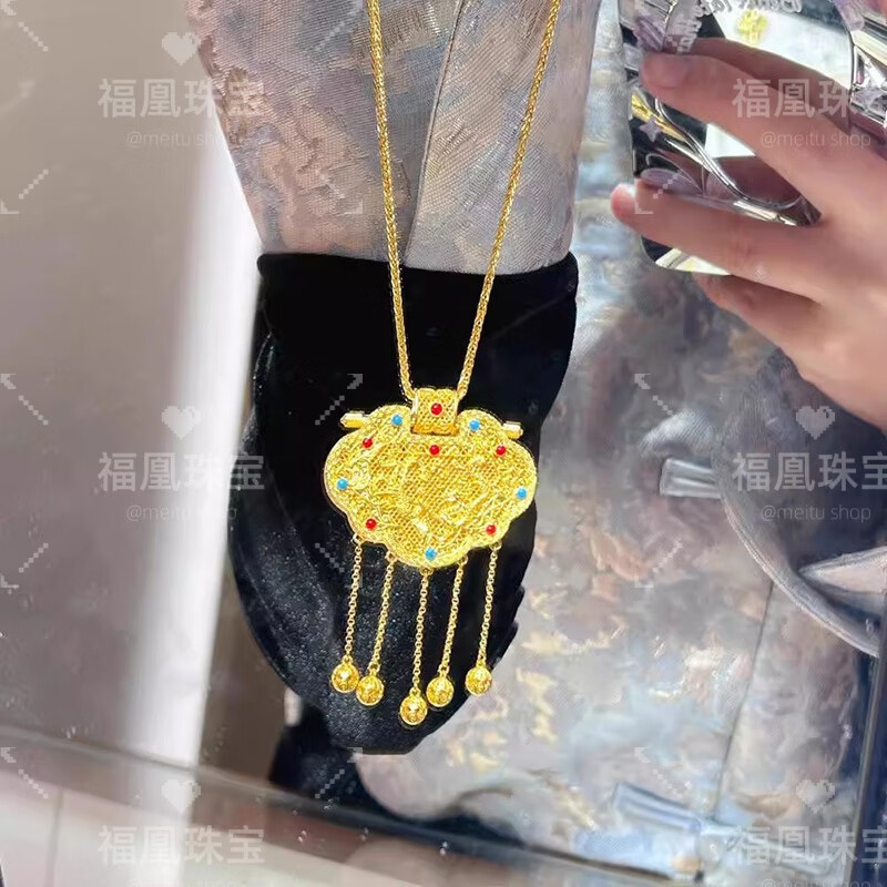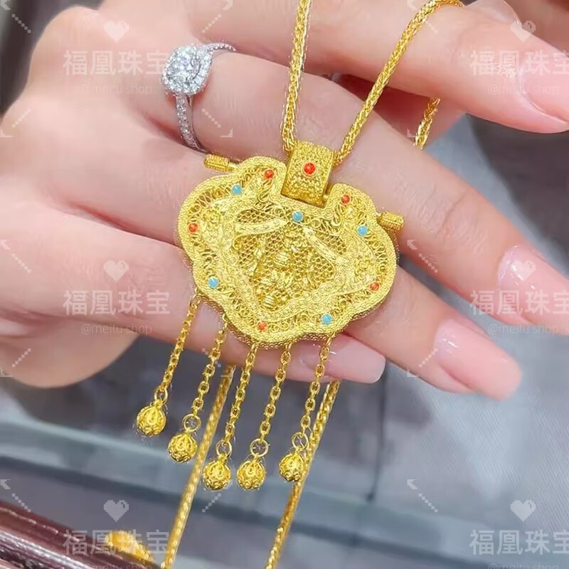 Fuhuang Jewelry Counter has the same style as the Emperor's Disciple Pendant 999 pure gold covered with silver, ancient method, inherited filigree, dragon and phoenix in auspicious lock package as a gift, Emperor's Disciple Pendant, black rope, 1g gold-filled, enamel style