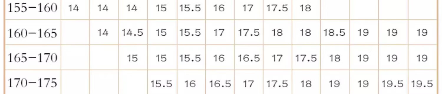 China (cm) 160-165/84-86 165-170 / 88-90 167-172 / 92-96 168-173 / 98-102 170-176 / 106-110
