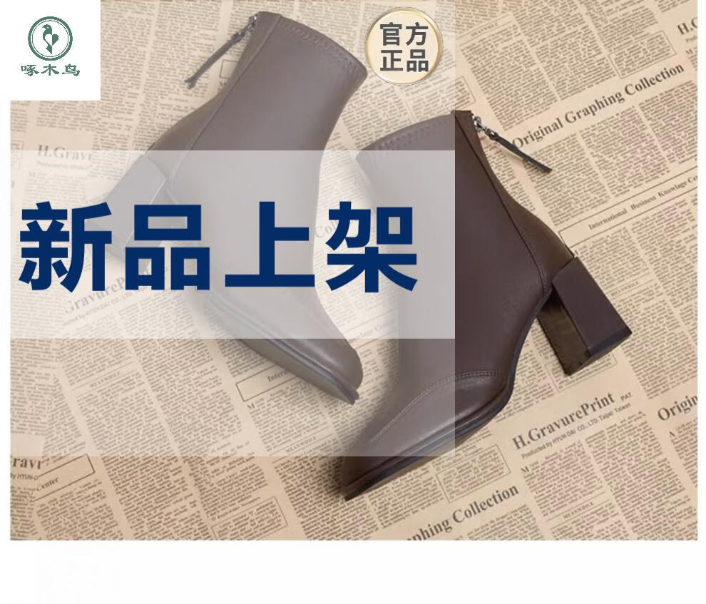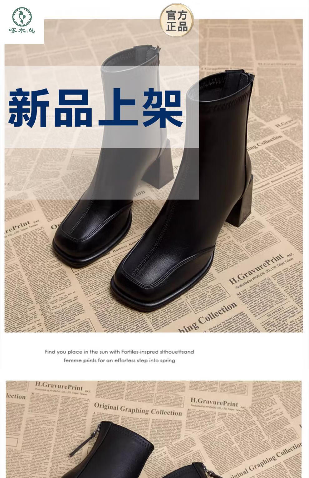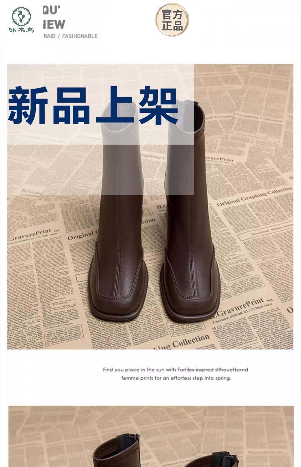Woodpecker French ankle boots feel small short boots for women 2025 spring and autumn new style small square toe thick heel Martin boots high heel brown single lining upgraded version 40