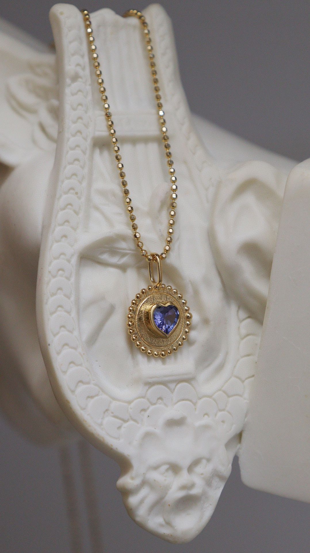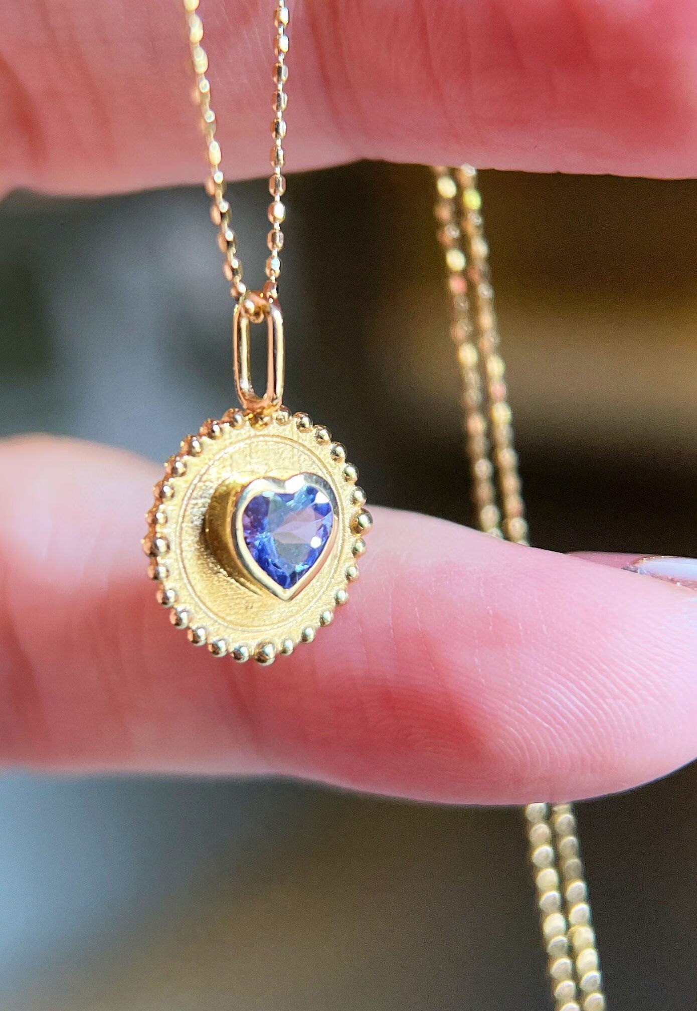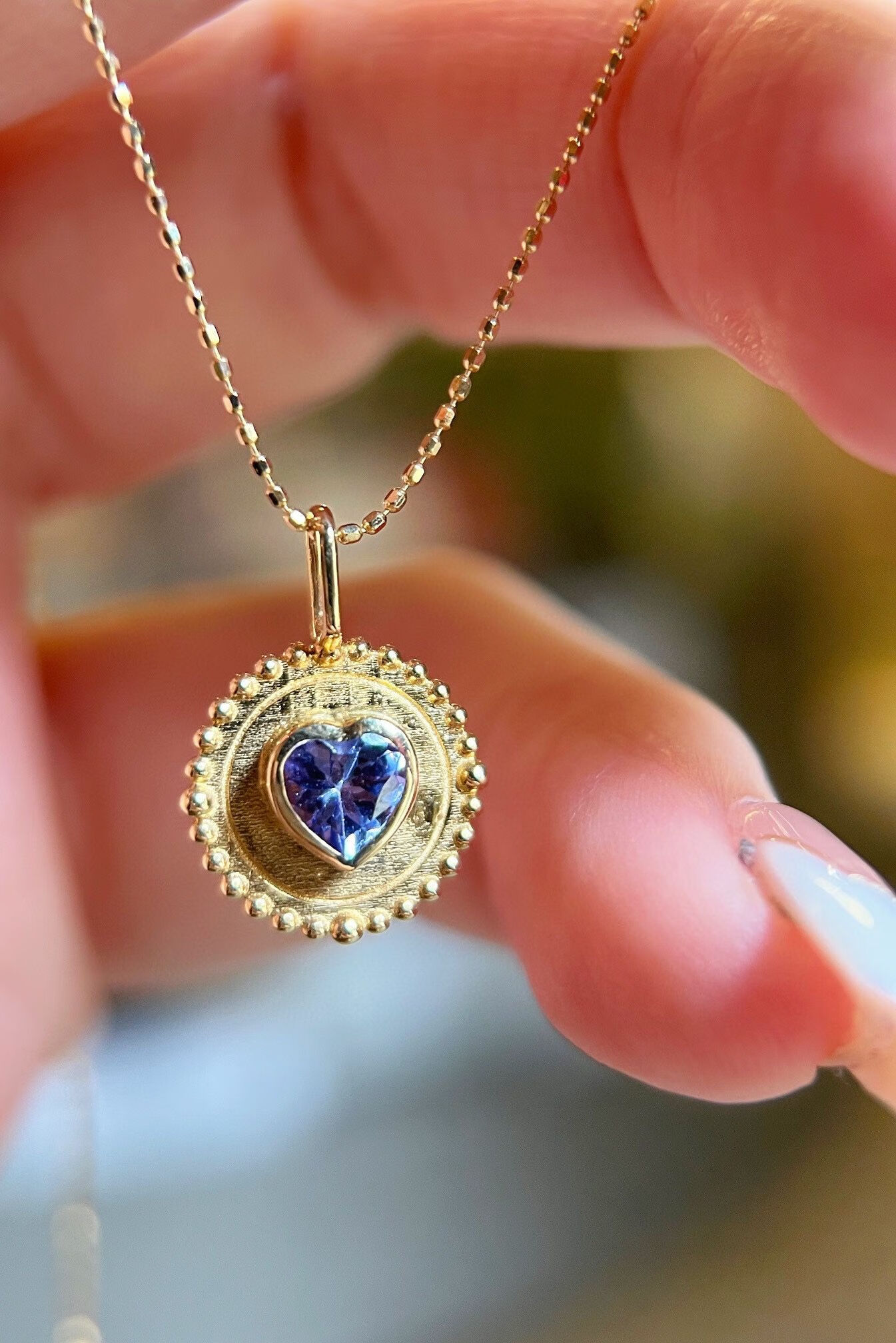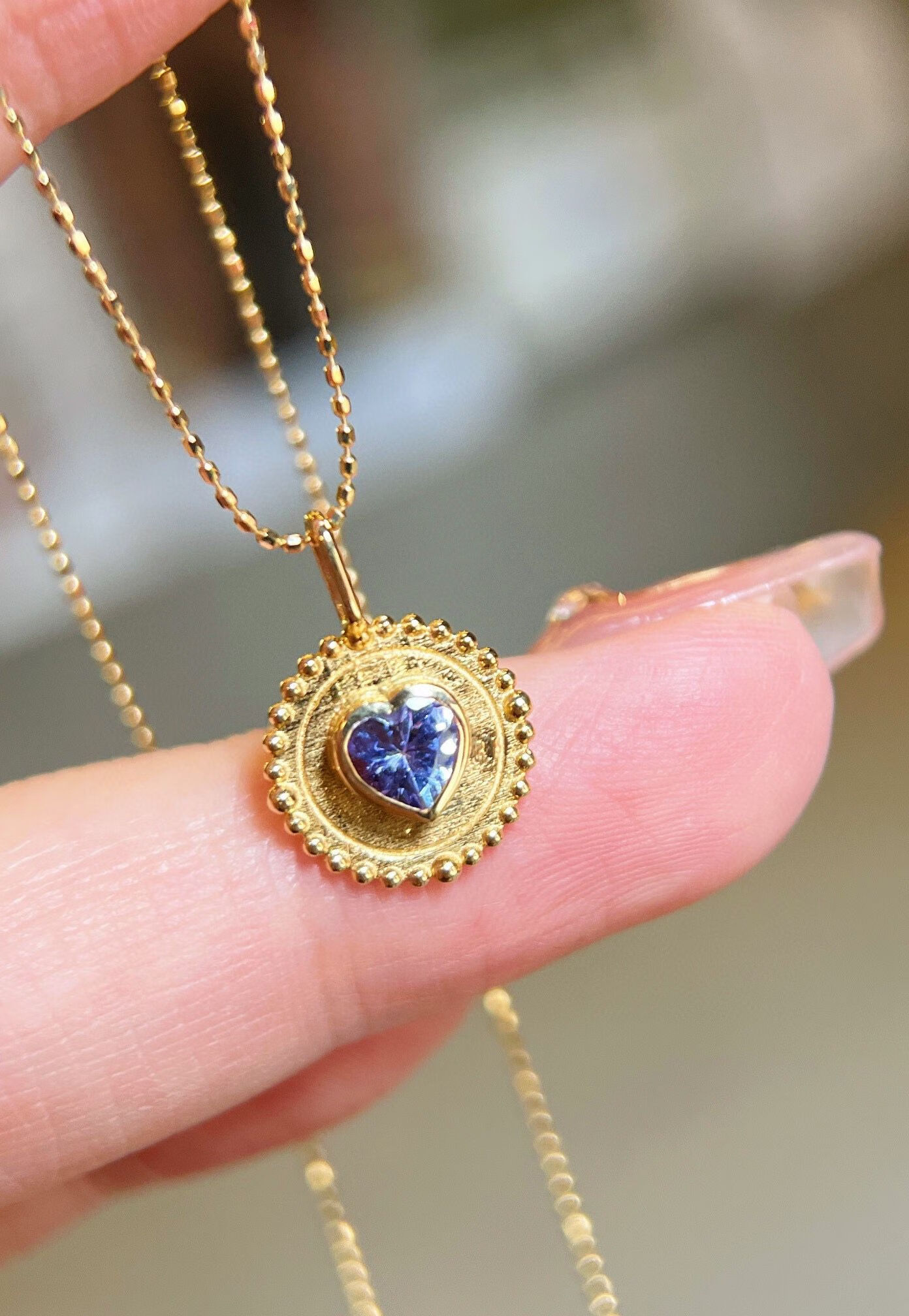 Canxian Ins simple style 18K gold heart-shaped tanzanite round plate pendant with exquisite dewdrop edge for daily commuting and versatile AU750
