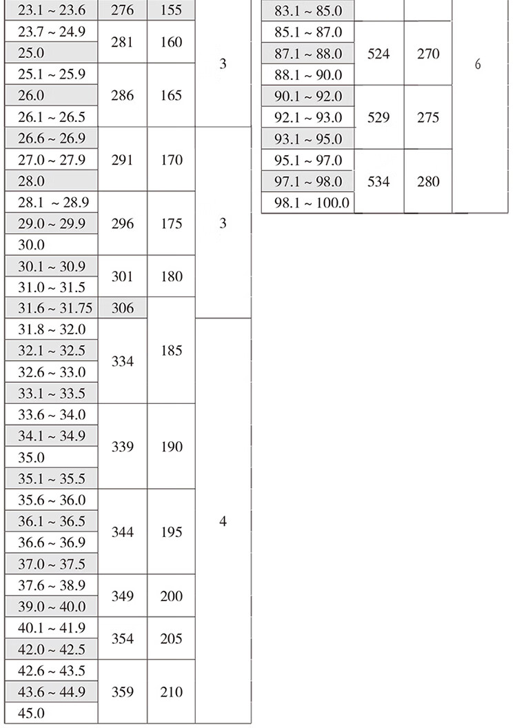 76.2 81.3 86.4 91.5 96.5 101.6 106.7 112 117 122 127 132 137 142