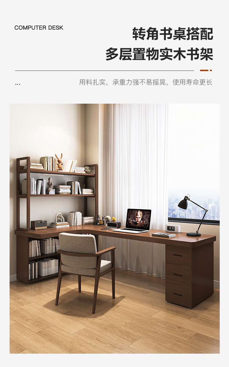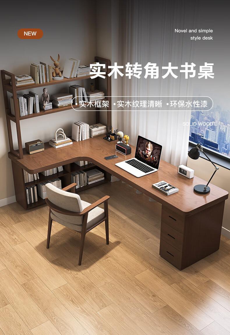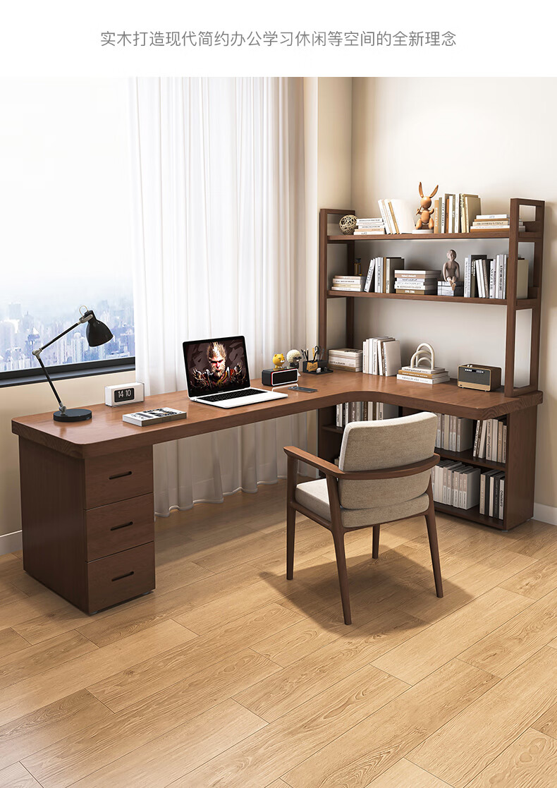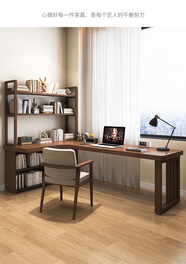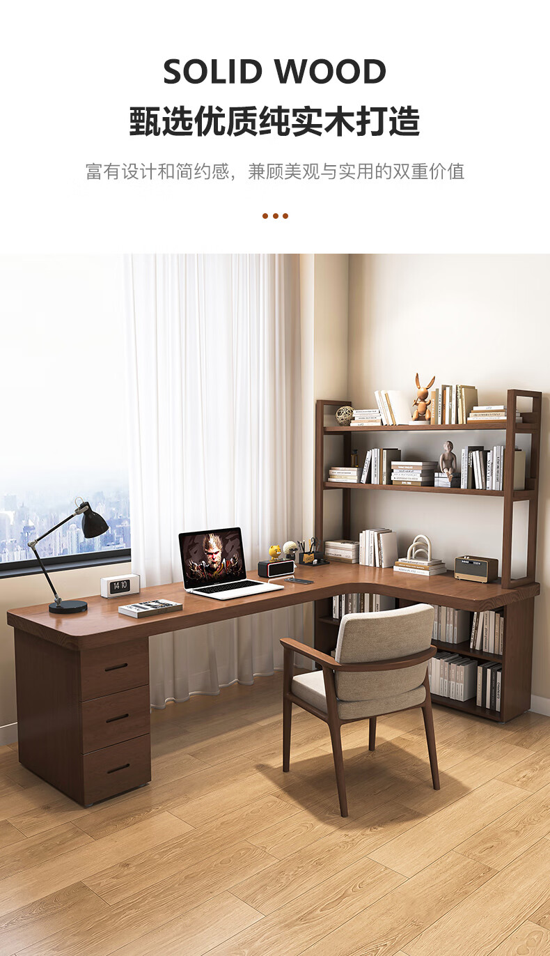 Guoman all solid wood corner computer desk desktop home student desk bedroom L-shaped double corner desk with bookshelf 140*120*55*75 drawerless cabinet + bookshelf luxury model