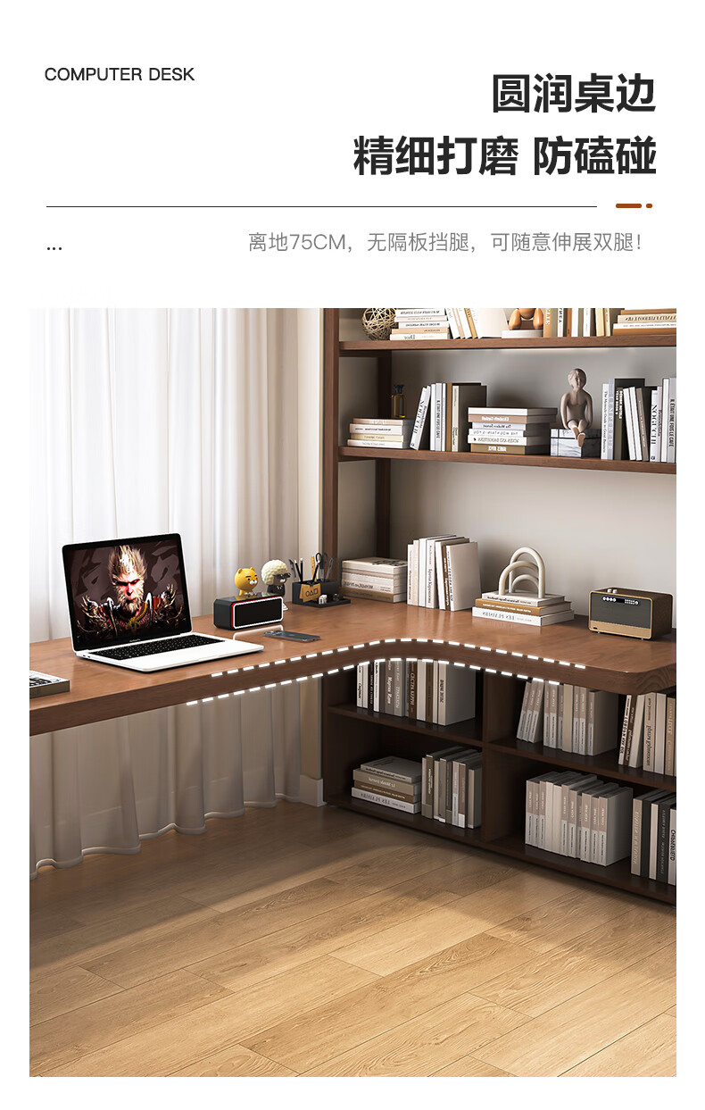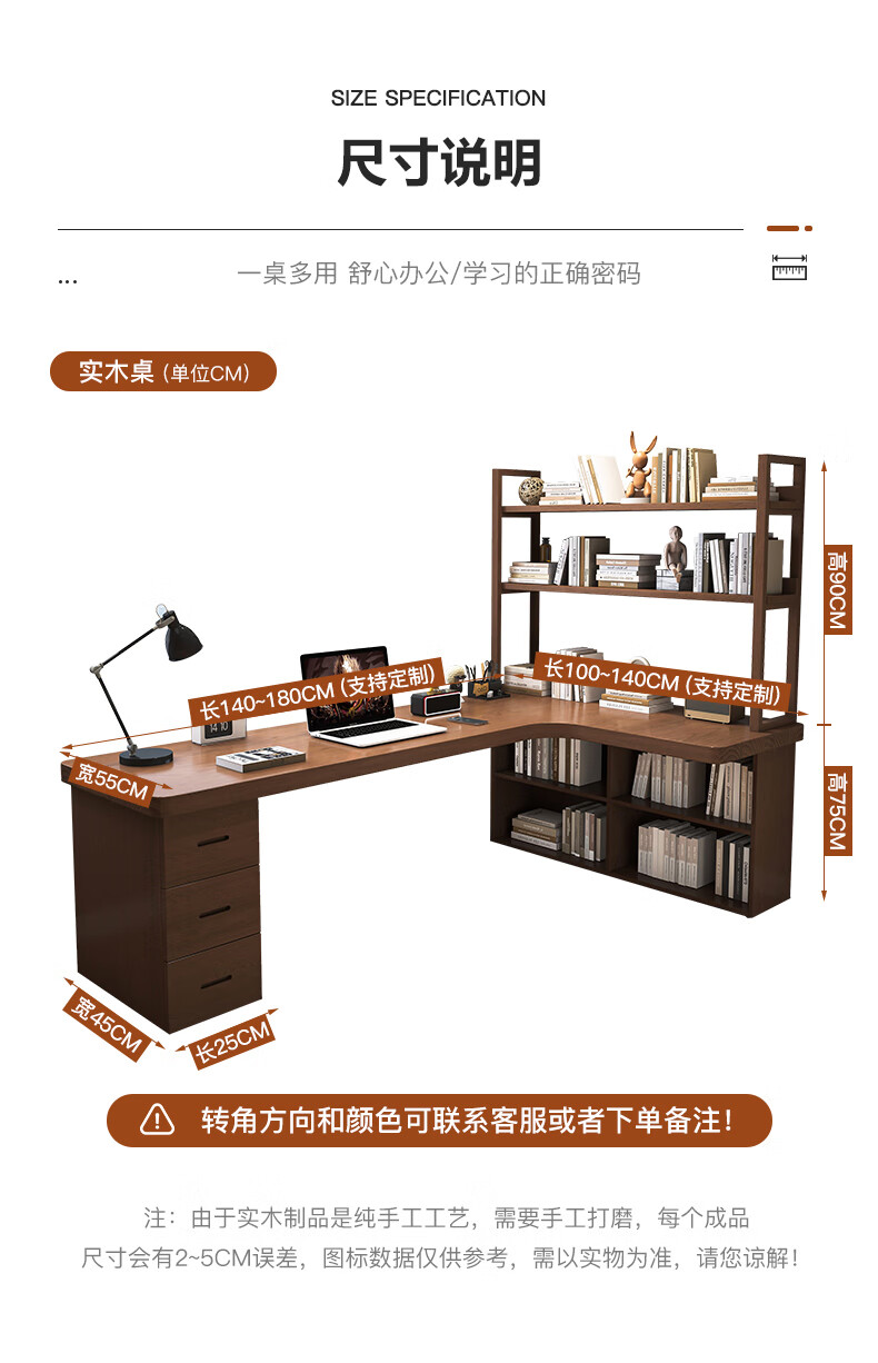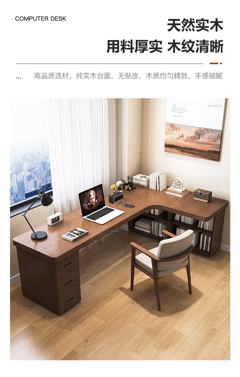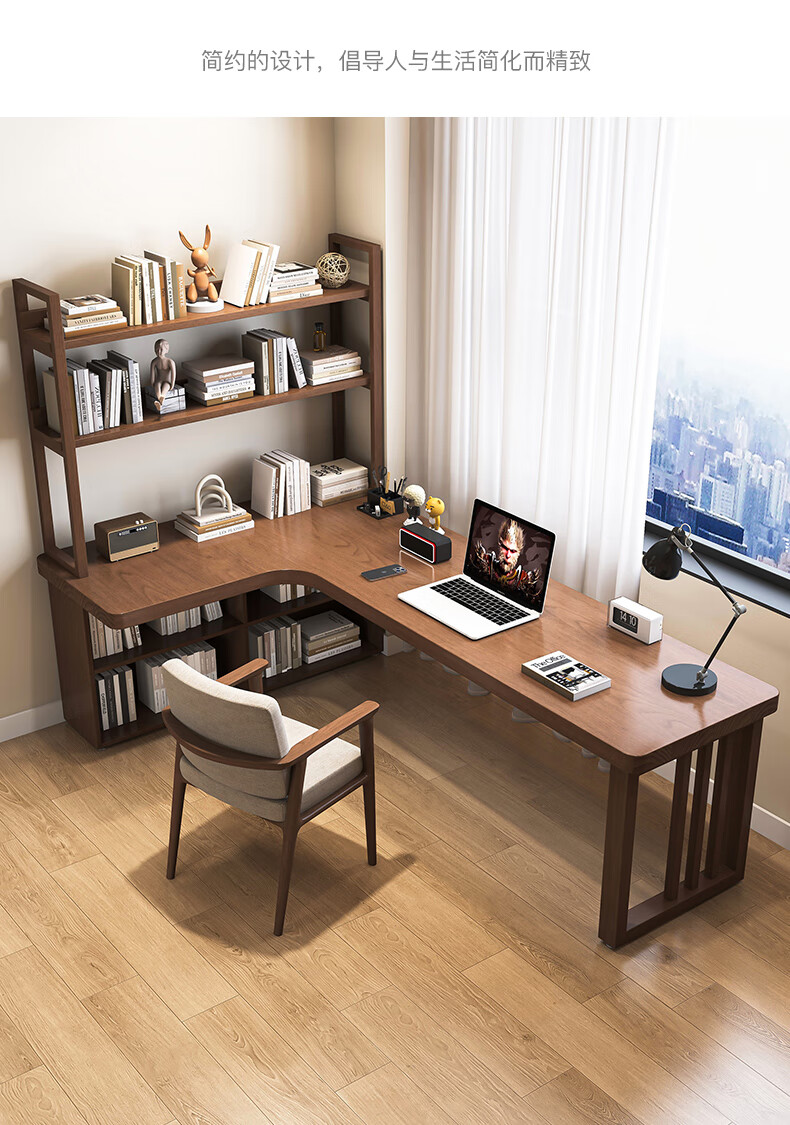 Guoman all solid wood corner computer desk desktop home student desk bedroom L-shaped double corner desk with bookshelf 140*120*55*75 drawerless cabinet + bookshelf luxury model