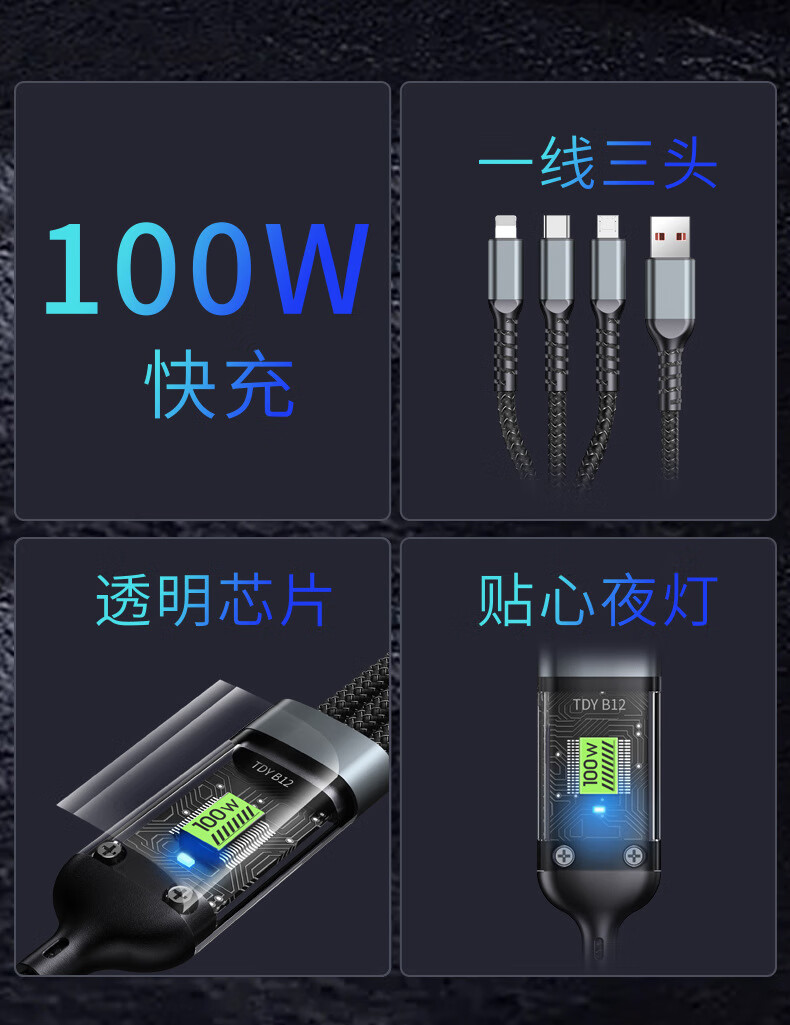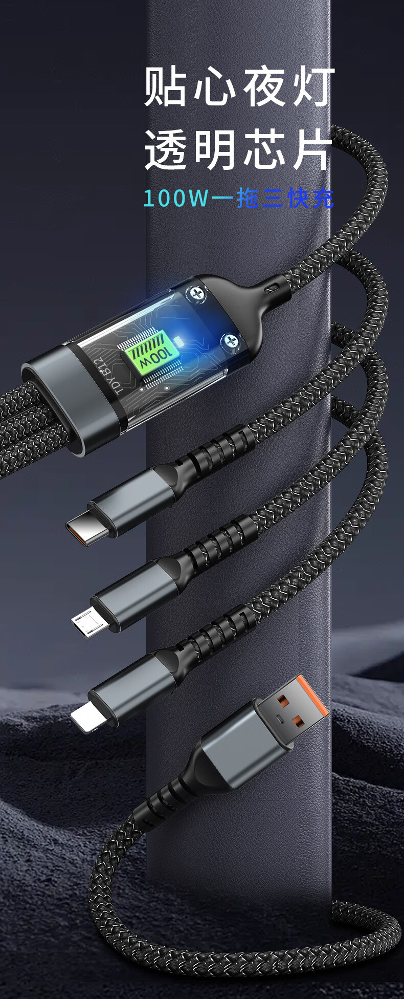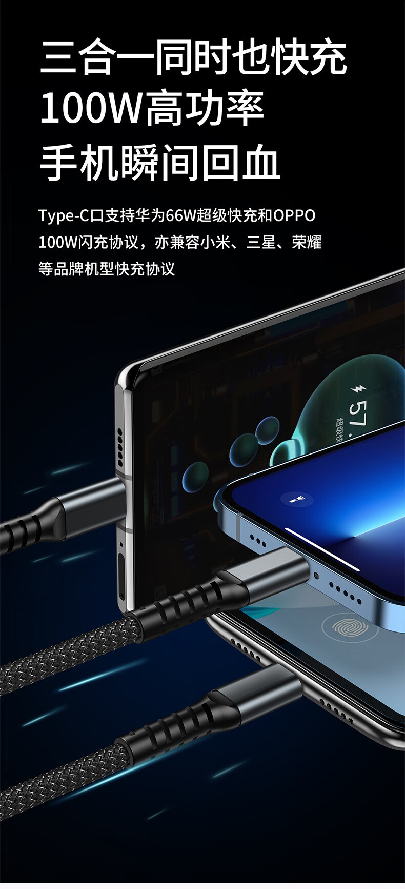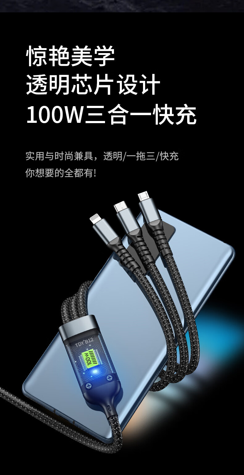 Transparent compartment three-in-one data cable suitable for Apple Huawei OPPO Android type-c three-head charging cable mobile phone universal one-to-three multi-function car Transparent compartment three-in-one 1 pack