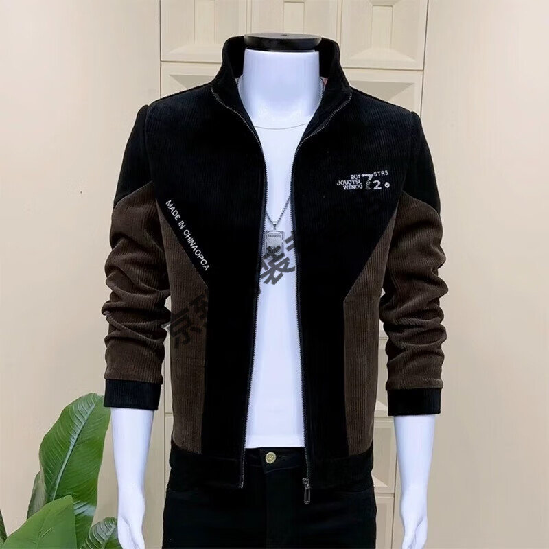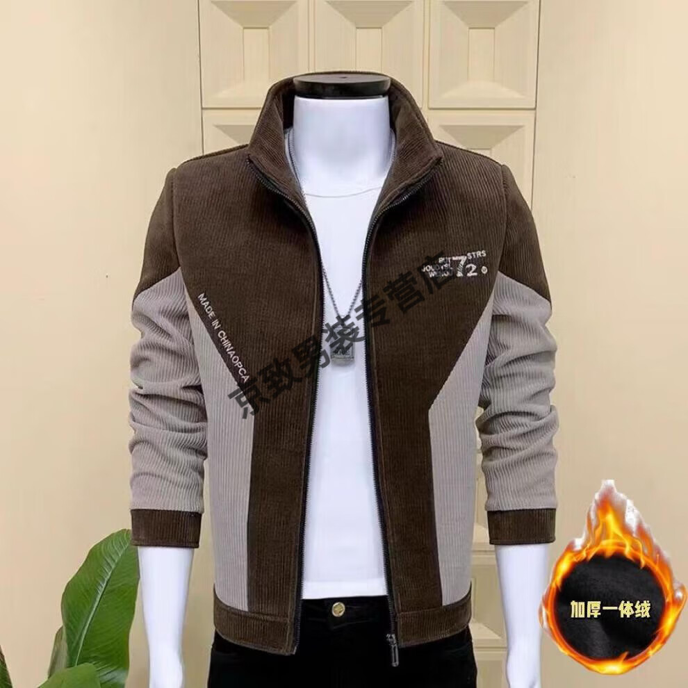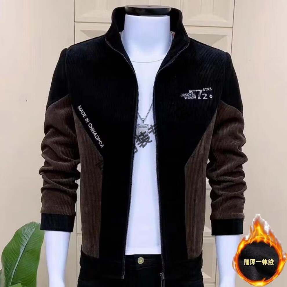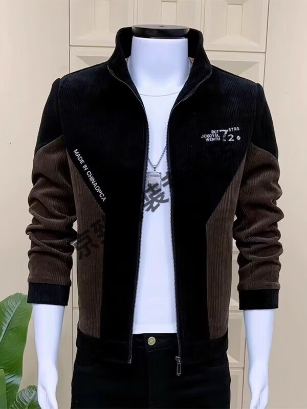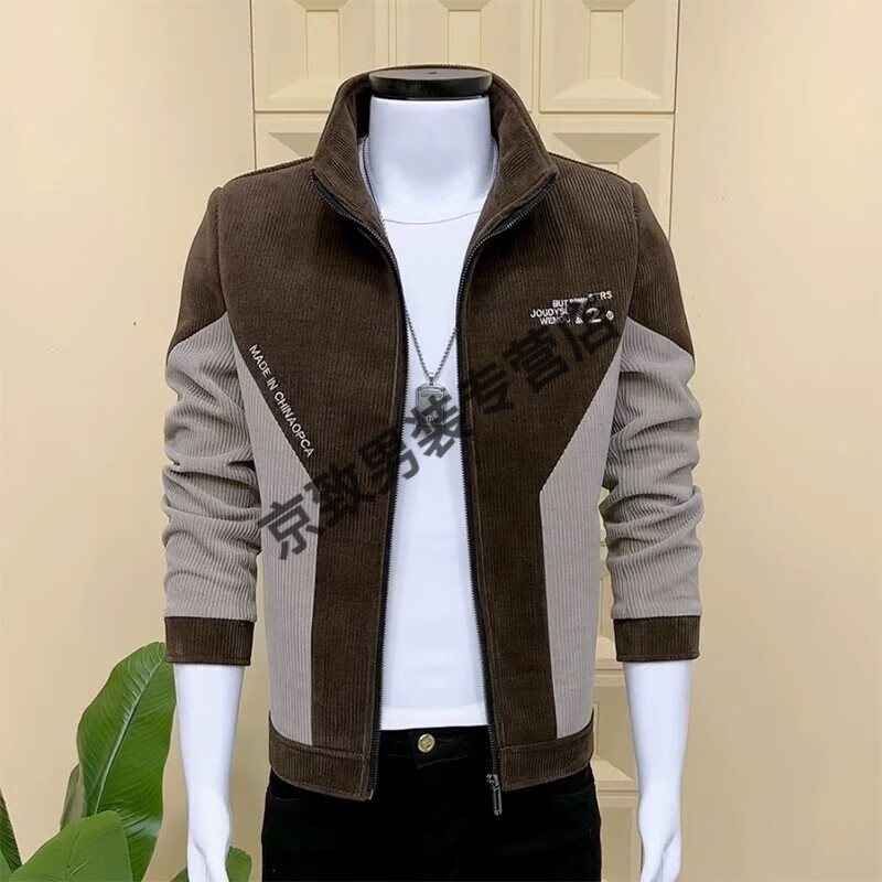 LAXSESU2025 Spring and Autumn New Men's Jacket Plus Velvet Autumn and Winter Slim Stand Collar Color Matching Casual Youth Jacket Apricot Style Regular XL 121-140Jin Jin is equal to 0.5 kg