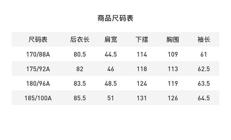 China (cm) 165 / 88-90 170 / 96-98 175 / 108-110 180 / 118-122 185 / 126-130