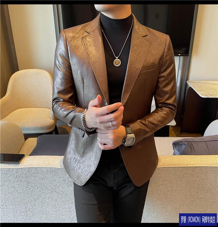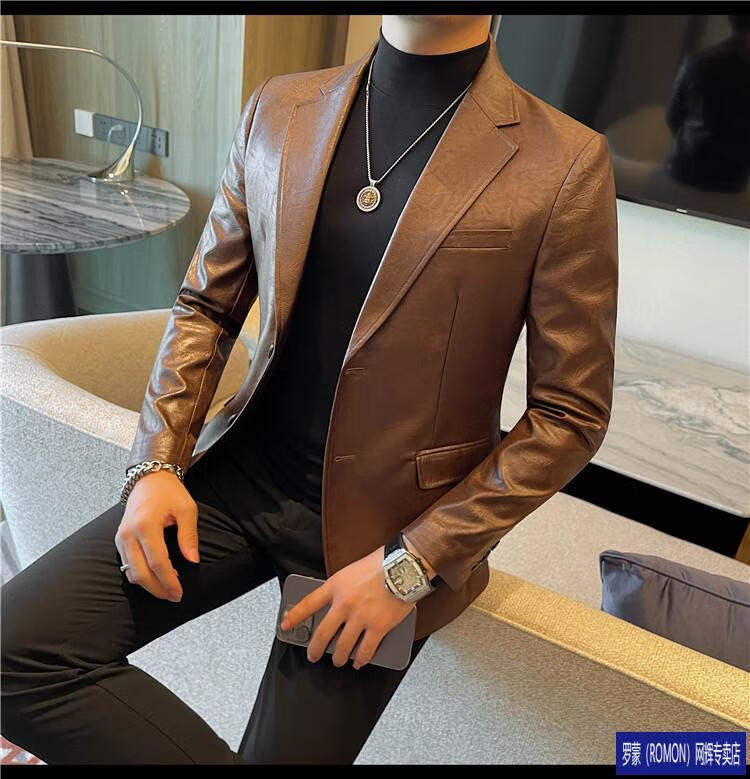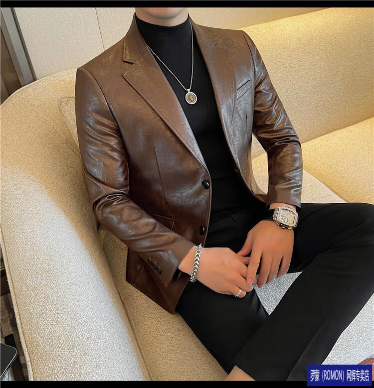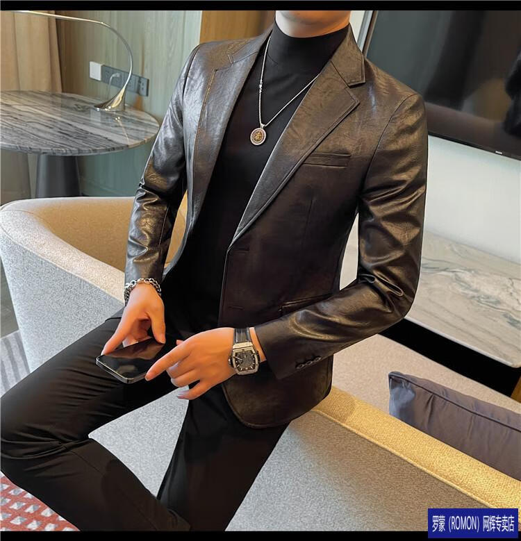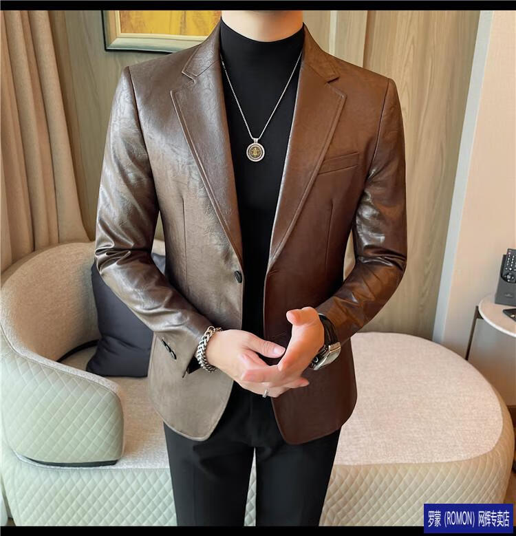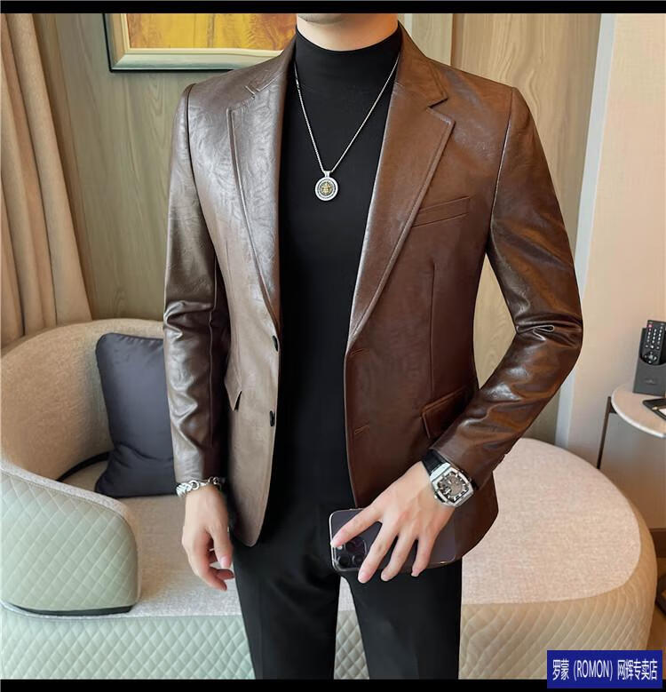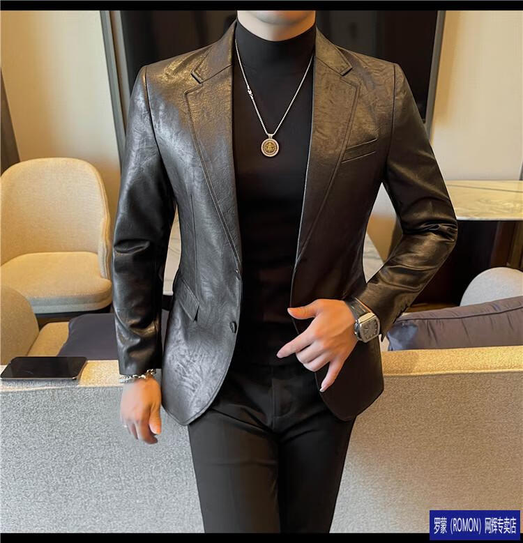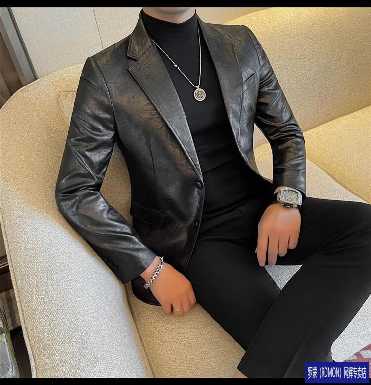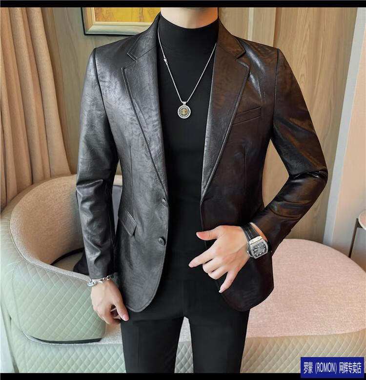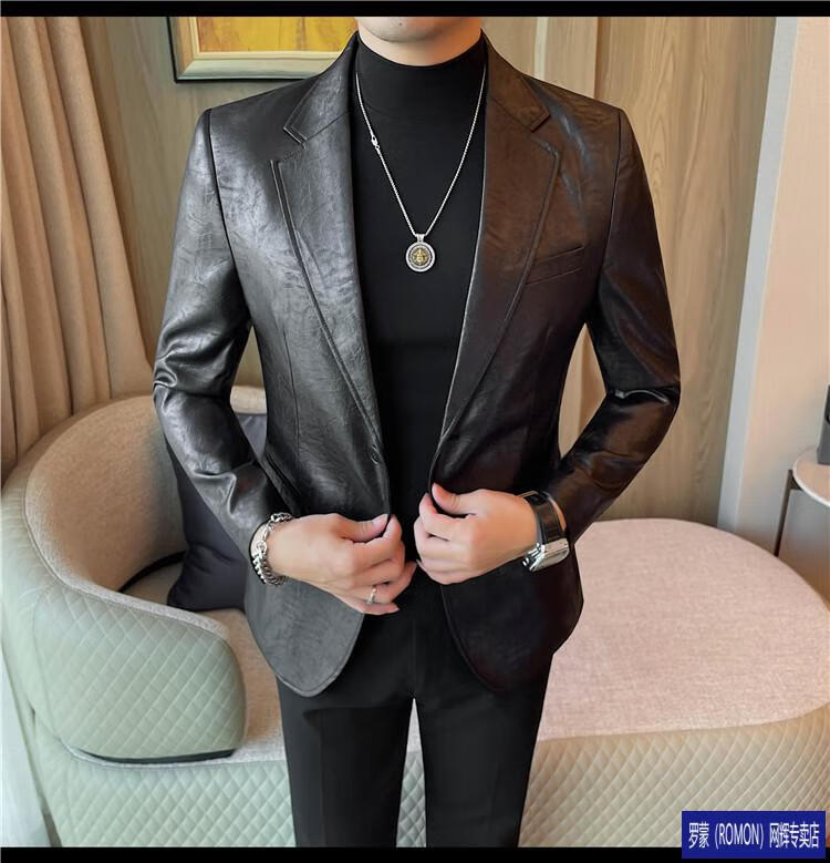 ROMON handsome style leather suit jacket men's autumn and winter 2026 new fashion trend slim and handsome suit black (90-110Jin Jin equals 0.5kg) M