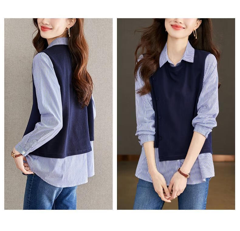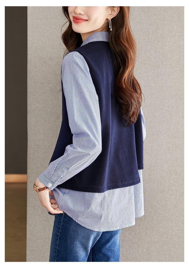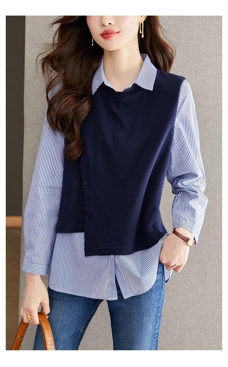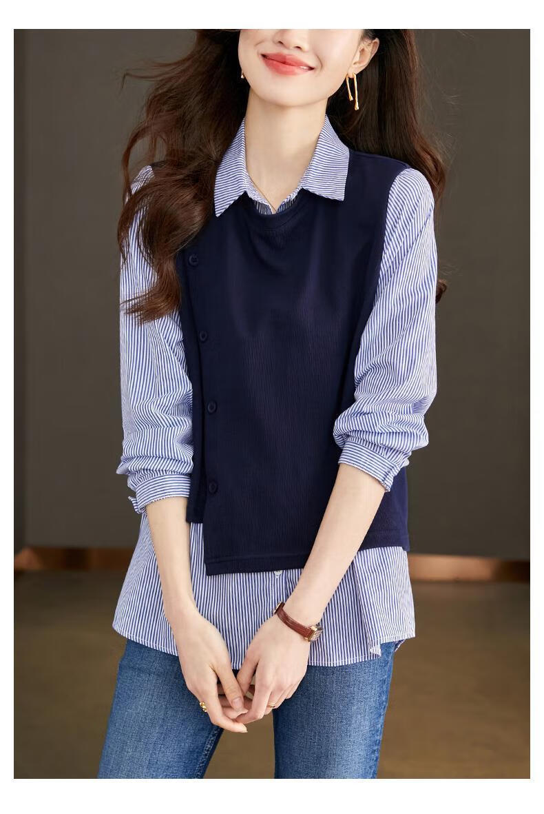 Yisijia 2025 Spring and Autumn New Blue Stripe Splicing Fake Two-piece Shirt Women's Design Casual Long-Sleeved Shirt Top Navy Blue S