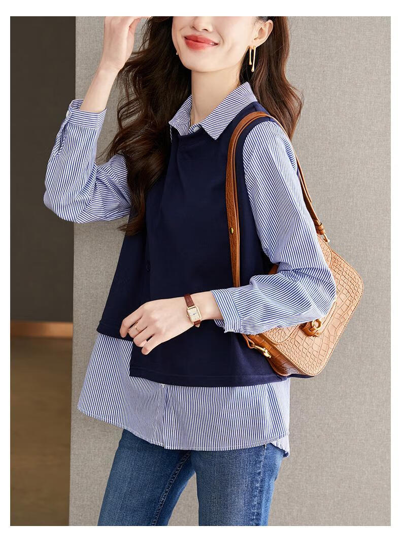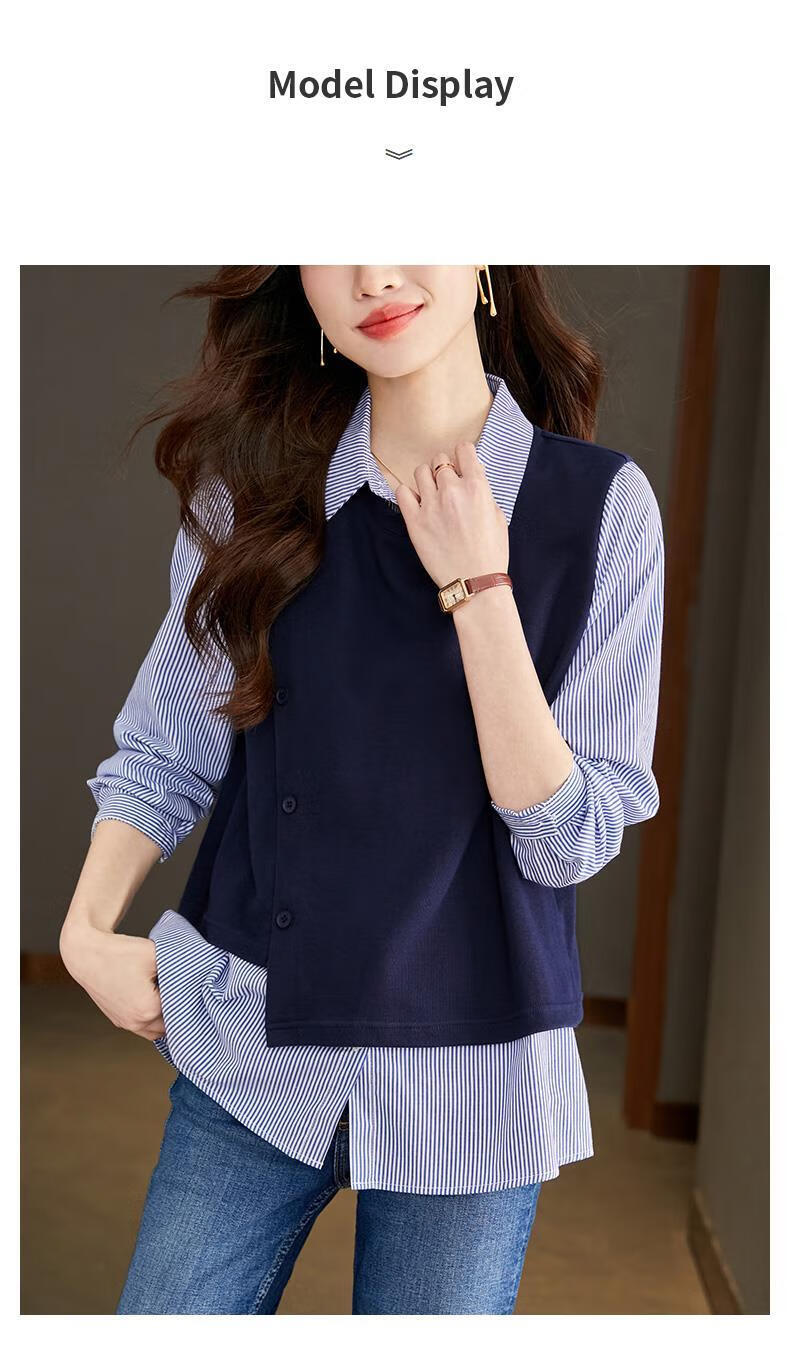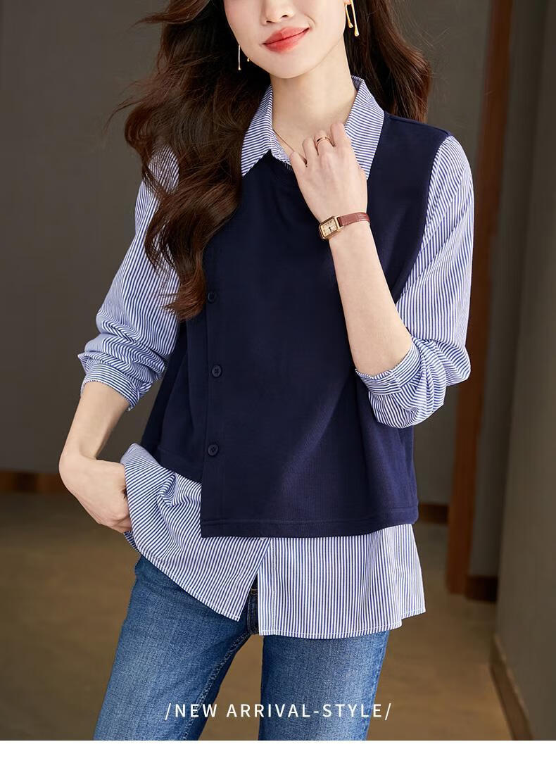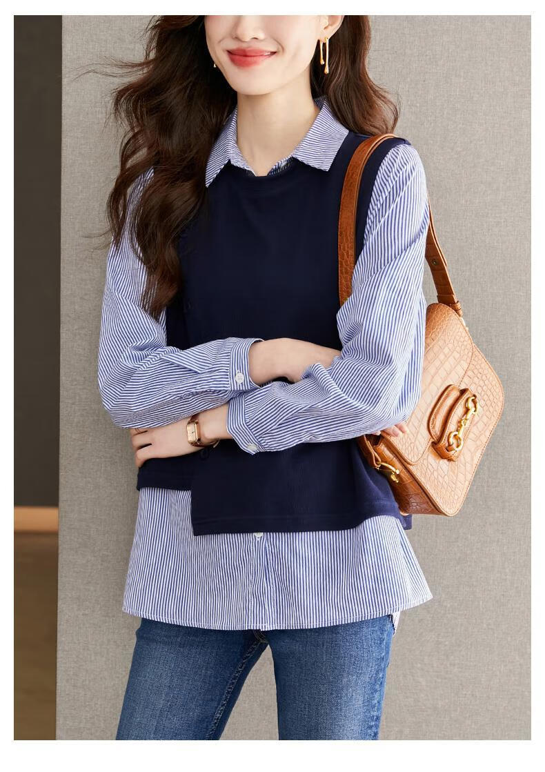 Yisijia 2025 Spring and Autumn New Blue Stripe Splicing Fake Two-piece Shirt Women's Design Casual Long-Sleeved Shirt Top Navy Blue S