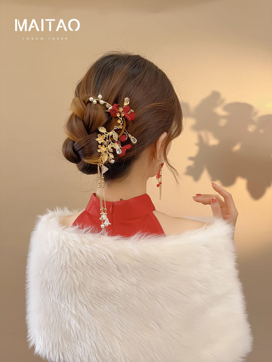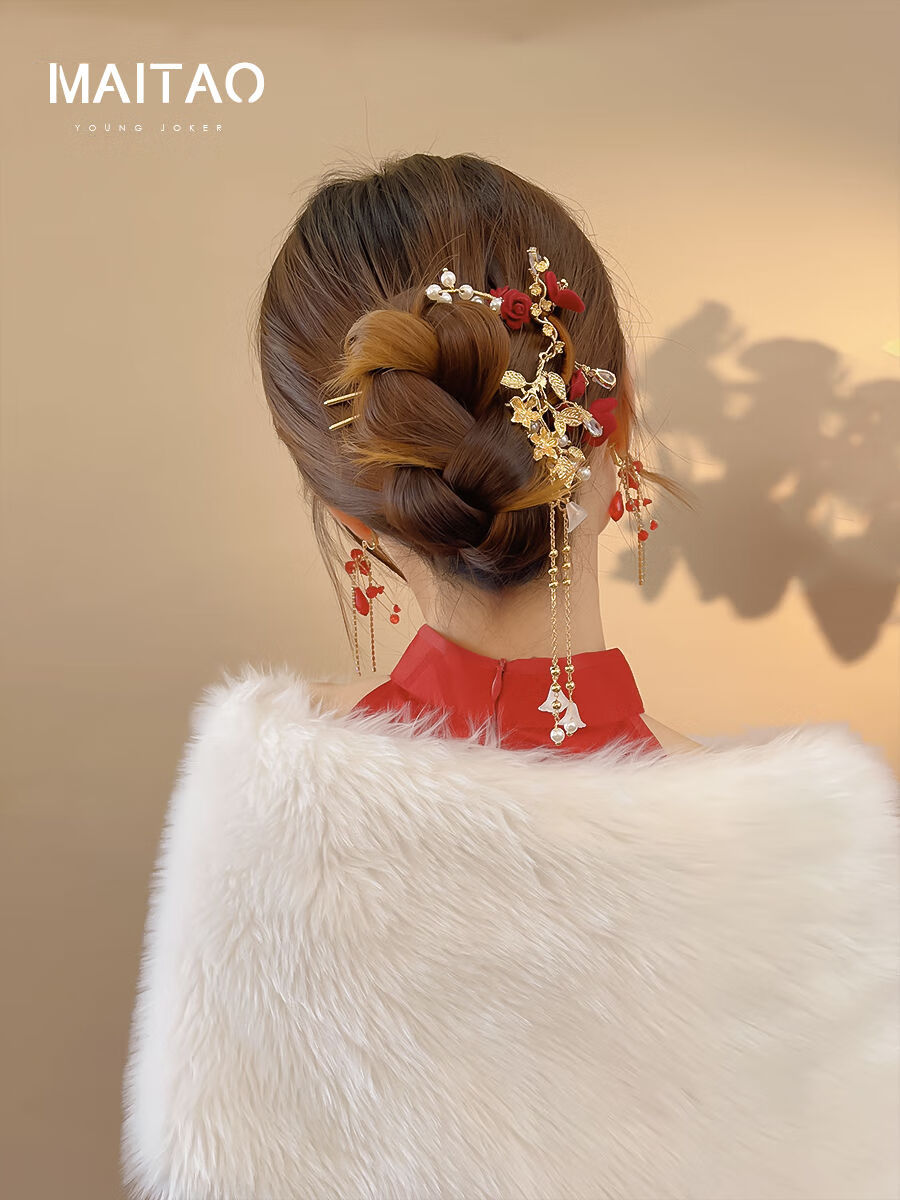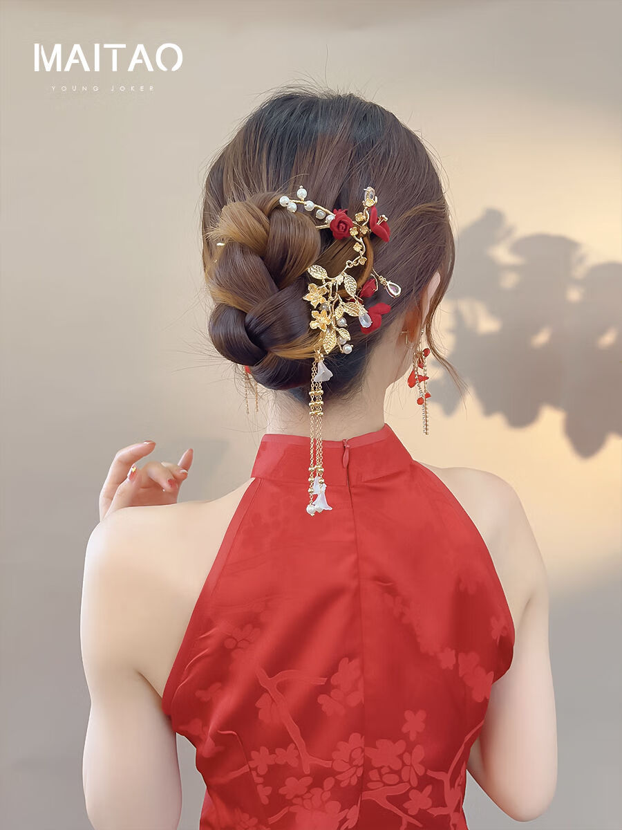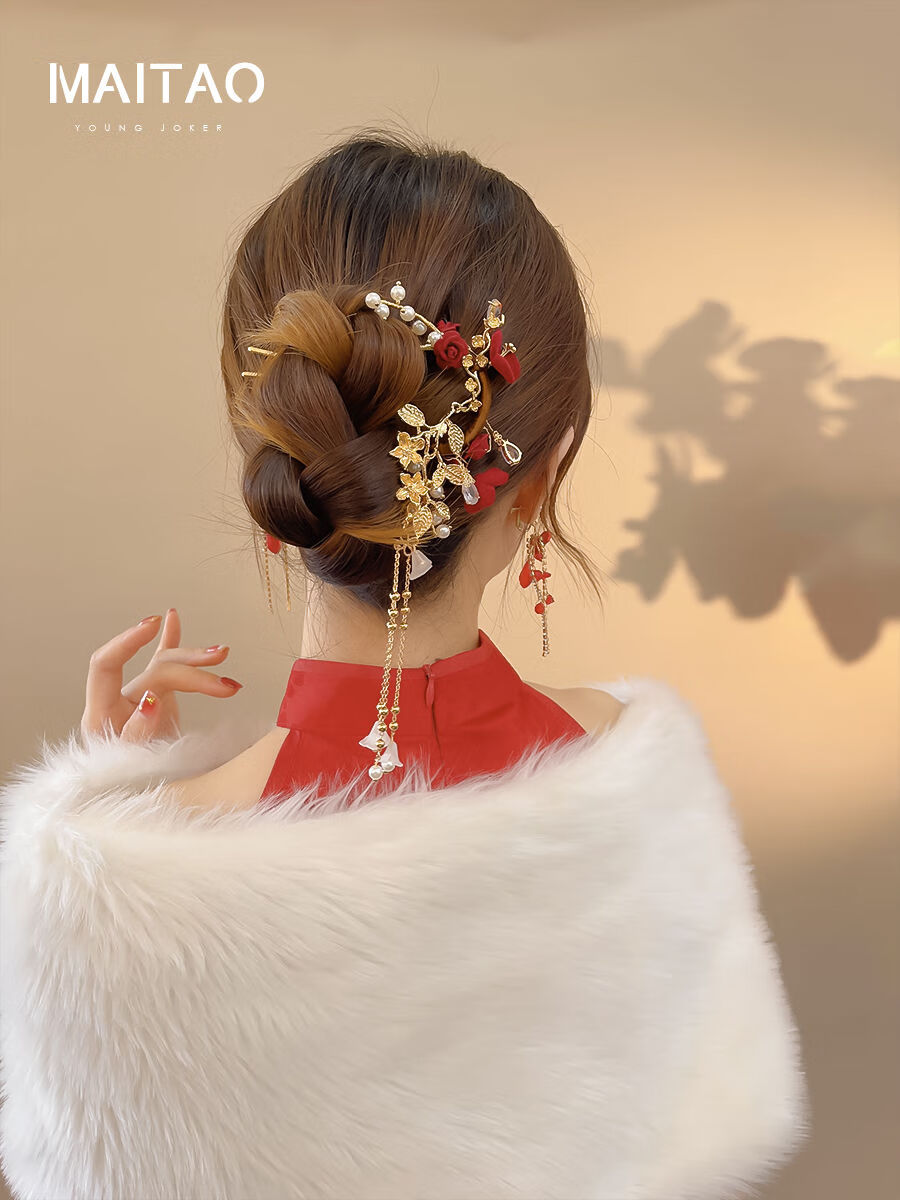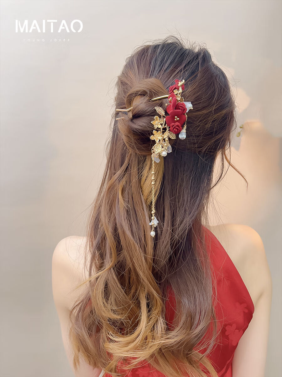 DYN Festive Red Rose Tassel Hairpin High-end U-shaped Hairpin Women's Ancient Style Cheongsam Bridal Toast Wear Headdress Red Wedding Hairpin