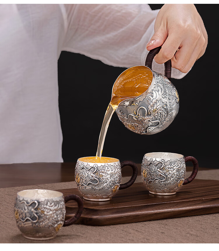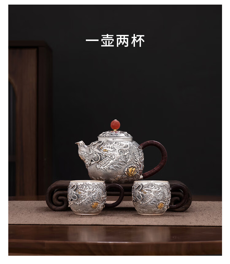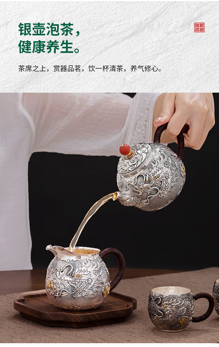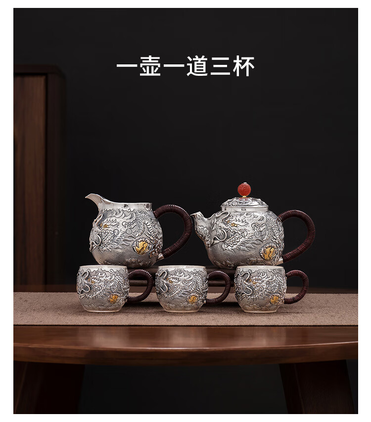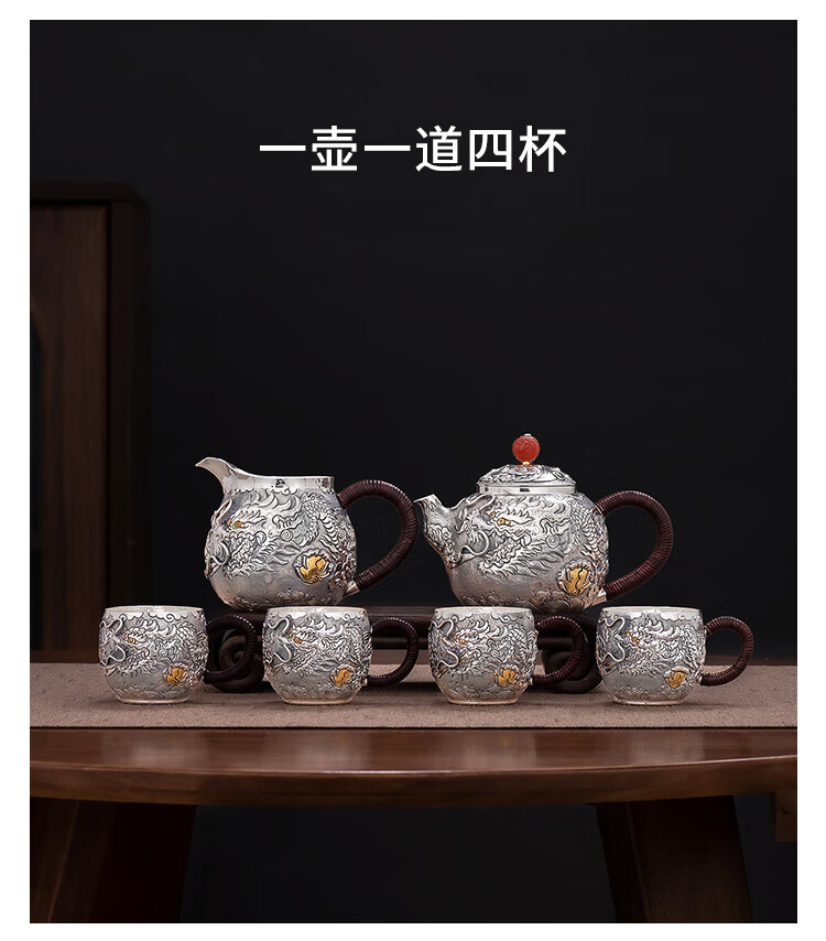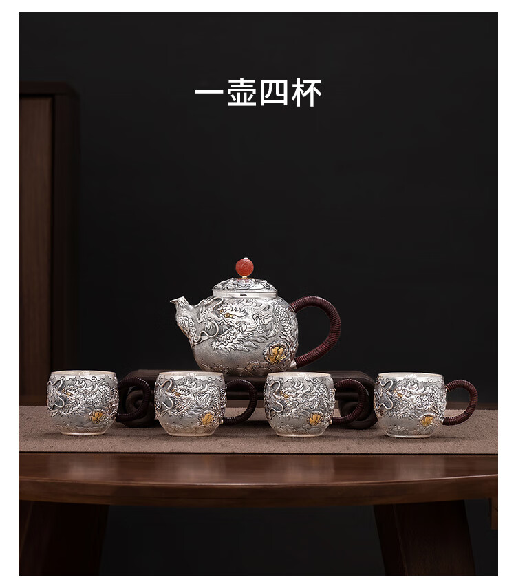 Silver Age Silver Tea Set 999 Pure Silver Set Tenglong Spit Pearl Gift Seiko Embossed Pure Silver Tea Set 1 Pot 3 Cups Approximately 544 Grams