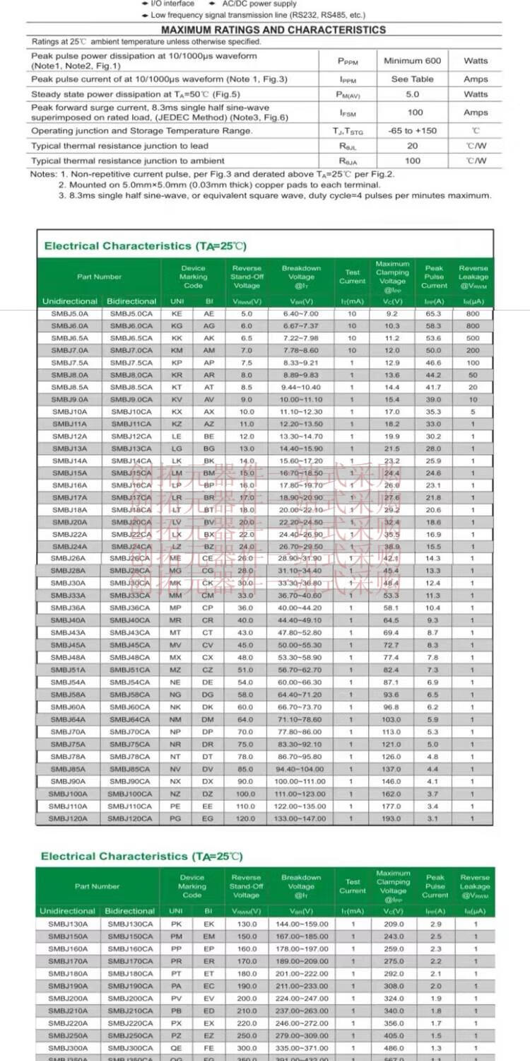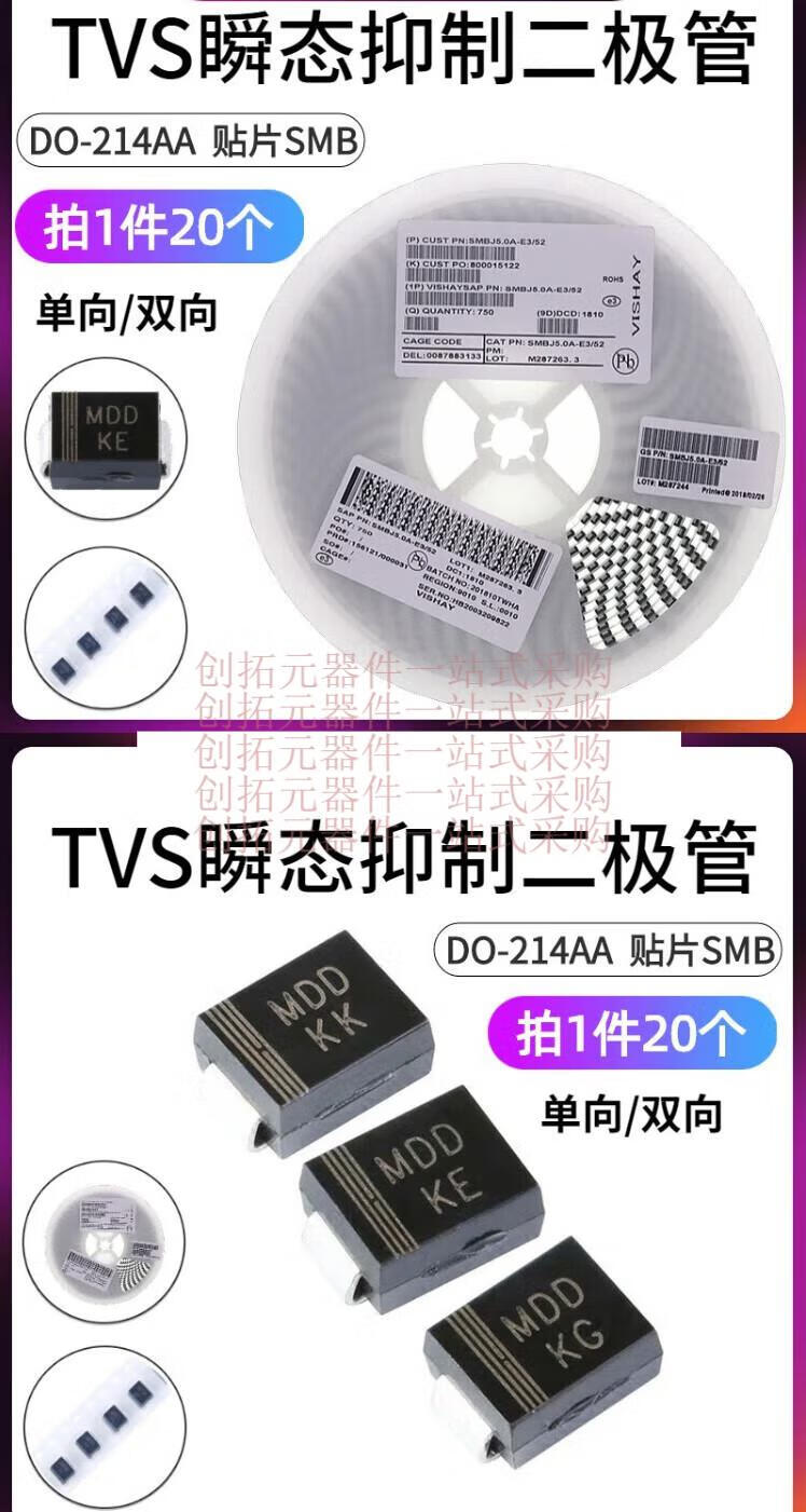 SMBJ7.0CA-E3/52 TVS transient suppression diode DO-214AA SMBJ7.0A one-way/bi-directional SMBJ7.0A one-way 7V600 silk screen KM 20 pcs