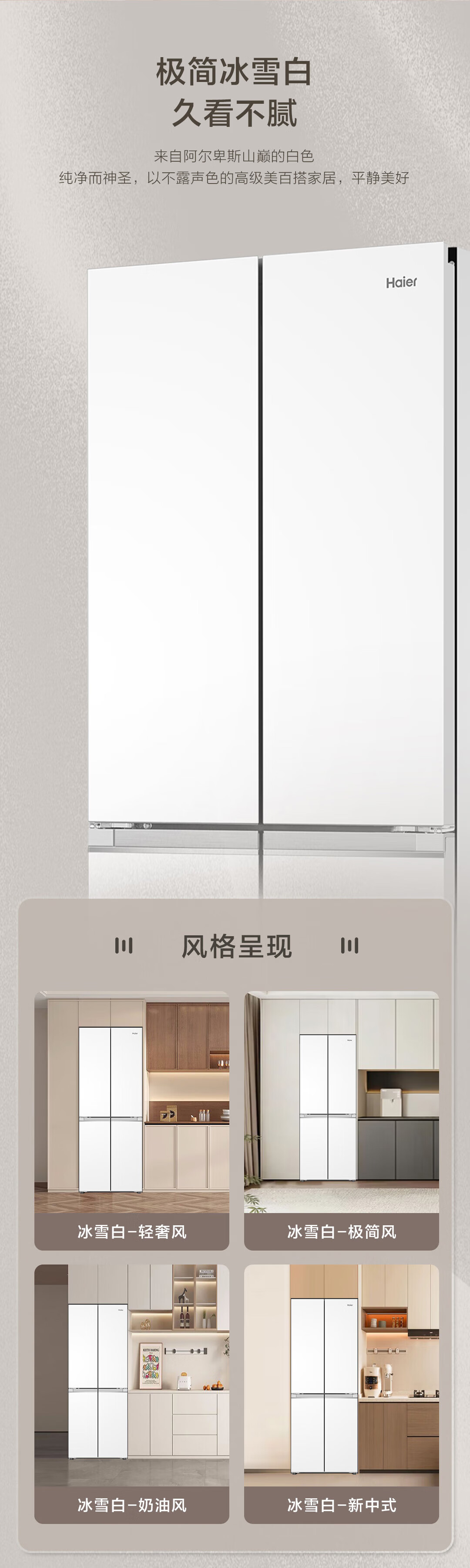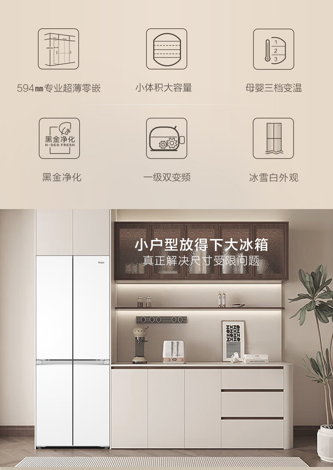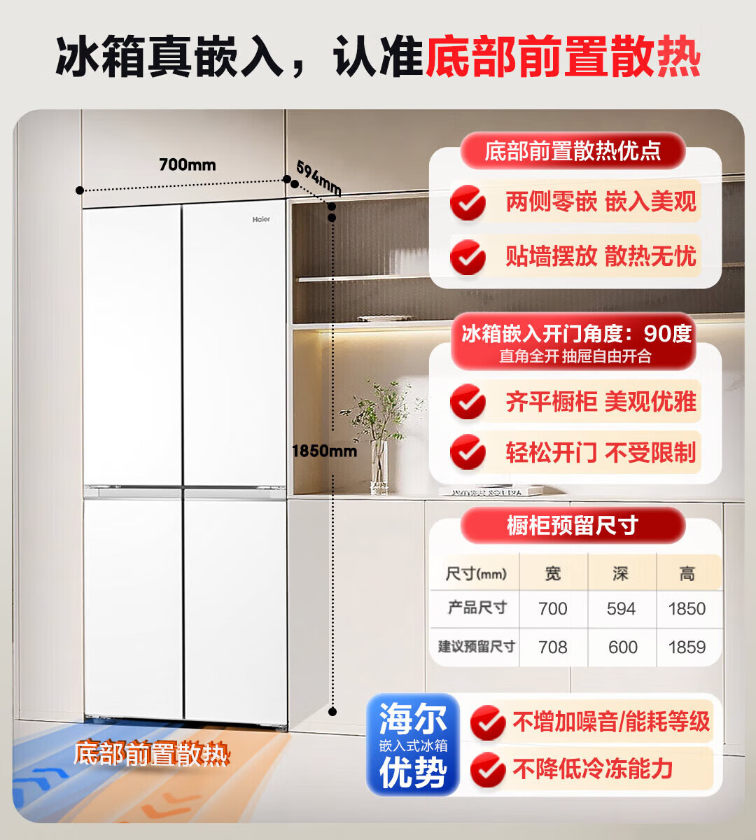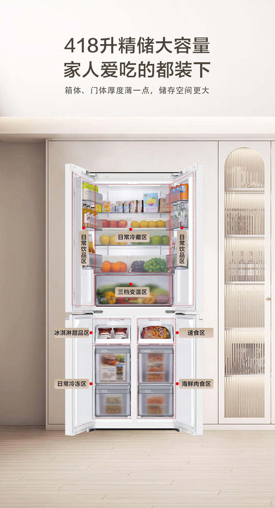 Haier Xiaohonghua series 418 liters 594mm professional ultra-thin and ultra-narrow zero-embedded cross T-type four-door household appliances small household large capacity refrigerator 70 wide | 594mm professional ultra-thin | 418 liters ice white