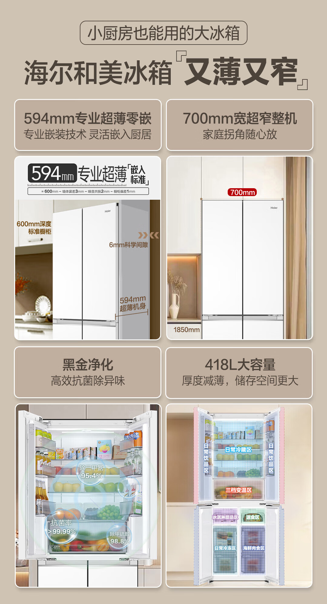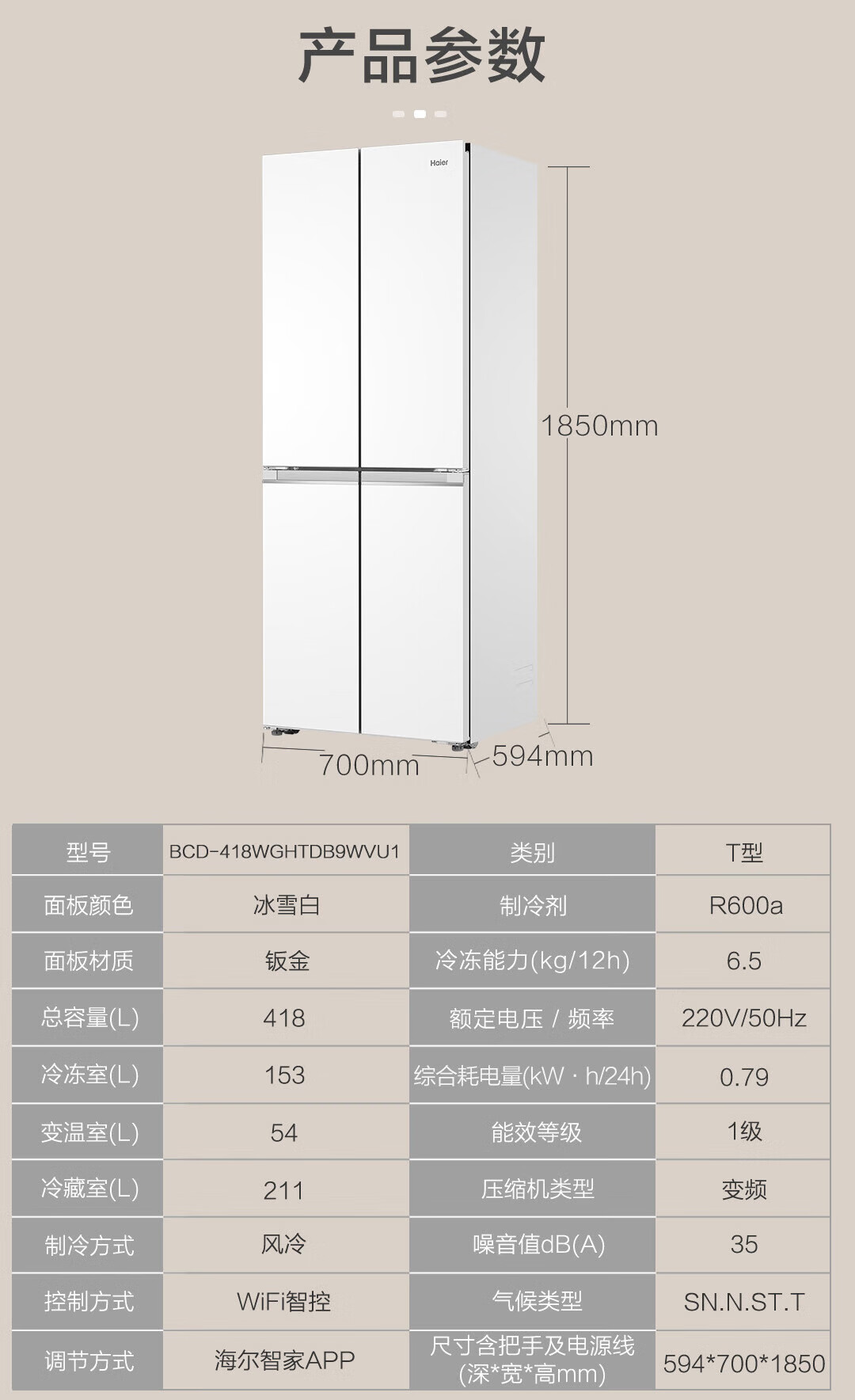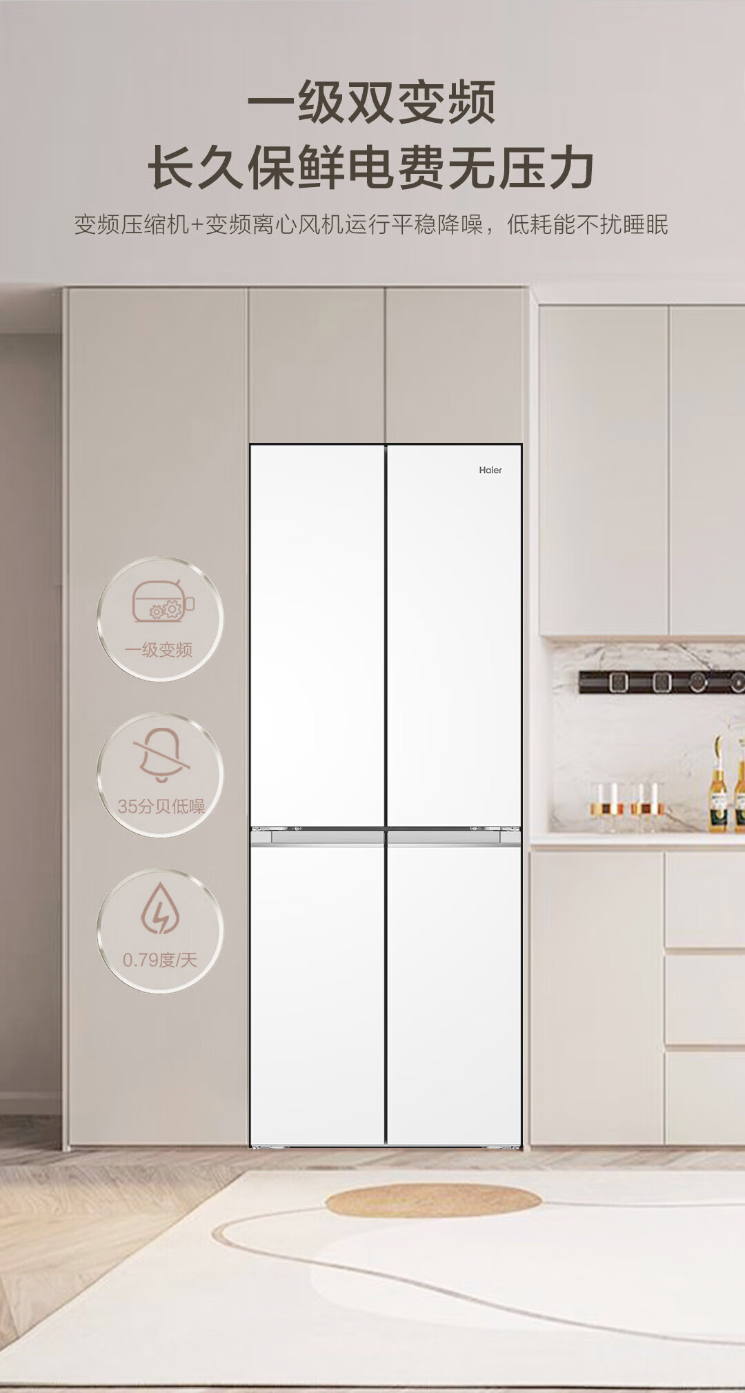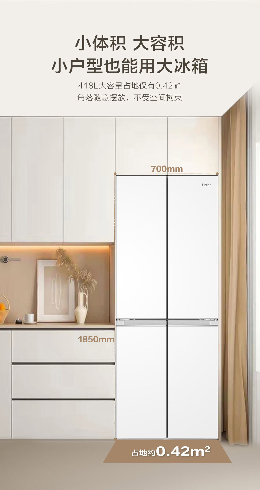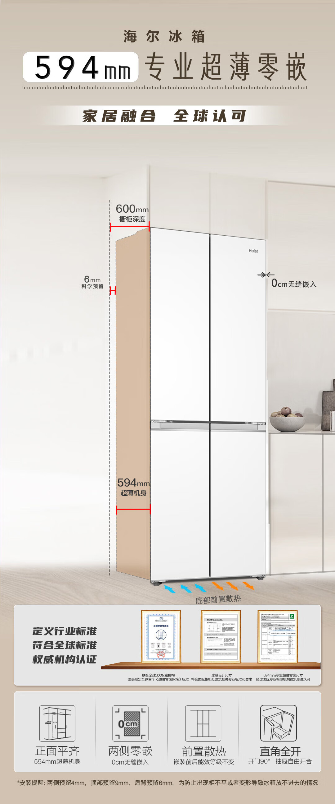 Haier Xiaohonghua series 418 liters 594mm professional ultra-thin and ultra-narrow zero-embedded cross T-type four-door household appliances small household large capacity refrigerator 70 wide | 594mm professional ultra-thin | 418 liters ice white