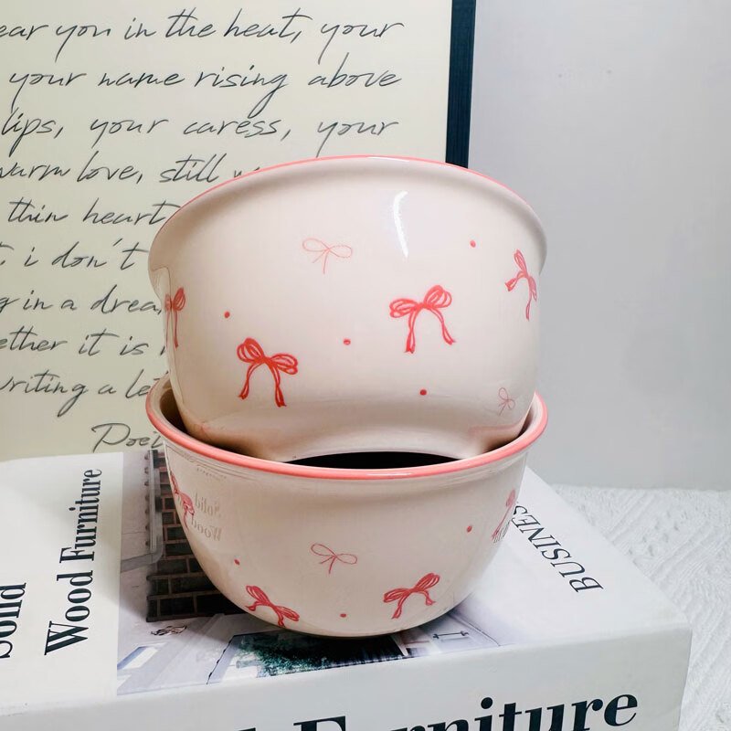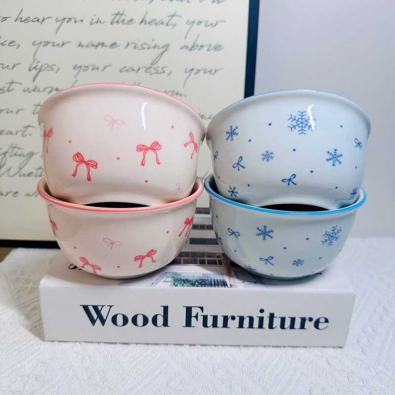 Pink and blue bow ceramic bowl home eating bowl ins high-looking underglaze color tableware dessert bowl soup bowl noodle bowl 1 bow 4.5-inch bowl
