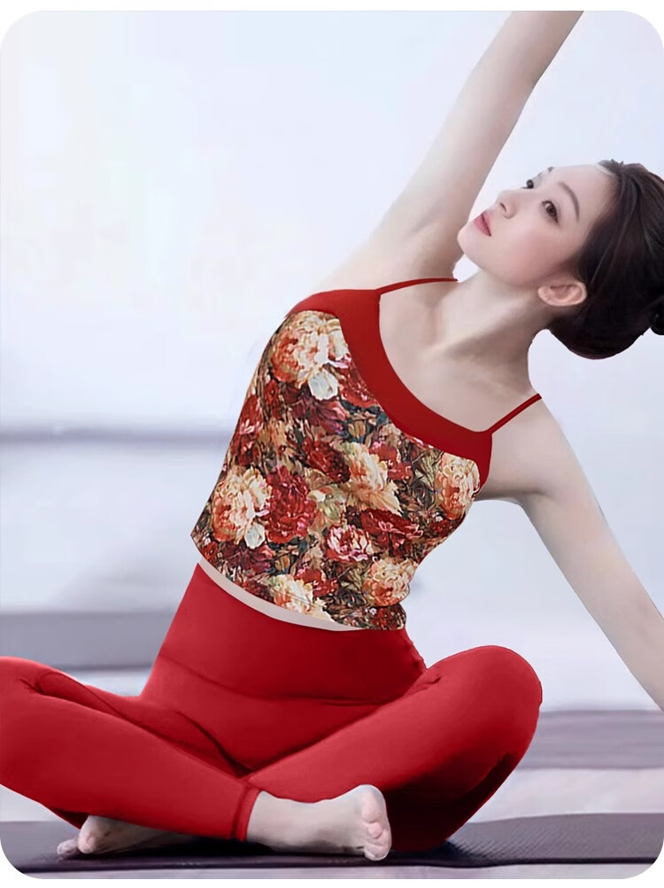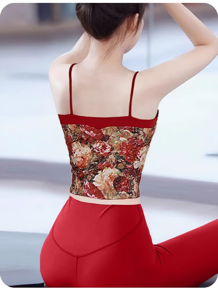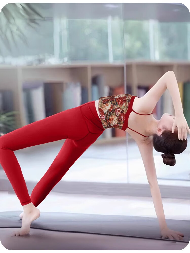 Double Show Printed Yoga Wear Vest Women's New National Style Beautiful Bra Strap Pad Pilates Red Sports Bra Fitness Bra Floral Top + Burgundy Pants Set L (110-120)