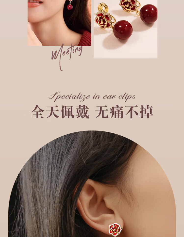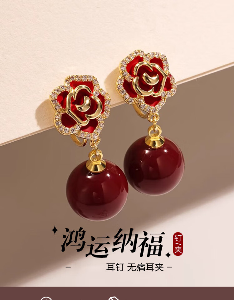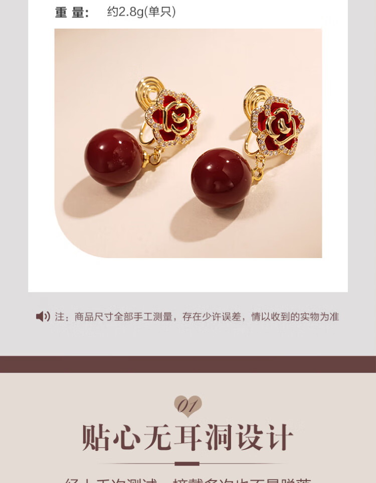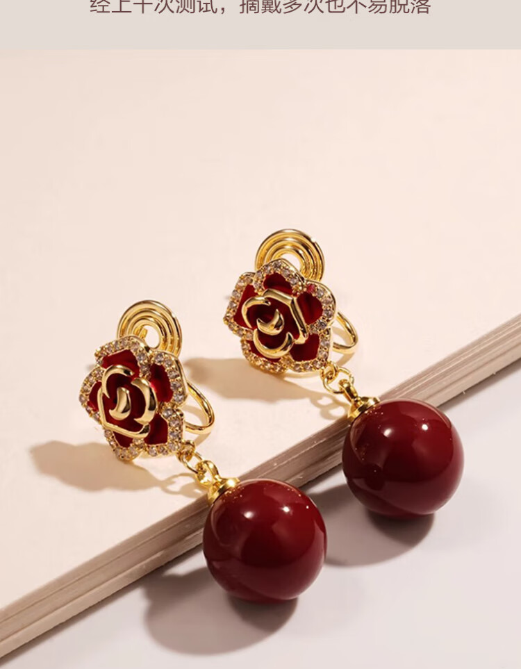 Core luxury red imitation pearl earrings, ear clips without piercing, women's small fragrance autumn and winter earrings, earrings, New Year festive commemorative earrings, a pair of ear clips (can be worn without piercing)