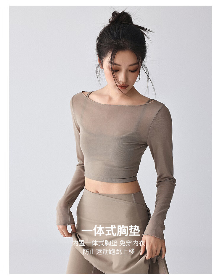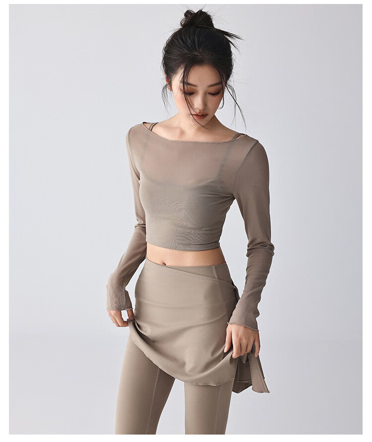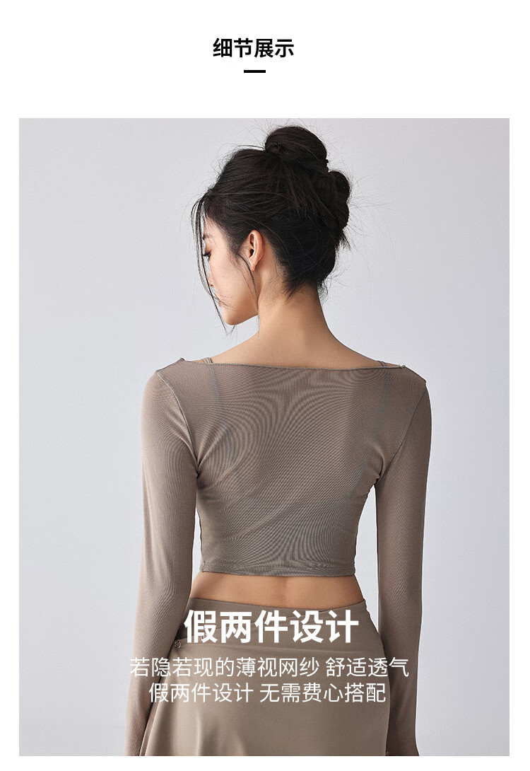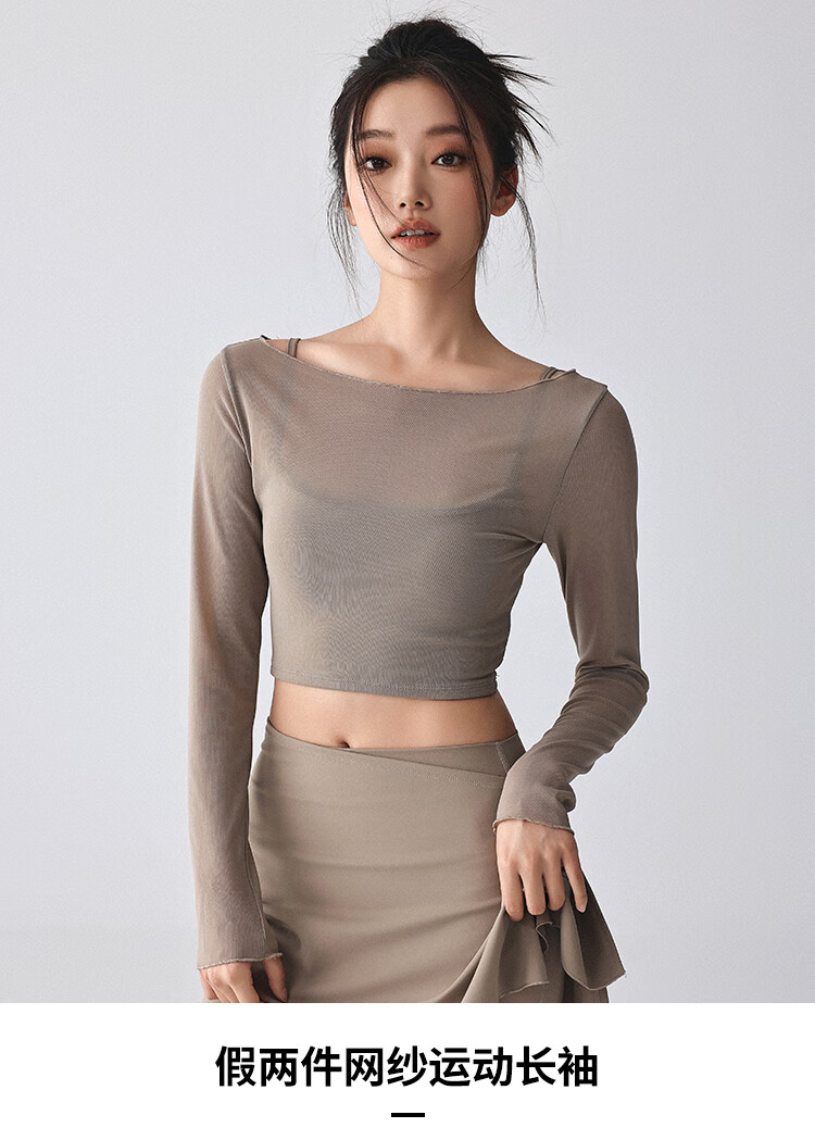 Yoga Girl Fake Two-piece Yoga Wear Long Sleeves with Padded Mesh Quick-Drying Pilates Fitness Wear Sports Top Almond M (95-115Jin Jin equals 0.5kg)