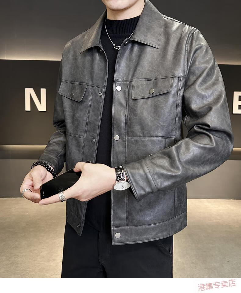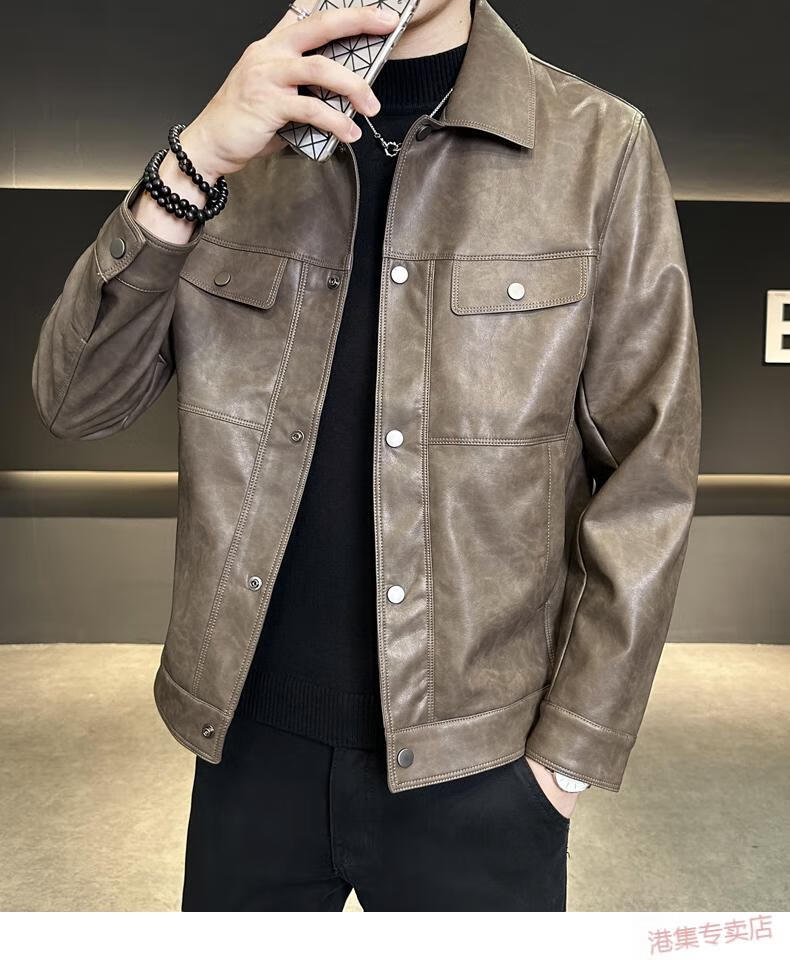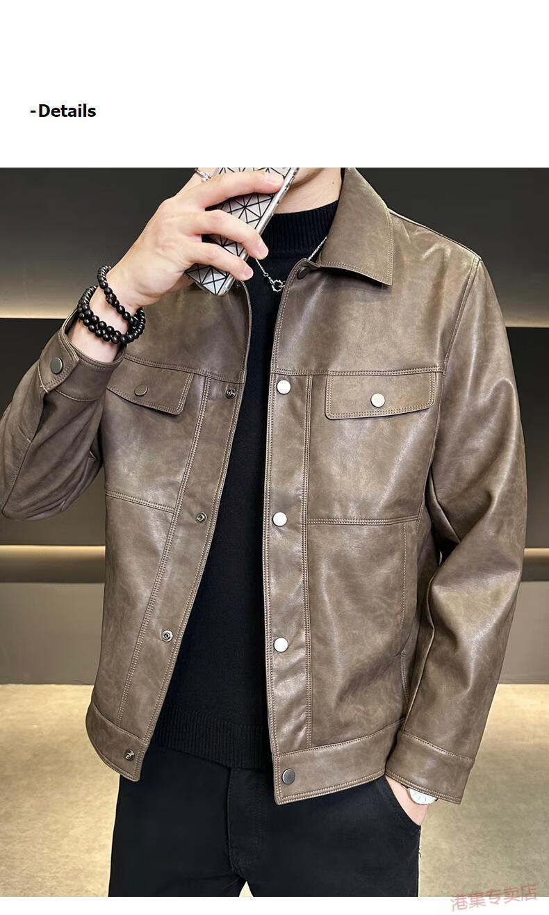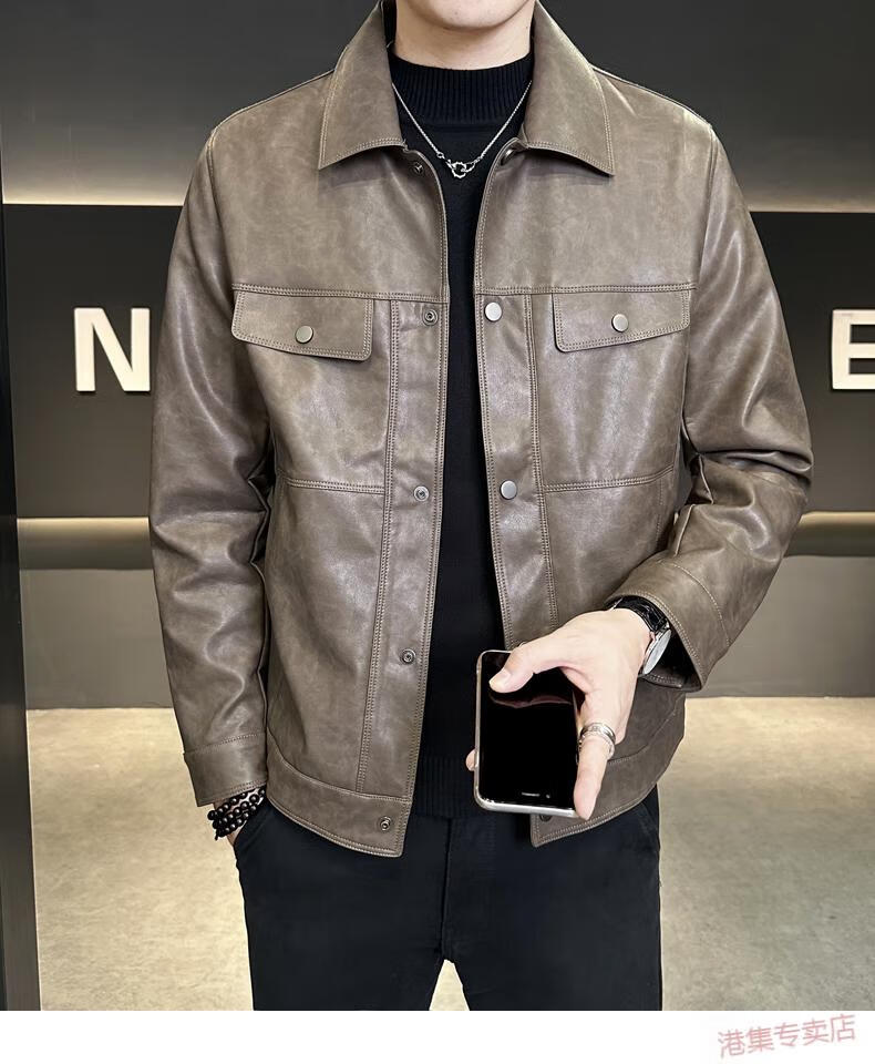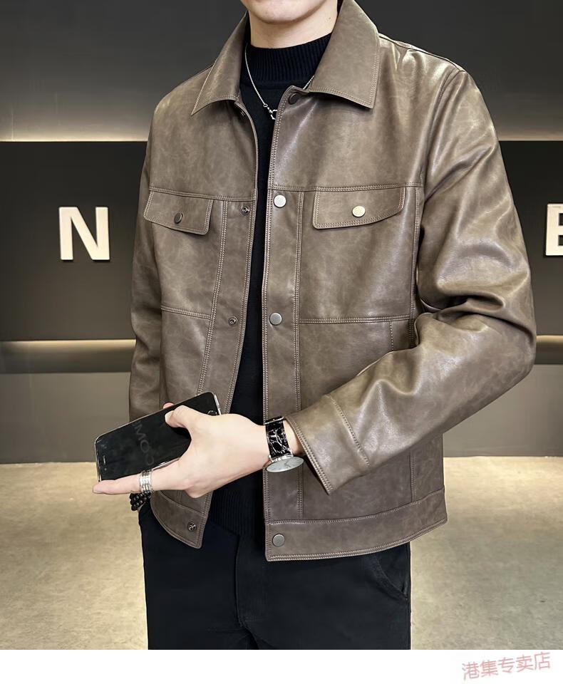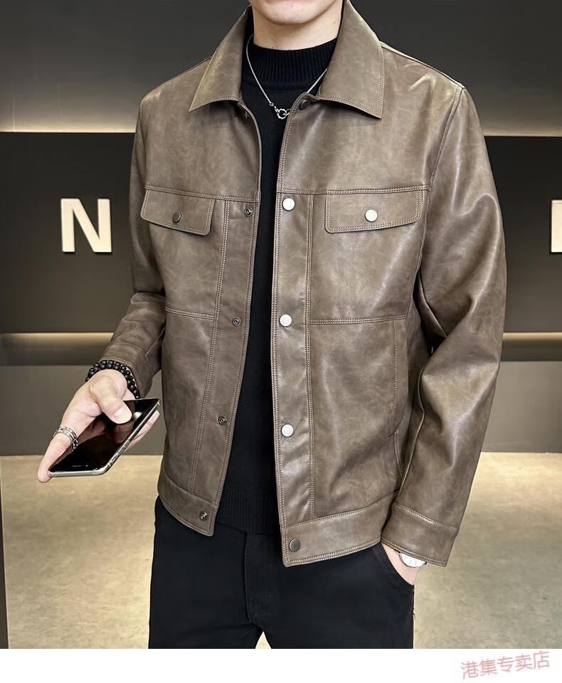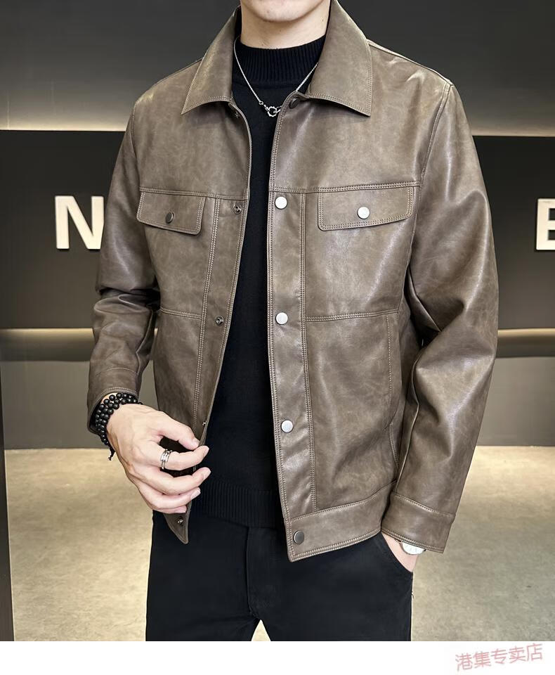 JEEP SPIRIT American retro pu leather jacket men's spring and autumn style multi-pocket motorcycle short style trendy handsome leather jacket coffee color M