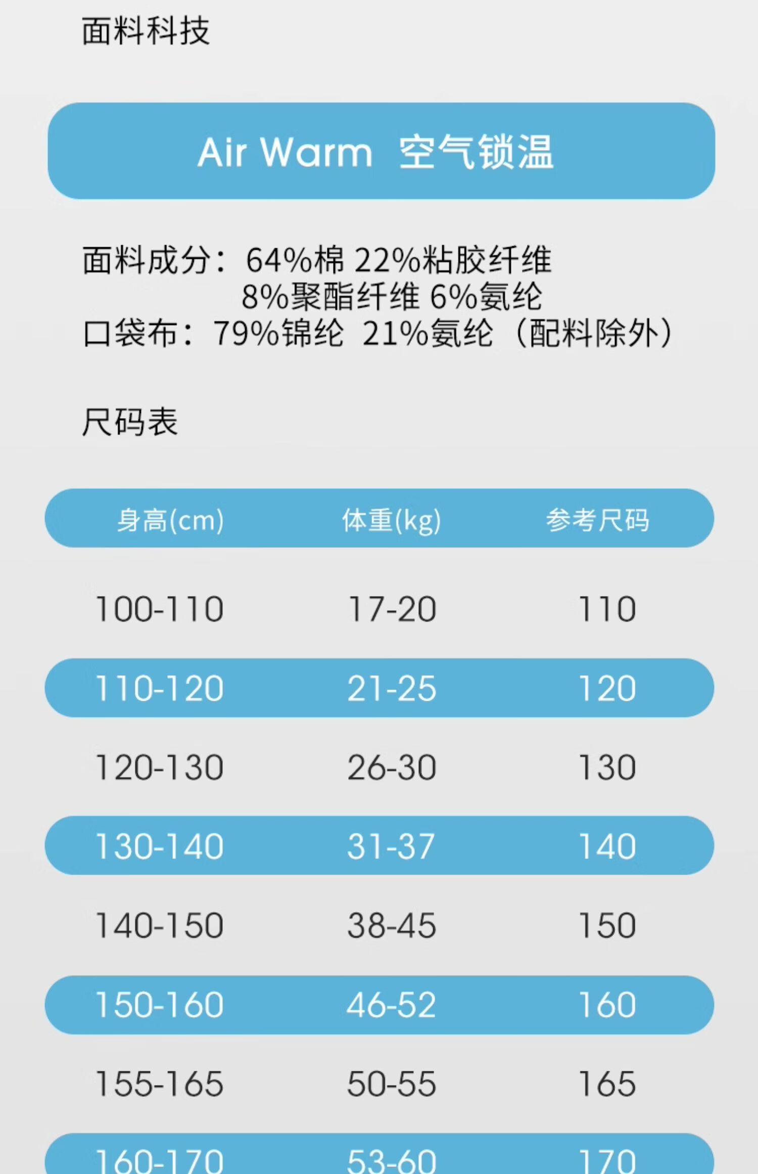 China (cm) 160-165/84-86 165-170 / 88-90 167-172 / 92-96 168-173 / 98-102 170-176 / 106-110