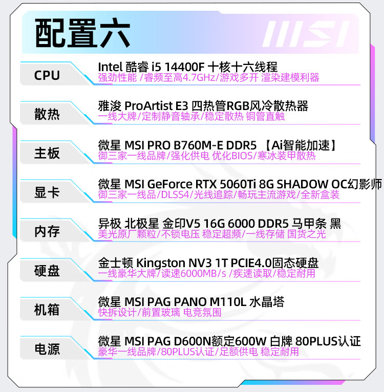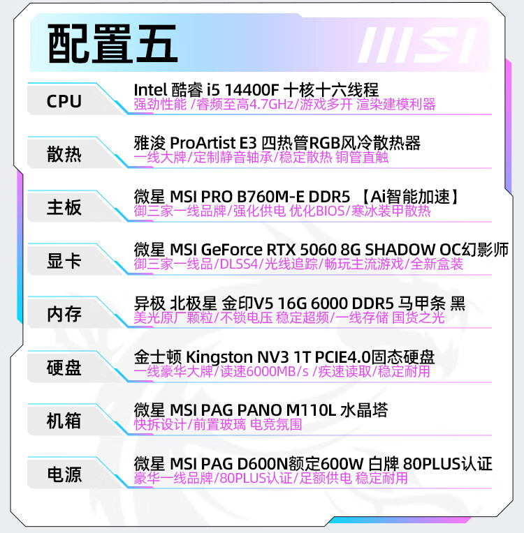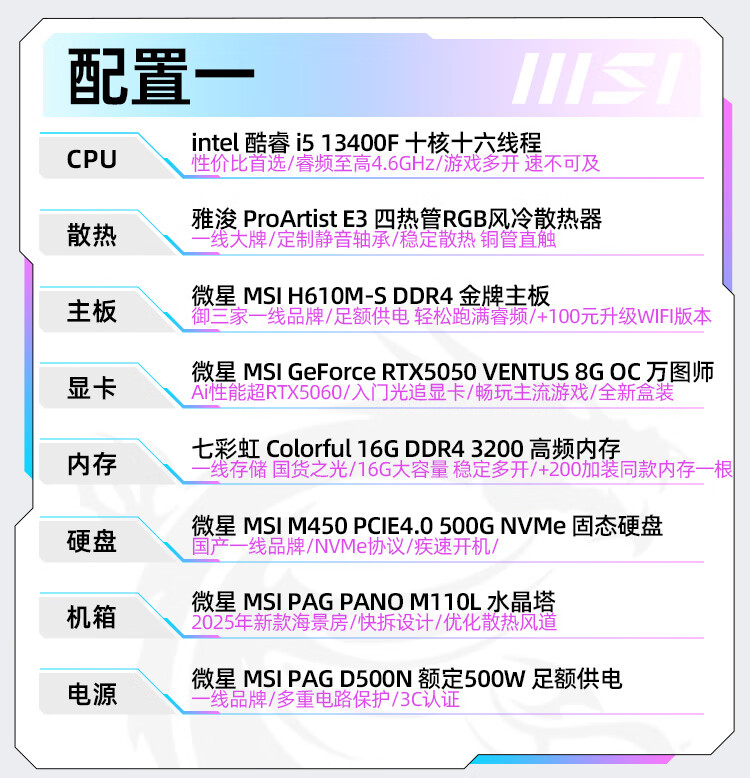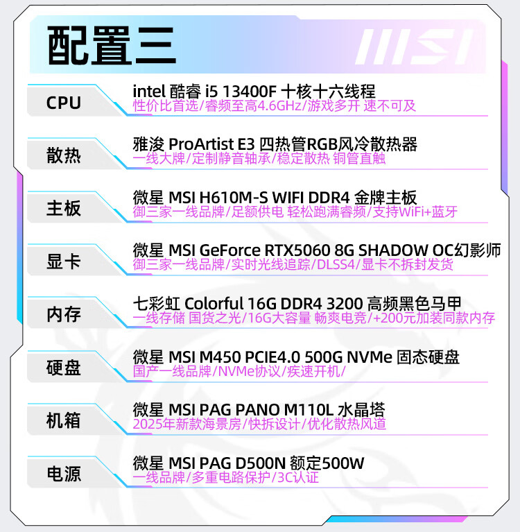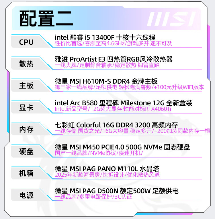 MSI Family Bucket 13th Generation i5 13400F/RTX5060Ti Black Myth Wukong Game Designer Desktop Ai Design Rendering Host DIY E-Sports Assembly Computer Complete Machine Configuration Two i5 13400F+B580 12G