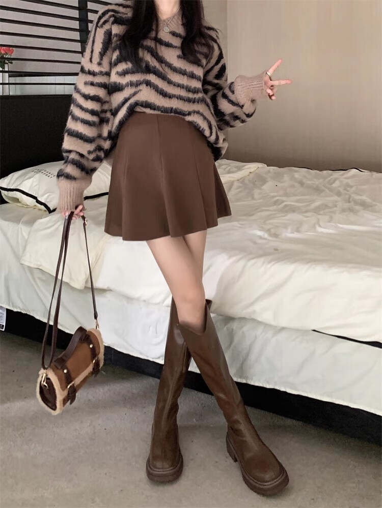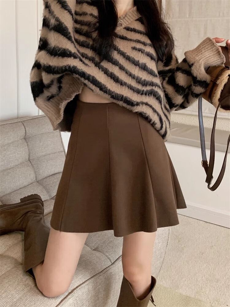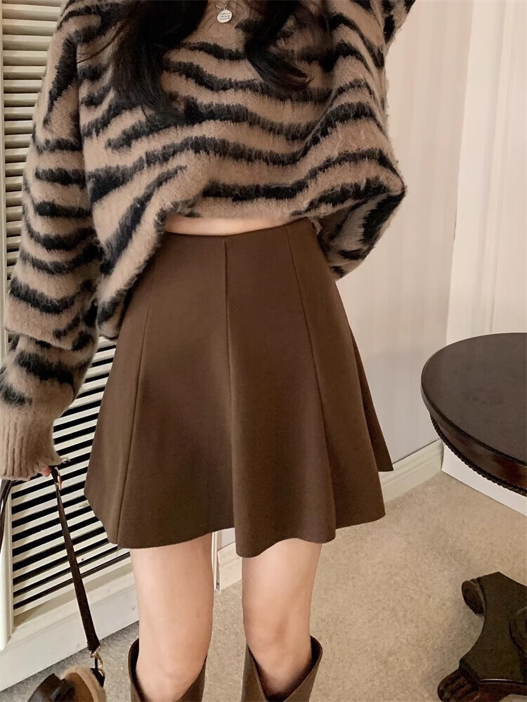 Jin Jin is equal to 0.5 kg. Muta size coffee-colored woolen skirt for women in autumn and winter 2025. A-line short skirt that covers the crotch and hips. Umbrella skirt. High-waisted pleated skirt. Coffee-colored woolen skirt is recommended to be 110 Jin. Jin is equal to within 0.5 kg.